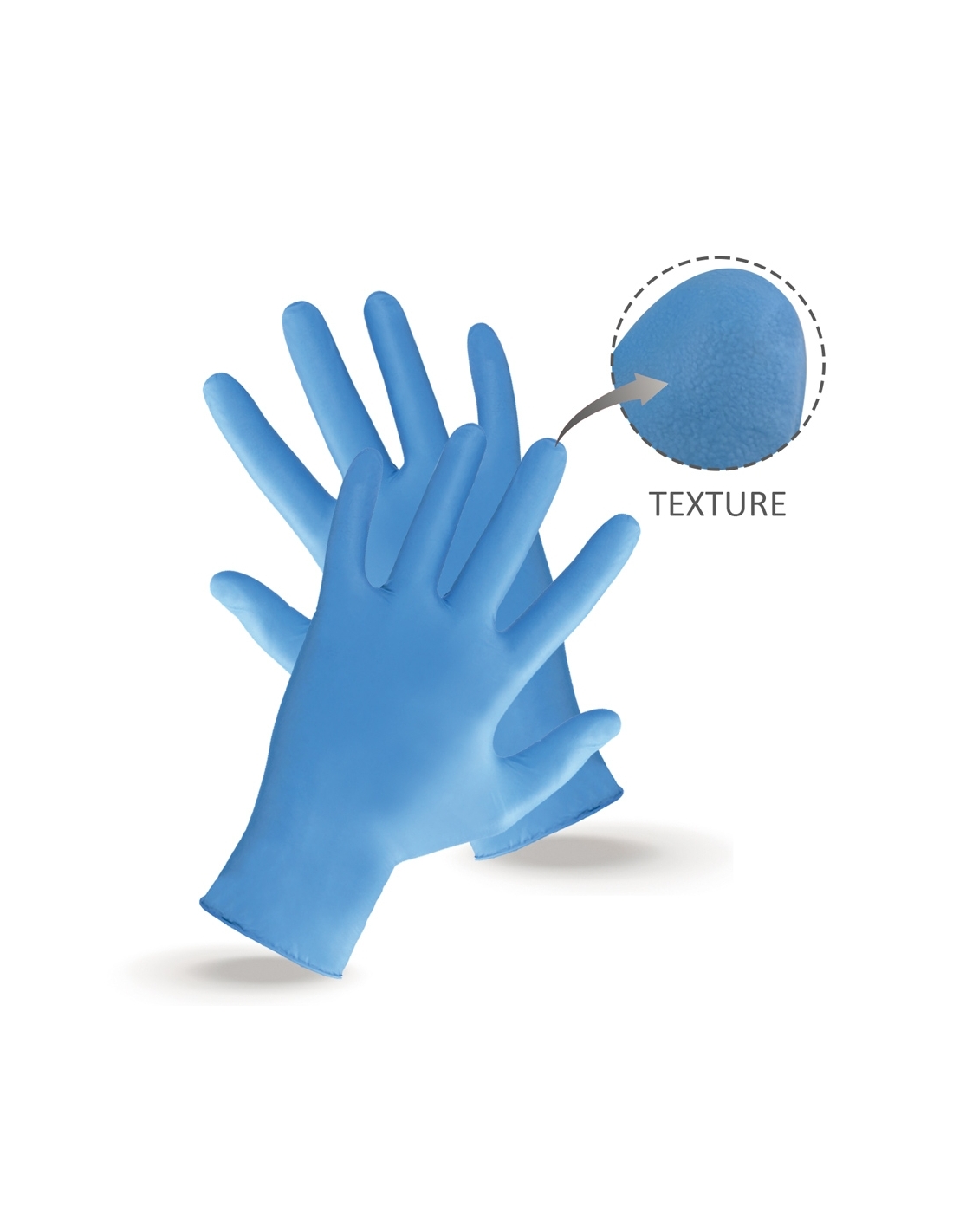 Guanto monouso in nitrile blu 240 mm senza polvere, ideale per ambienti professionali dove igiene e sicurezza sono fondamentali. La superficie micro ruvida e la texture sulle dita garantiscono una presa sicura. Realizzato con materiale ad alta resistenza. Misure: S - M - L - XL.