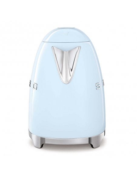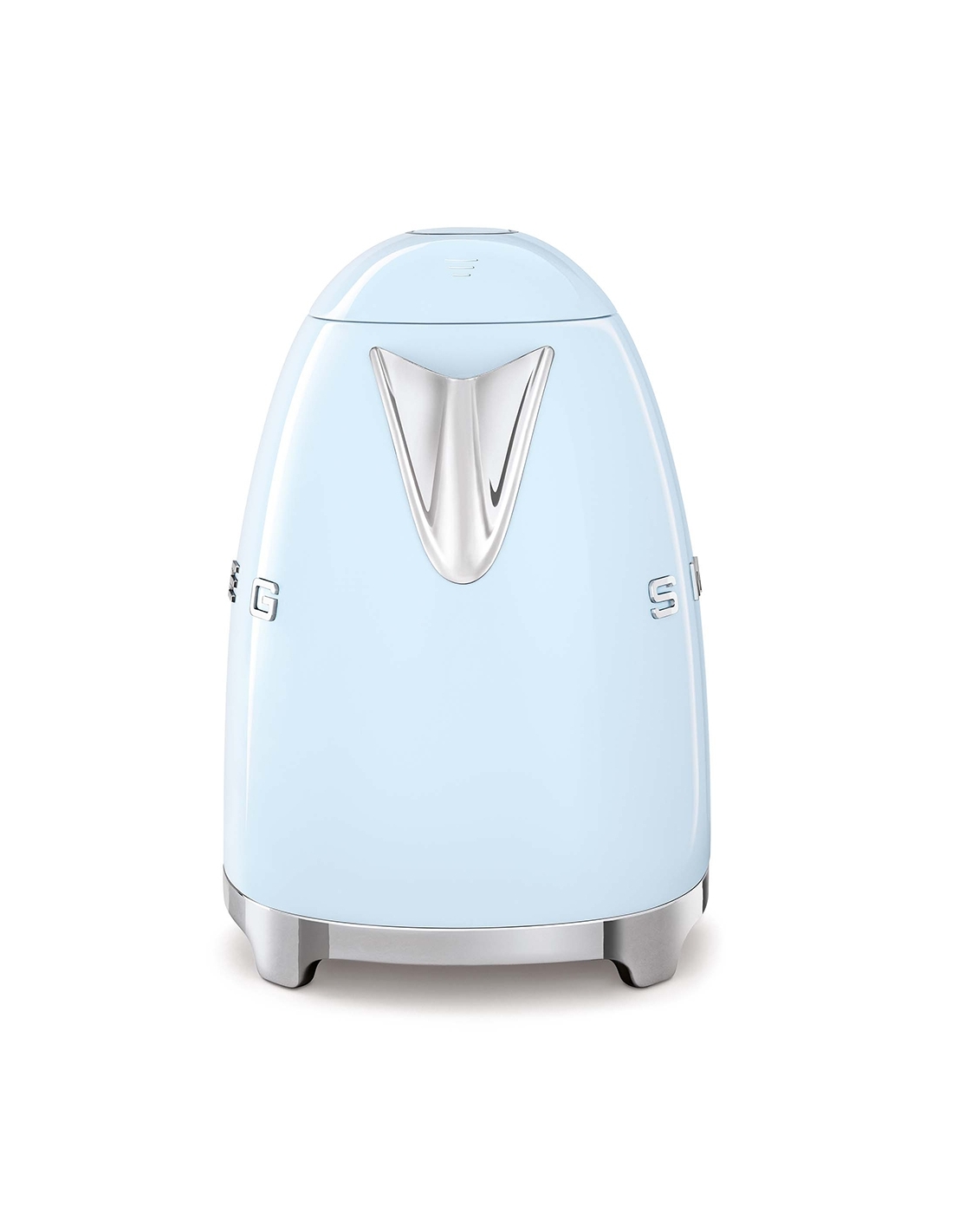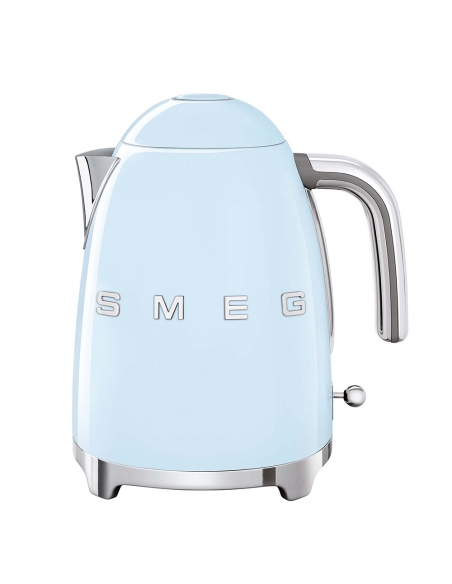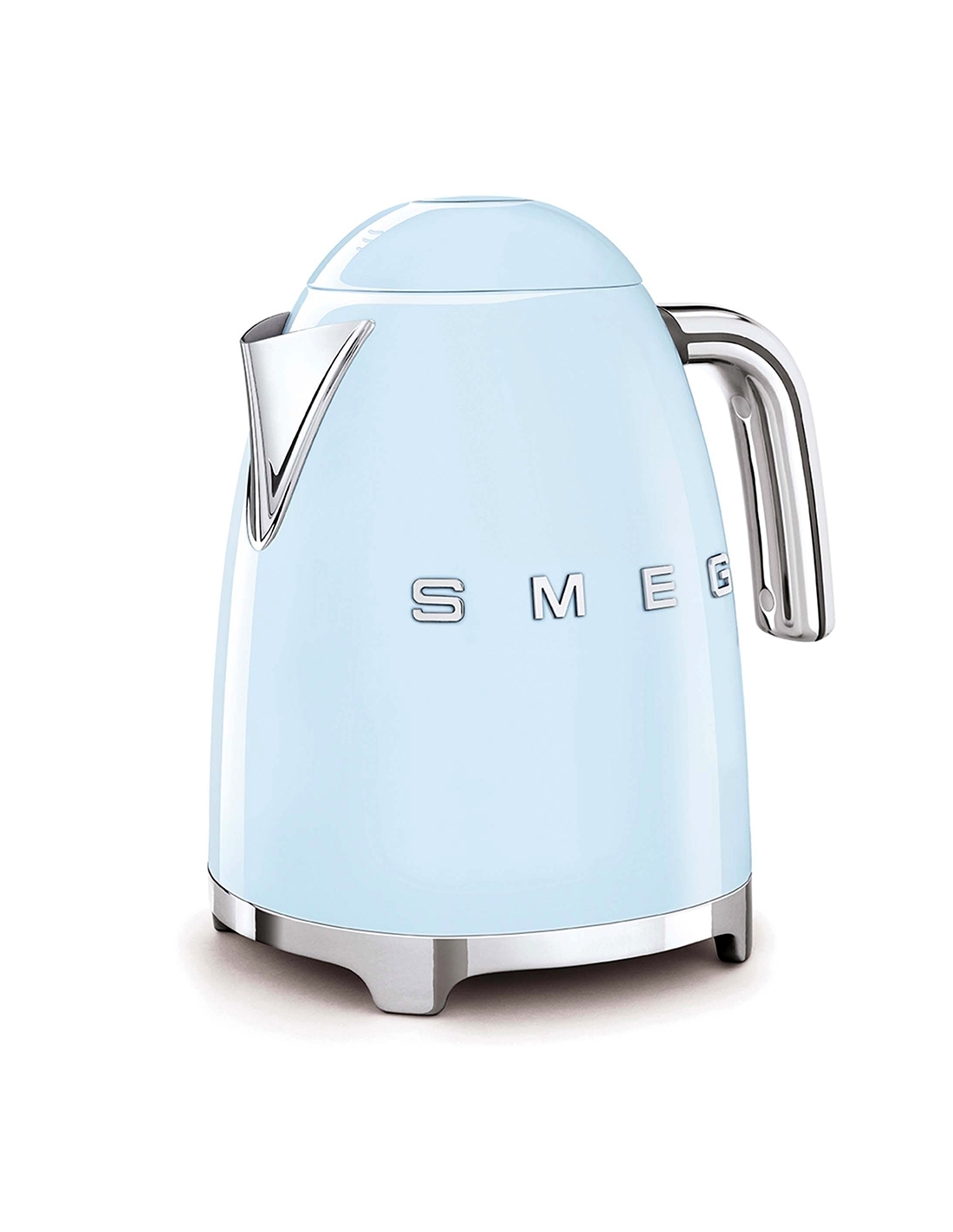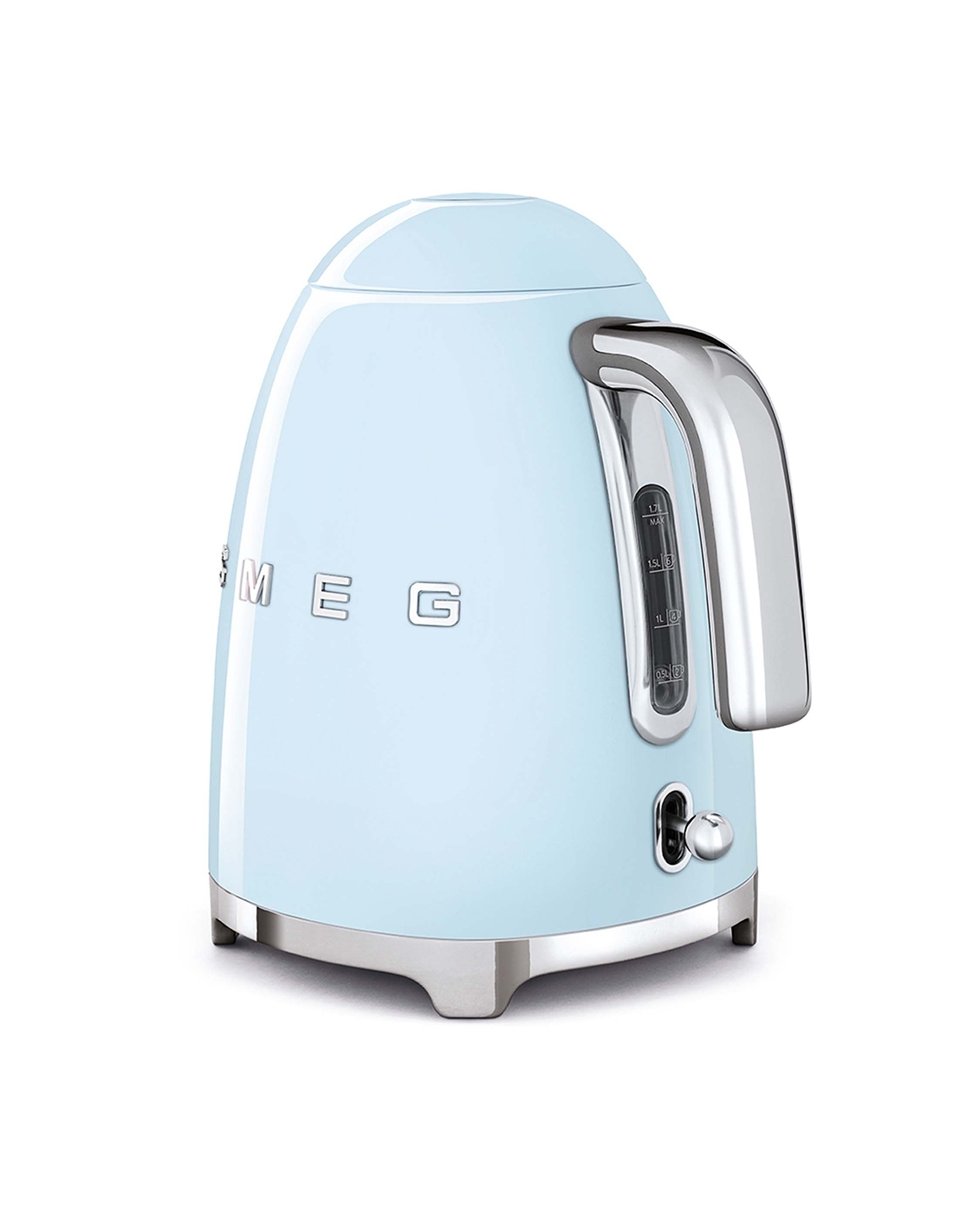 Bollitore 50’ Style azzurro lucido con corpo e coperchio in acciaio inox, base e maniglia in plastica, beccuccio in acciaio lucido. Apertura soft opening. Capacità 1,7 lt / 7 tazze. Autospegnimento di sicurezza a 100°. Base antiscivolo con connessione a 360 °.