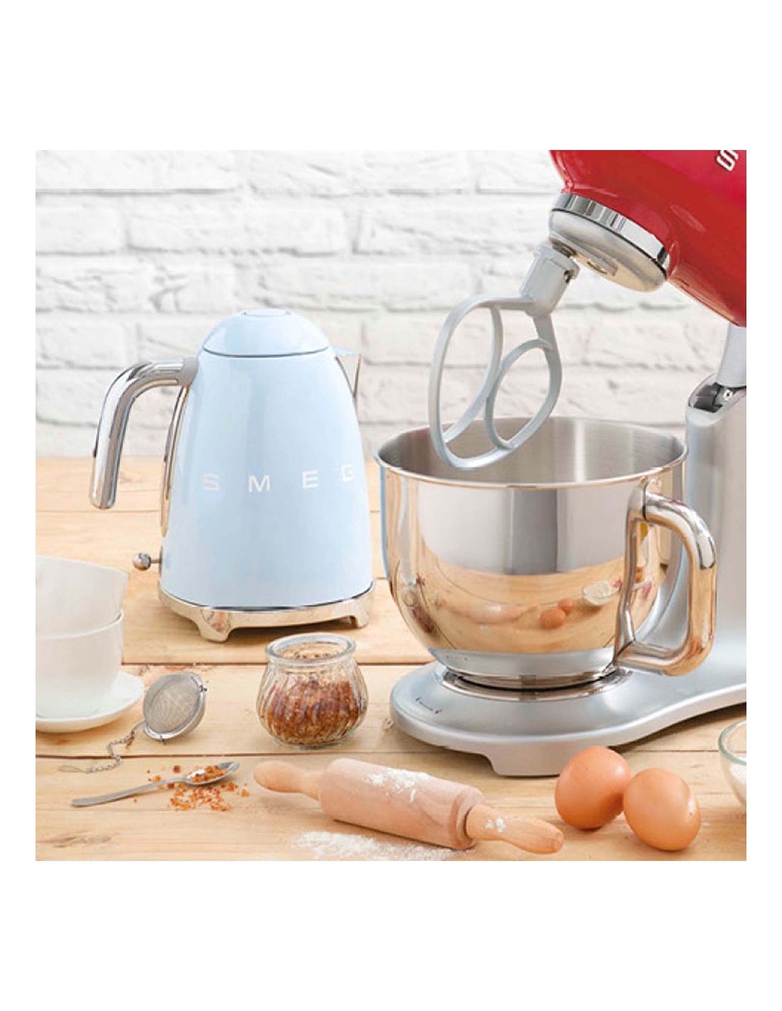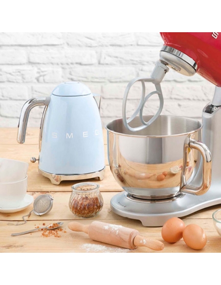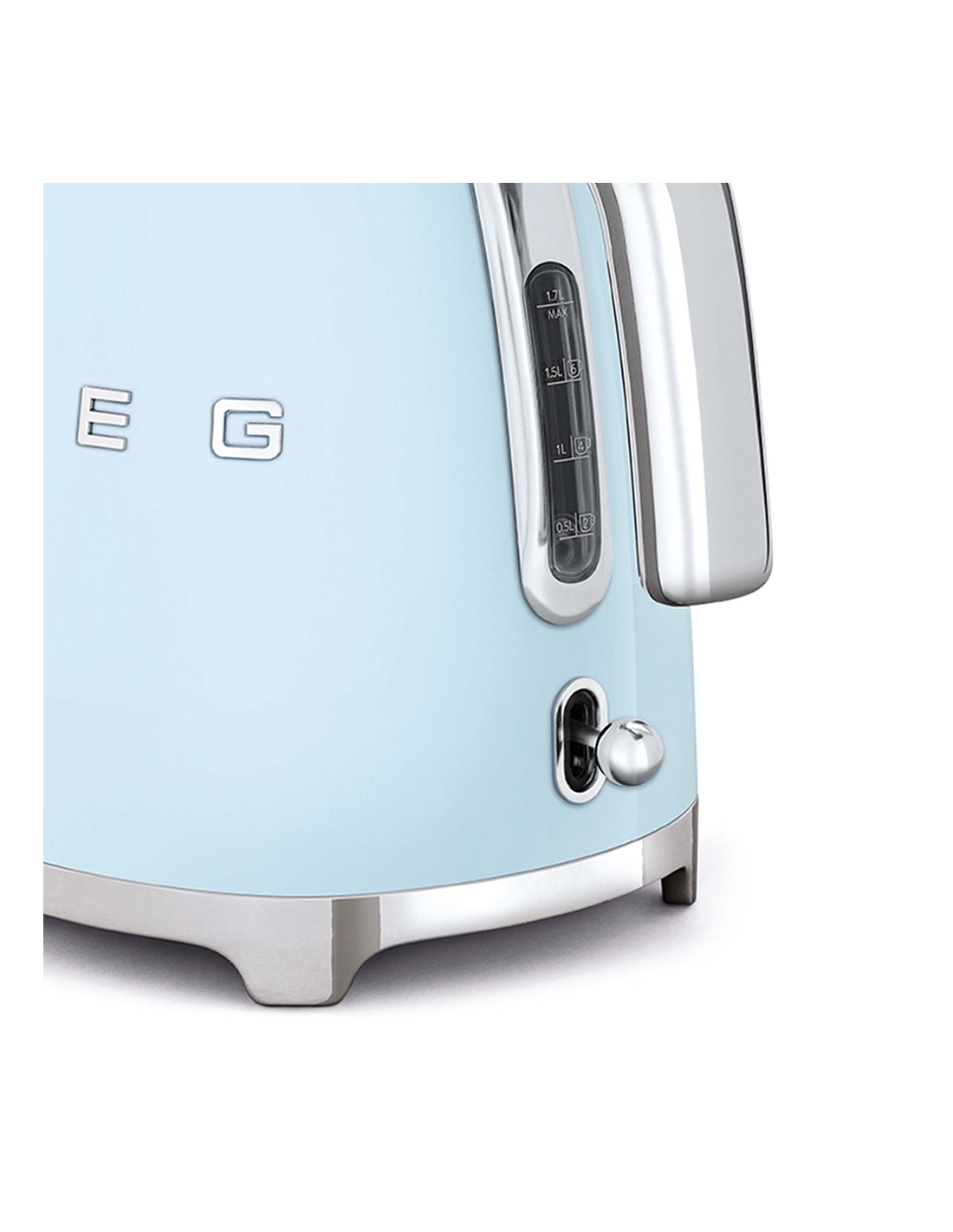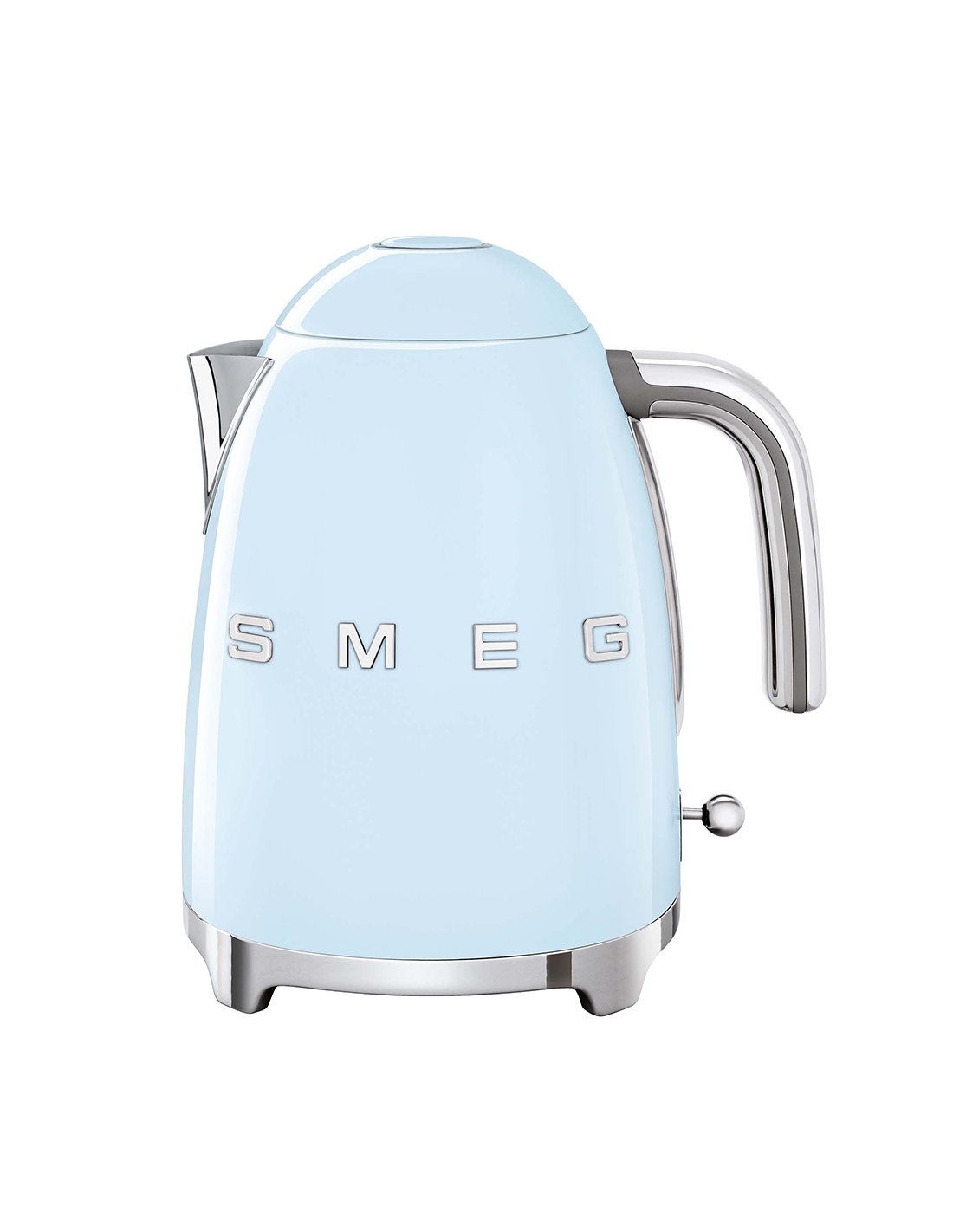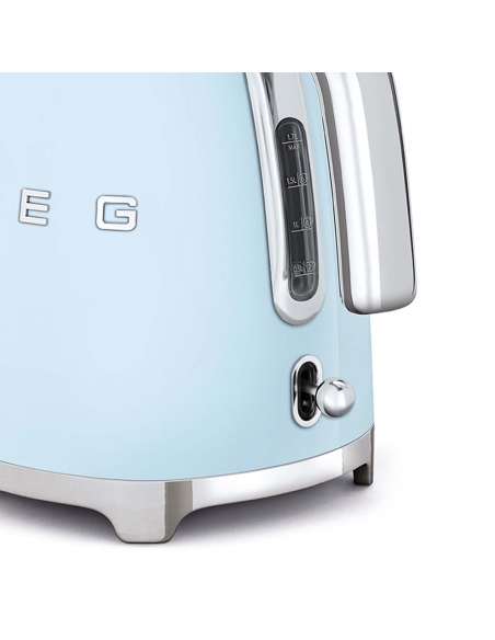 Bollitore 50’ Style azzurro lucido con corpo e coperchio in acciaio inox, base e maniglia in plastica, beccuccio in acciaio lucido. Apertura soft opening. Capacità 1,7 lt / 7 tazze. Autospegnimento di sicurezza a 100°. Base antiscivolo con connessione a 360 °.