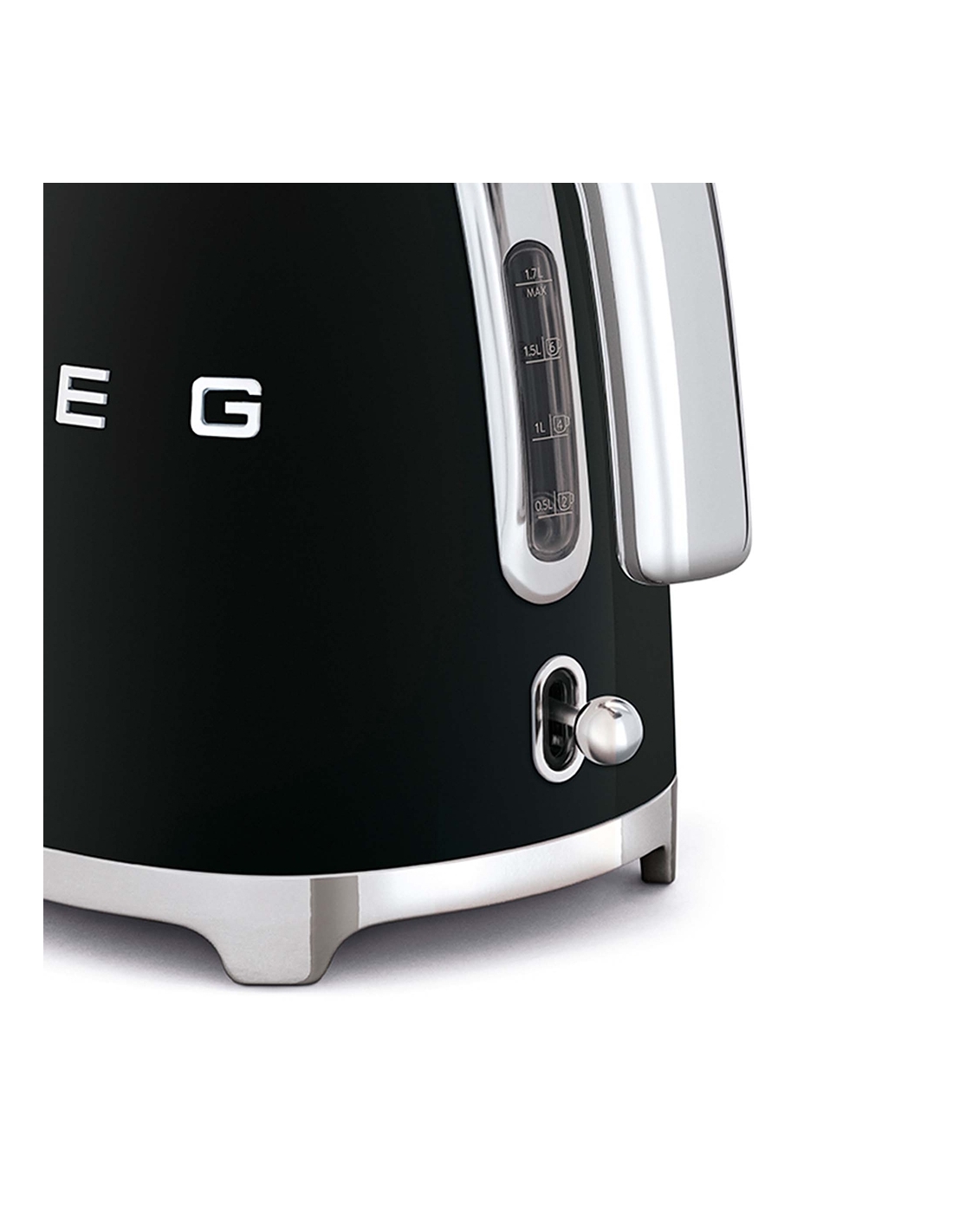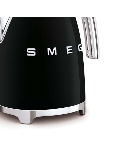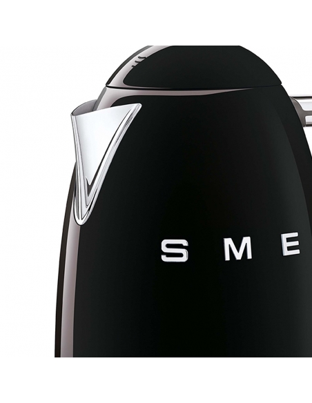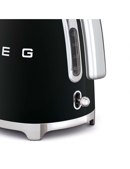 Bollitore 50’ Style nero lucido con corpo e coperchio in acciaio inox, base e maniglia in plastica, beccuccio in acciaio lucido. Apertura soft opening. Capacità 1,7 lt / 7 tazze. Autospegnimento di sicurezza a 100°. Base antiscivolo con connessione a 360 °.