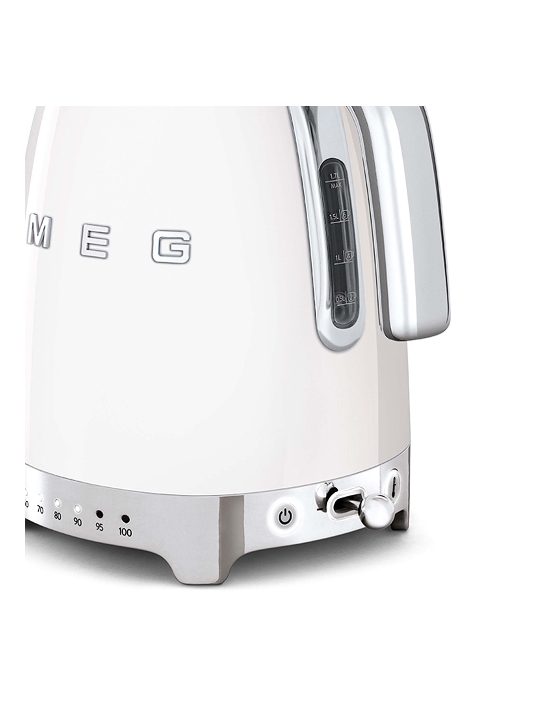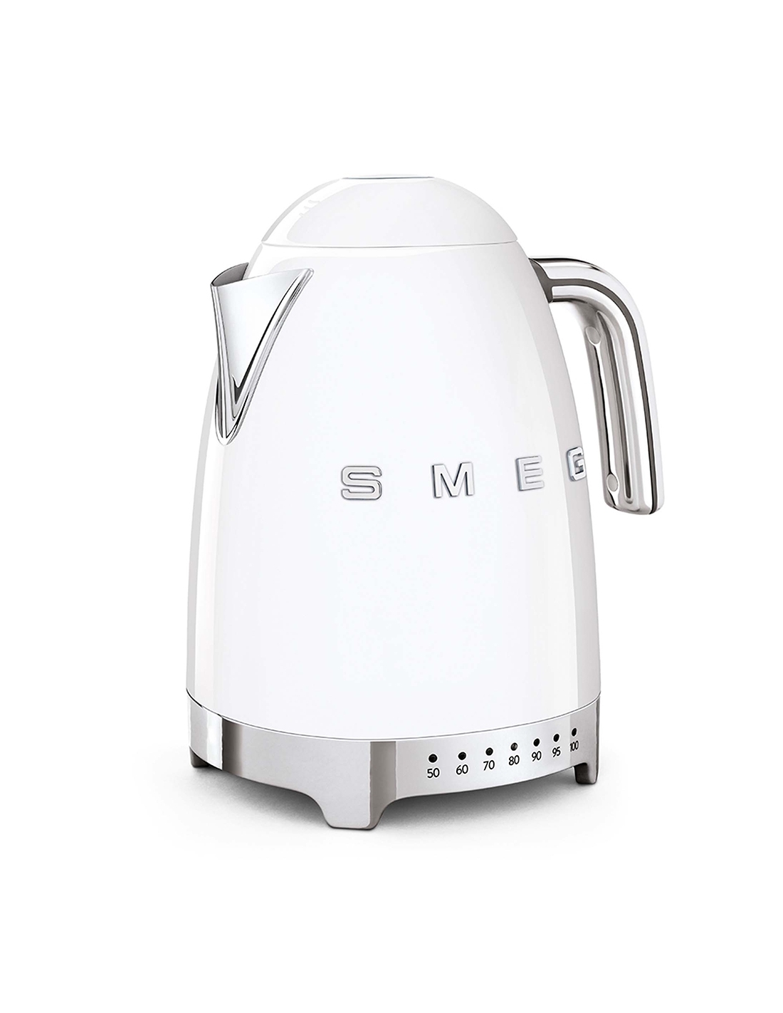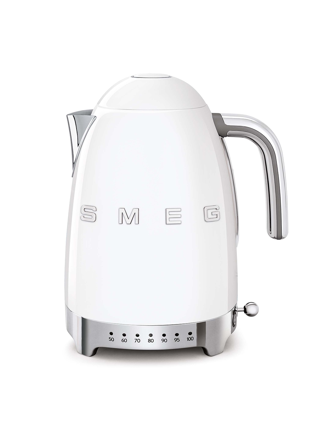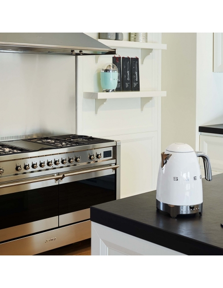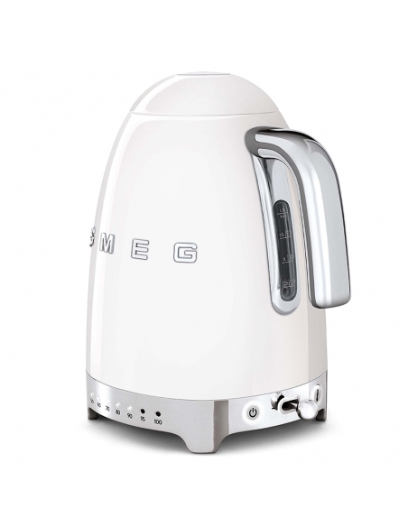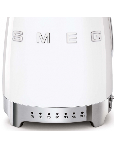 Bollitore 50’ Style bianco lucido a temperatura variabile con corpo e coperchio in acciaio inox, base e maniglia in plastica, beccuccio in acciaio lucido. Apertura soft opening. Capacità 1,7 lt / 7 tazze. Autospegnimento di sicurezza a temperatura raggiunta. Regolabile su vari livelli di temperatura da 50° a 100°. Base antiscivolo.
