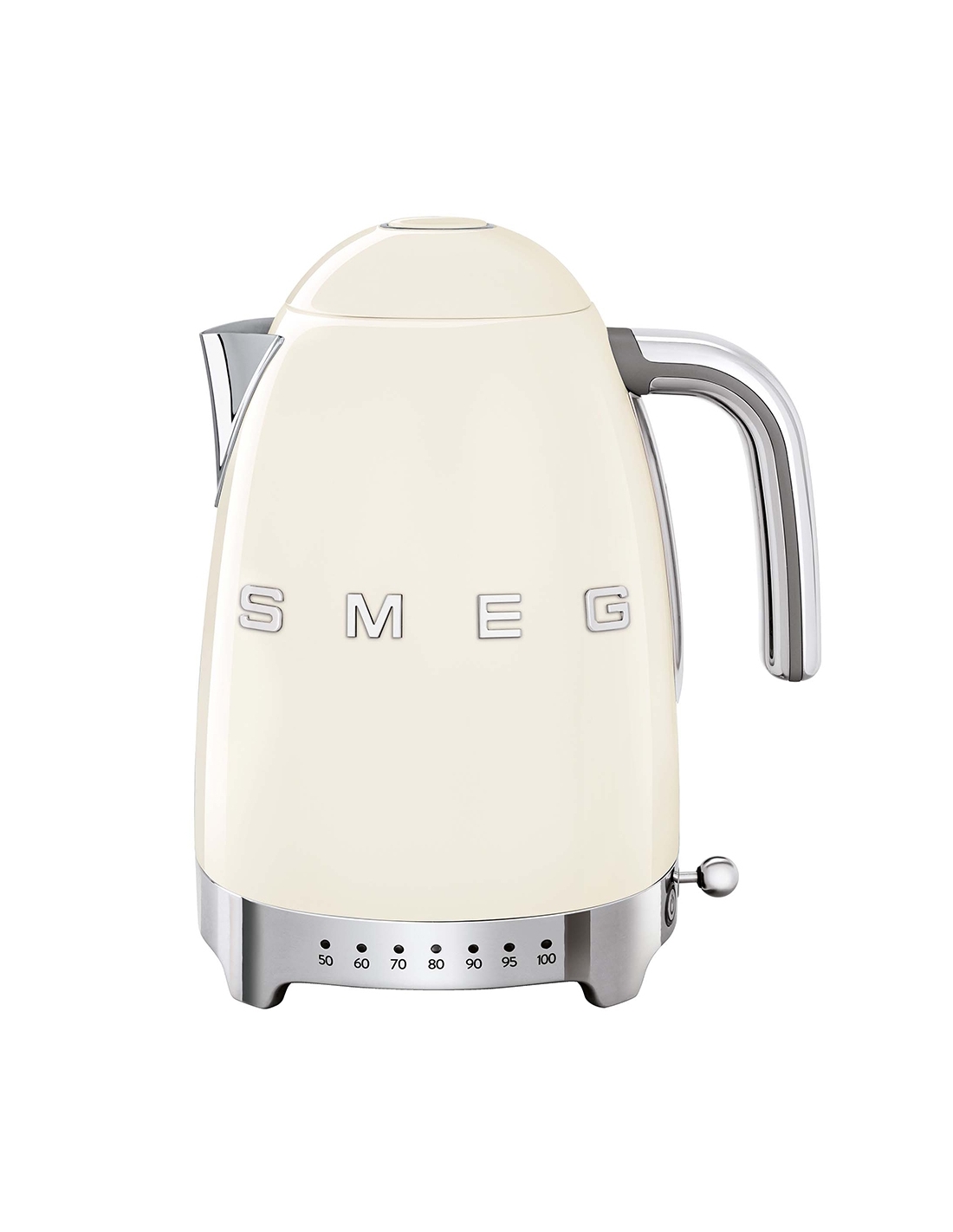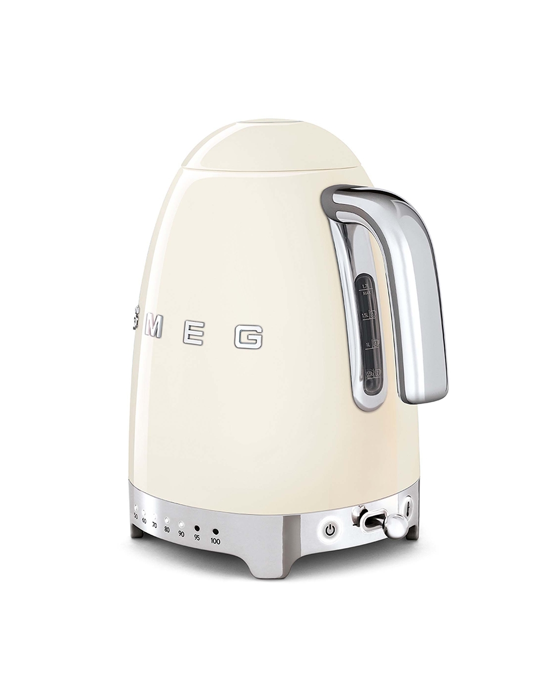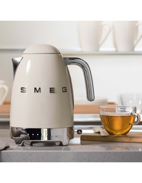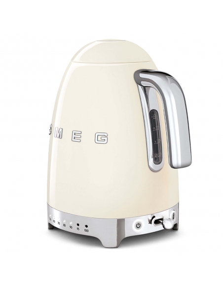 Bollitore 50’ Style panna lucido a temperatura variabile con corpo e coperchio in acciaio inox, base e maniglia in plastica, beccuccio in acciaio lucido. Apertura soft opening. Capacità 1,7 lt / 7 tazze. Autospegnimento di sicurezza a temperatura raggiunta. Regolabile su vari livelli di temperatura da 50° a 100°. Base antiscivolo.