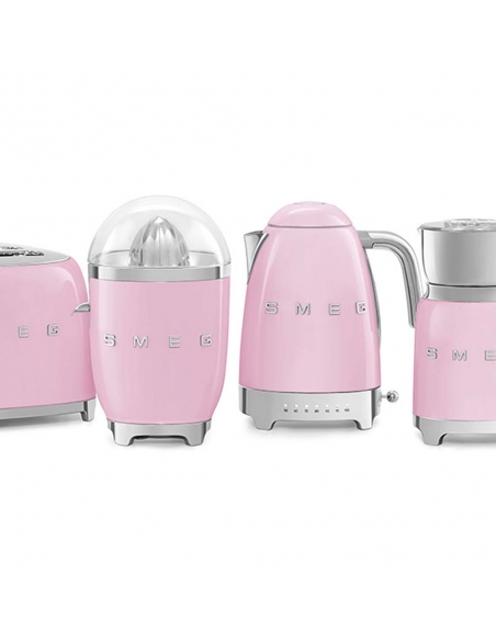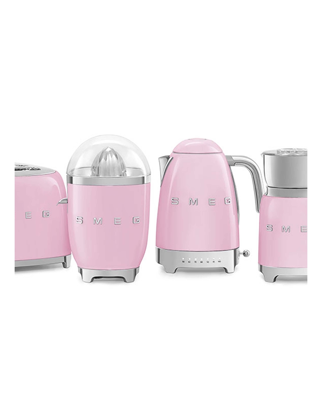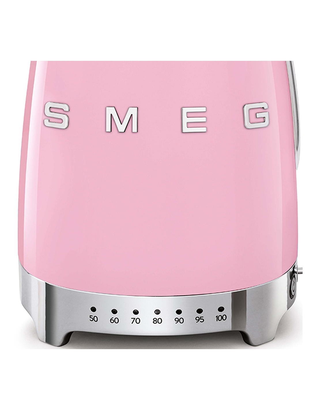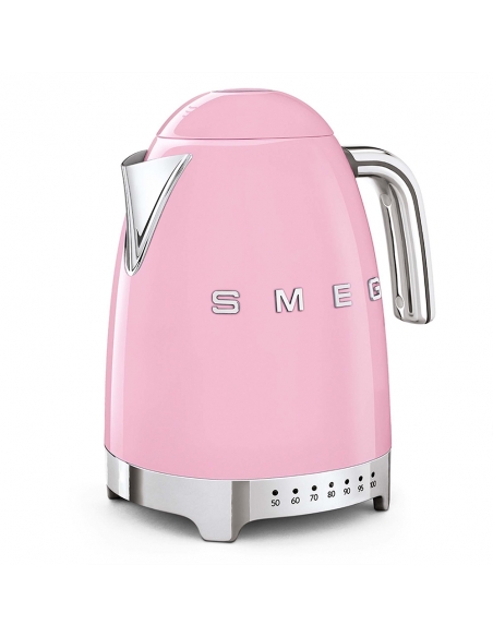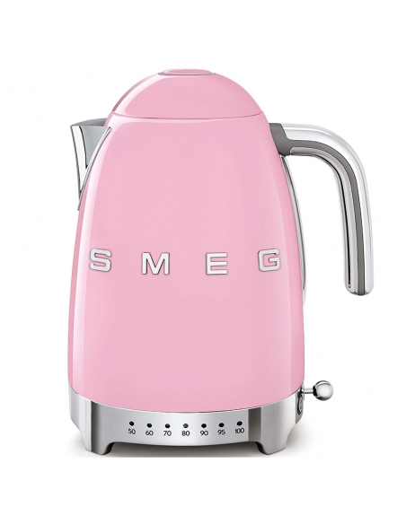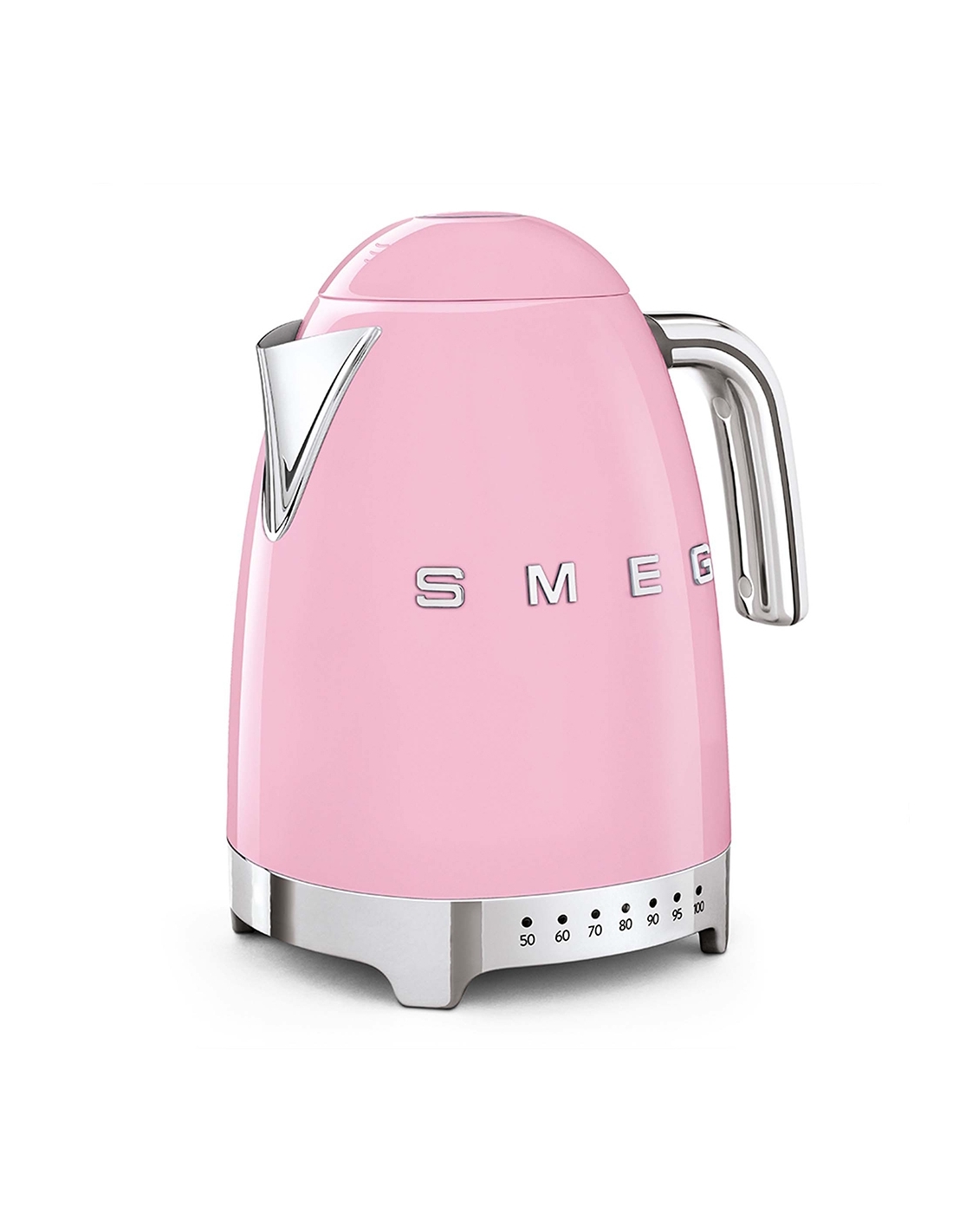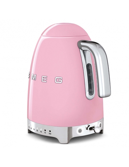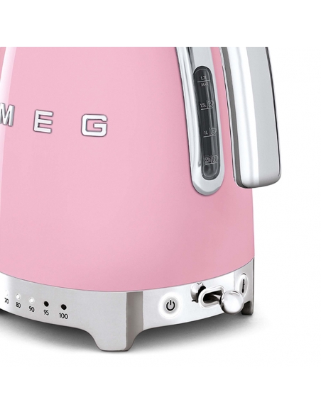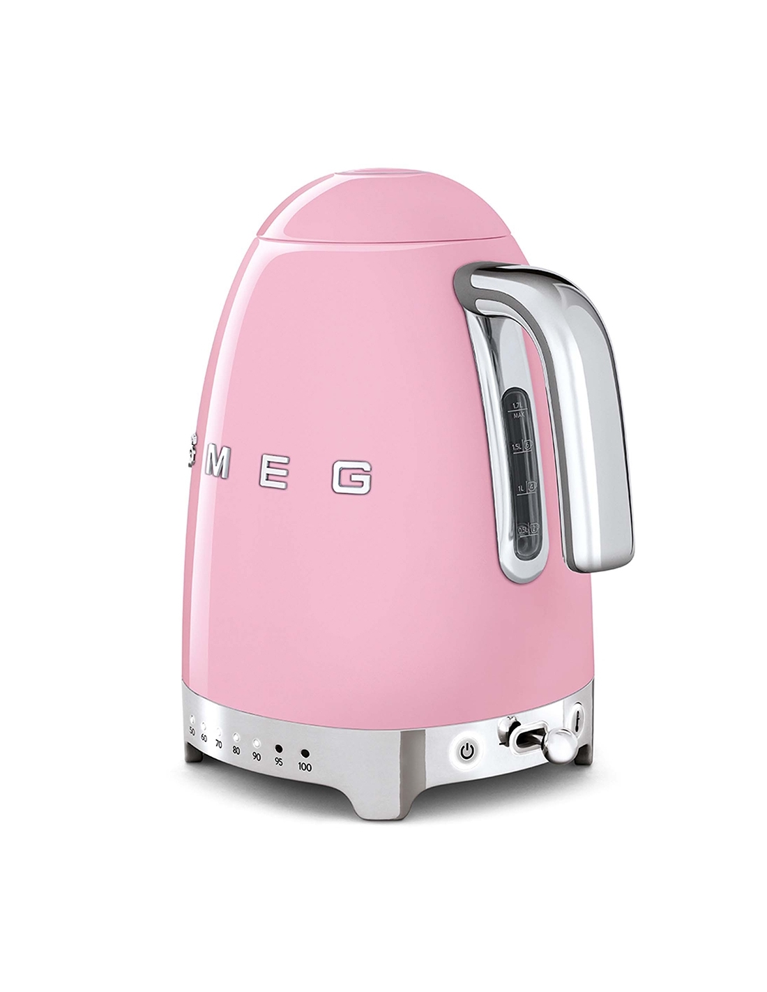 Bollitore 50’ Style rosa lucido a temperatura variabile con corpo e coperchio in acciaio inox, base e maniglia in plastica, beccuccio in acciaio lucido. Apertura soft opening. Capacità 1,7 lt / 7 tazze. Autospegnimento di sicurezza a temperatura raggiunta. Regolabile su vari livelli di temperatura da 50° a 100°. Base antiscivolo.