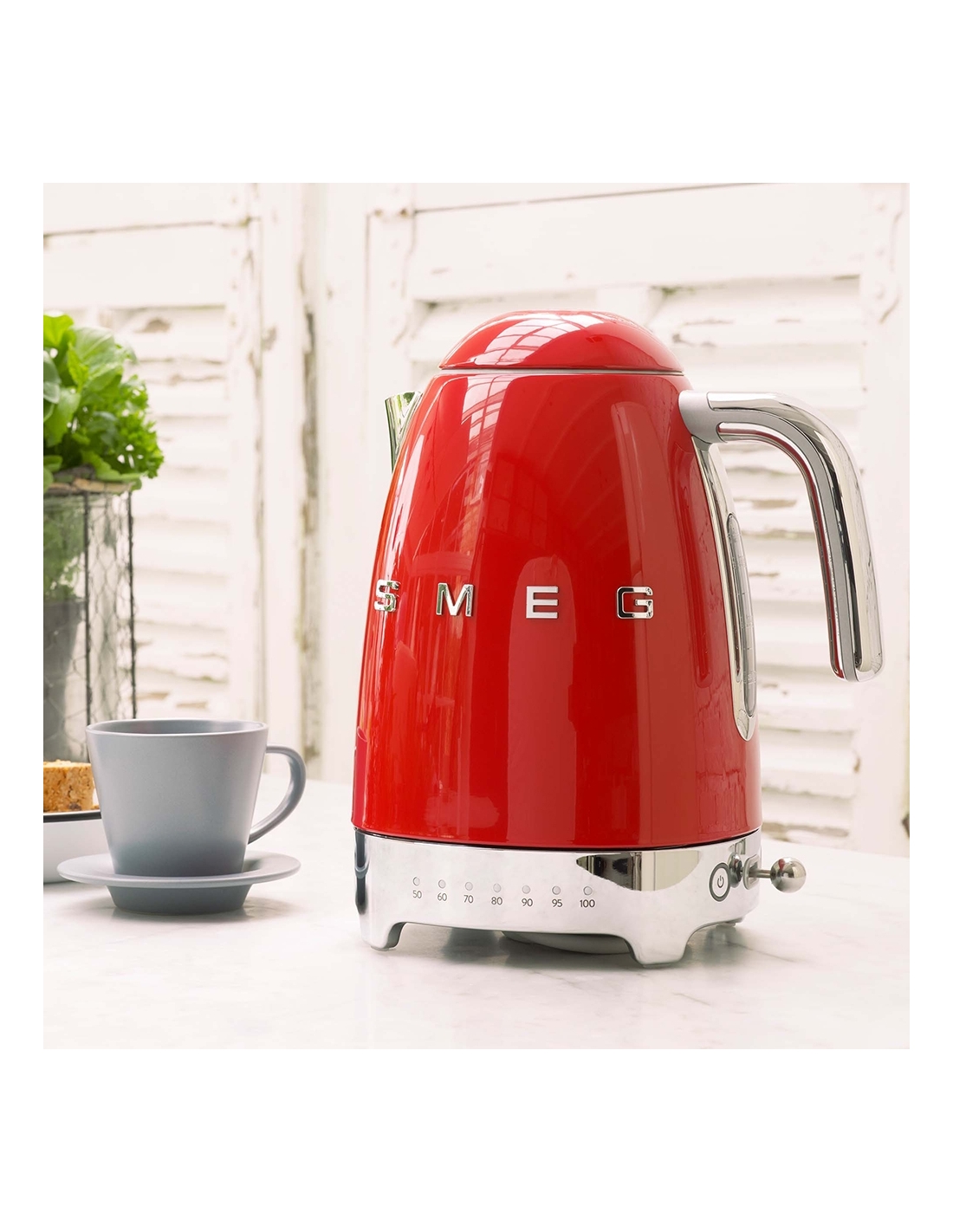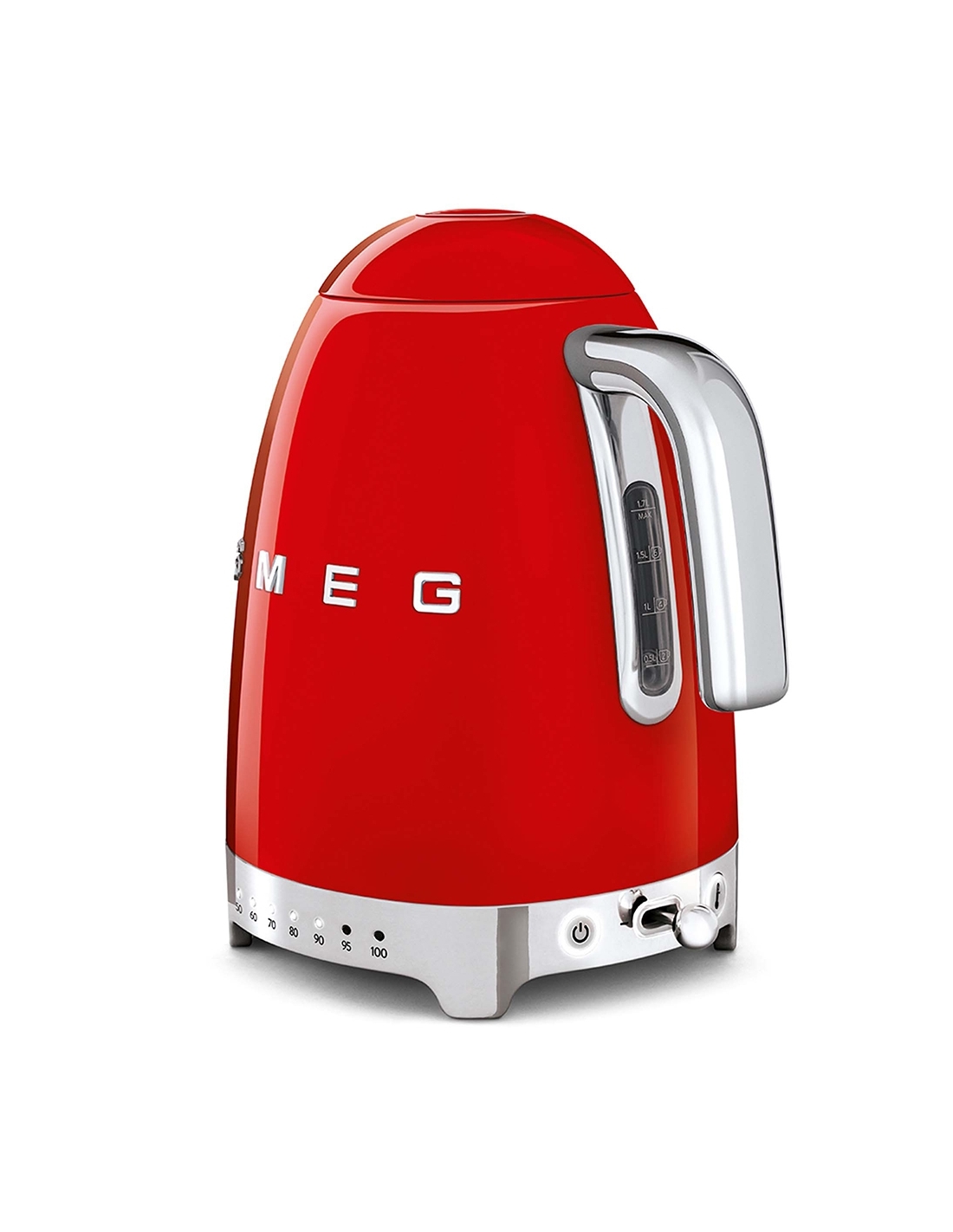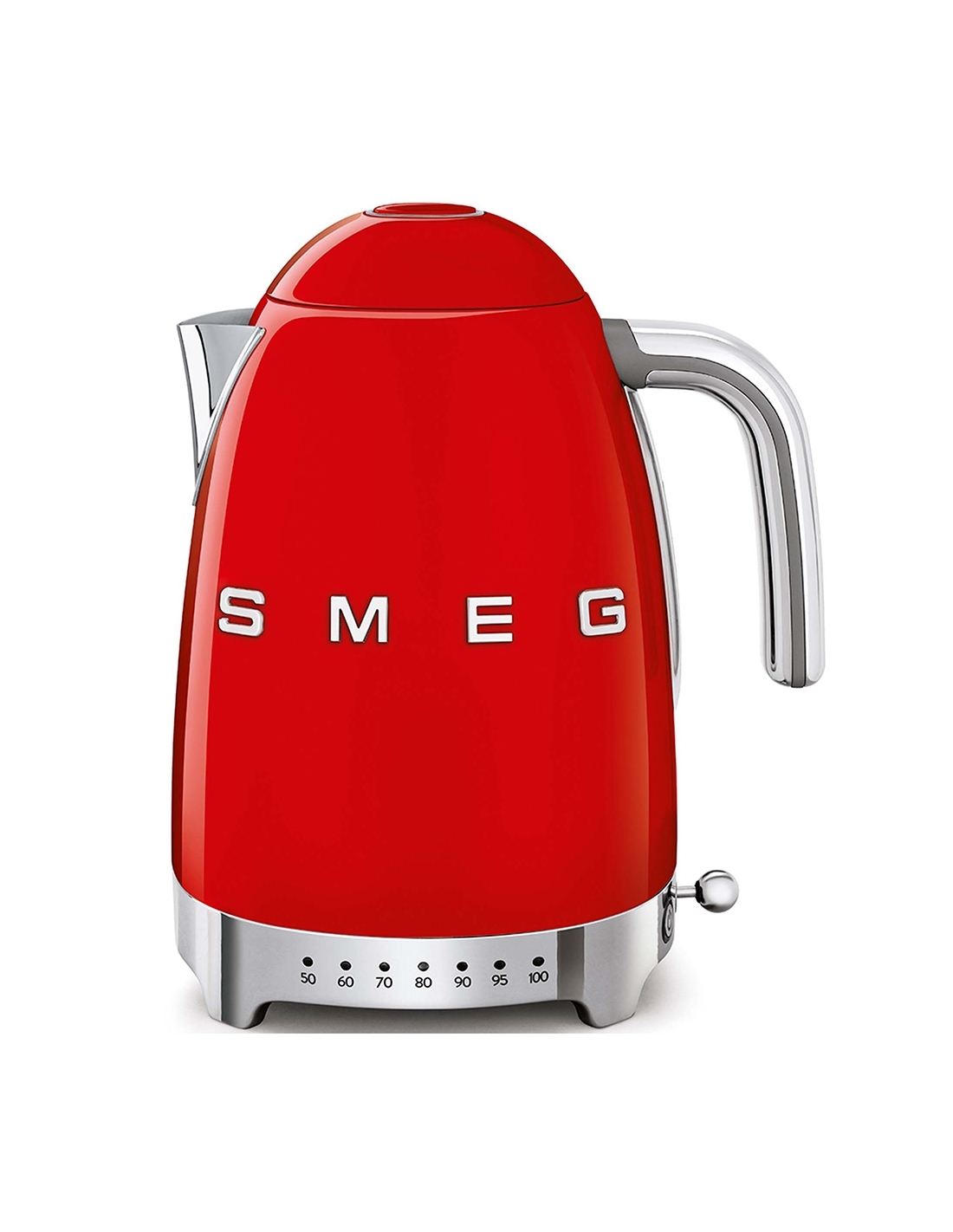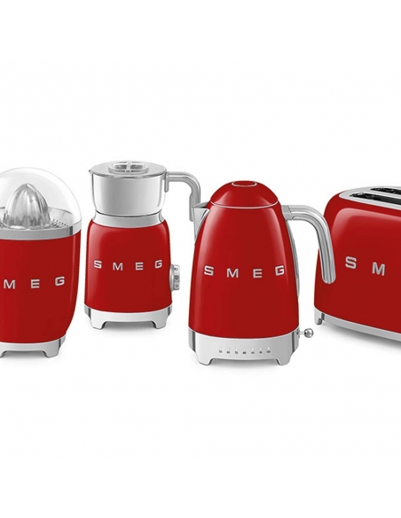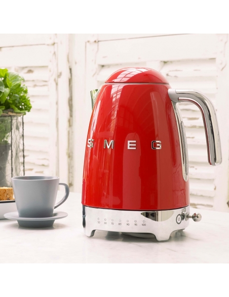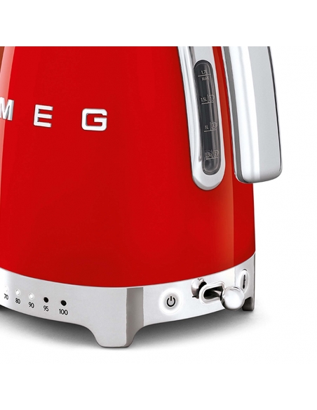 Bollitore 50’ Style rosso lucido a temperatura variabile con corpo e coperchio in acciaio inox, base e maniglia in plastica, beccuccio in acciaio lucido. Apertura soft opening. Capacità 1,7 lt / 7 tazze. Autospegnimento di sicurezza a temperatura raggiunta. Regolabile su vari livelli di temperatura da 50° a 100°. Base antiscivolo.