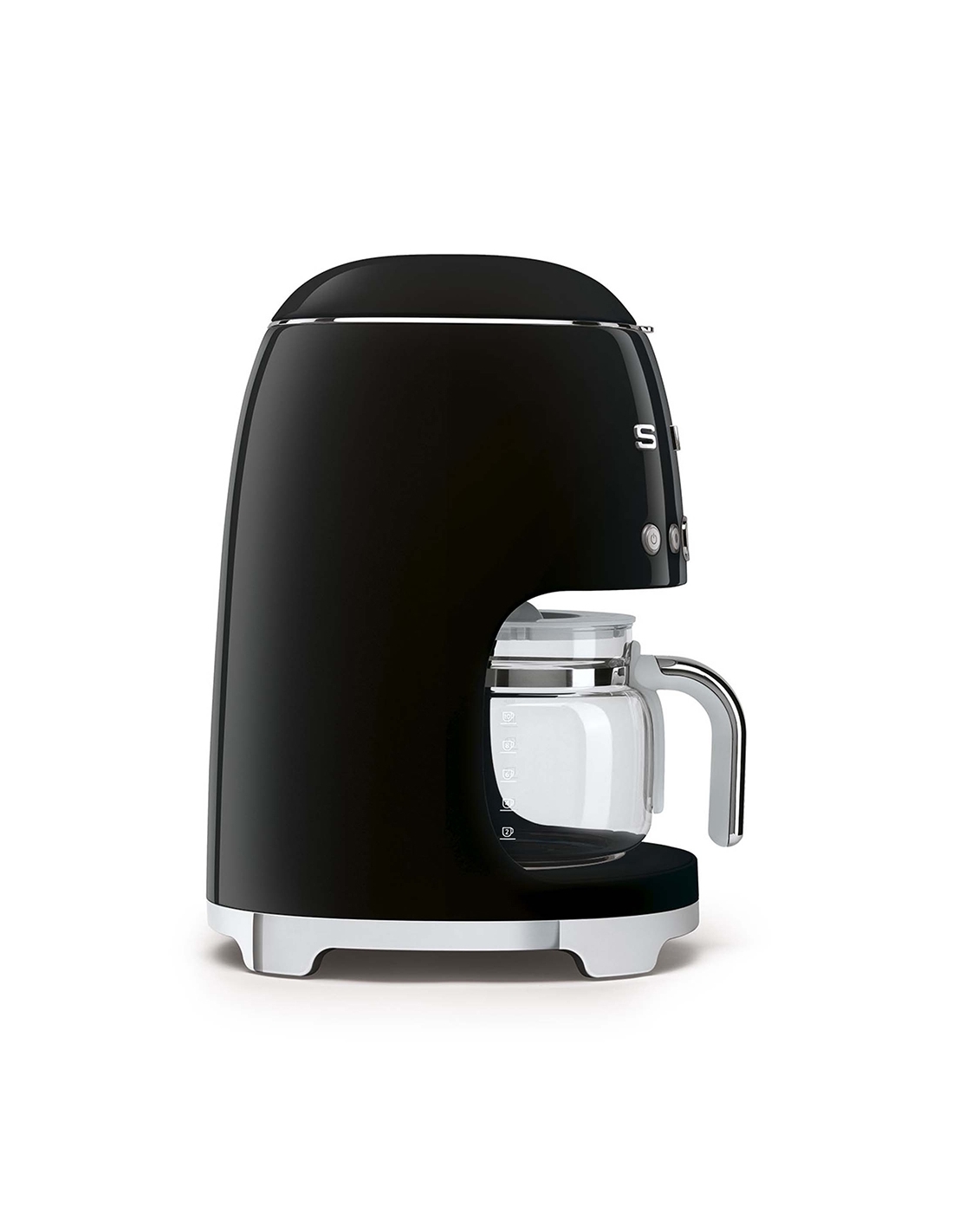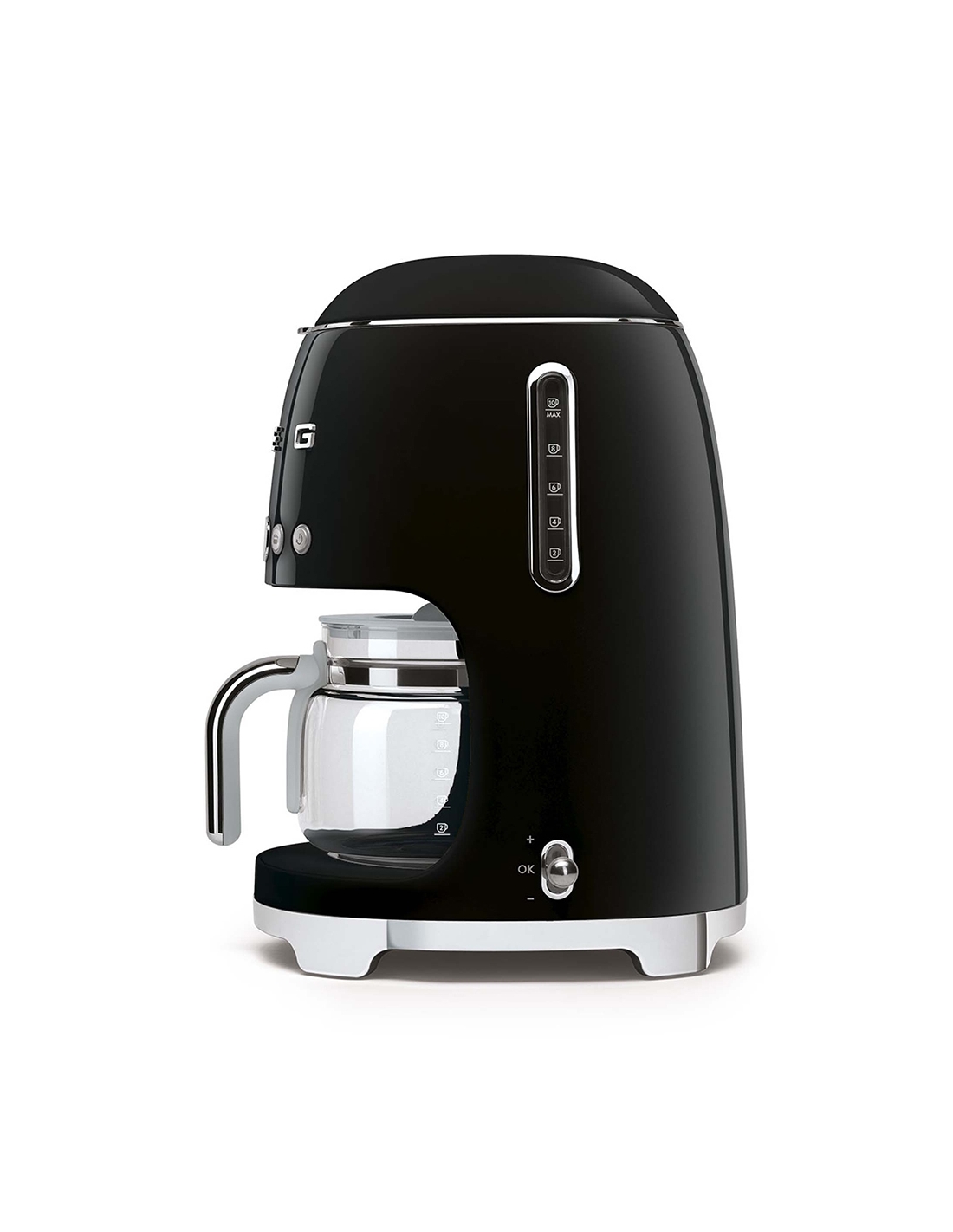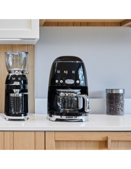 Macchina da caffè con filtro 50’ Style nero lucido. Corpo e base in acciaio e plastica, filtro in acciaio inox, coperchio e caraffa in vetro e plastica. Capienza serbatoio 1,4 lt. Capienza caraffa 1,25 lt. Capacità fino a 10 tazze.
