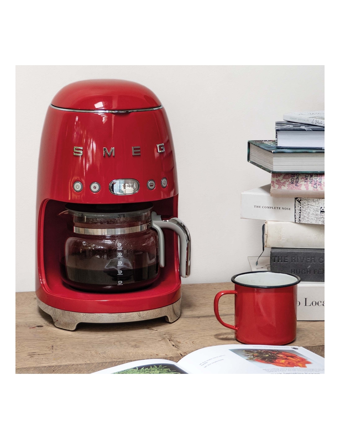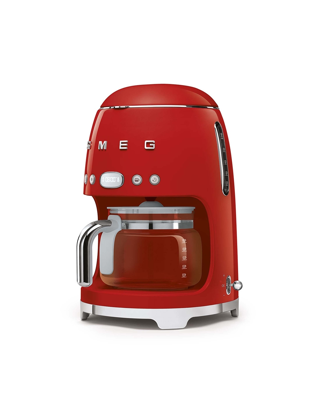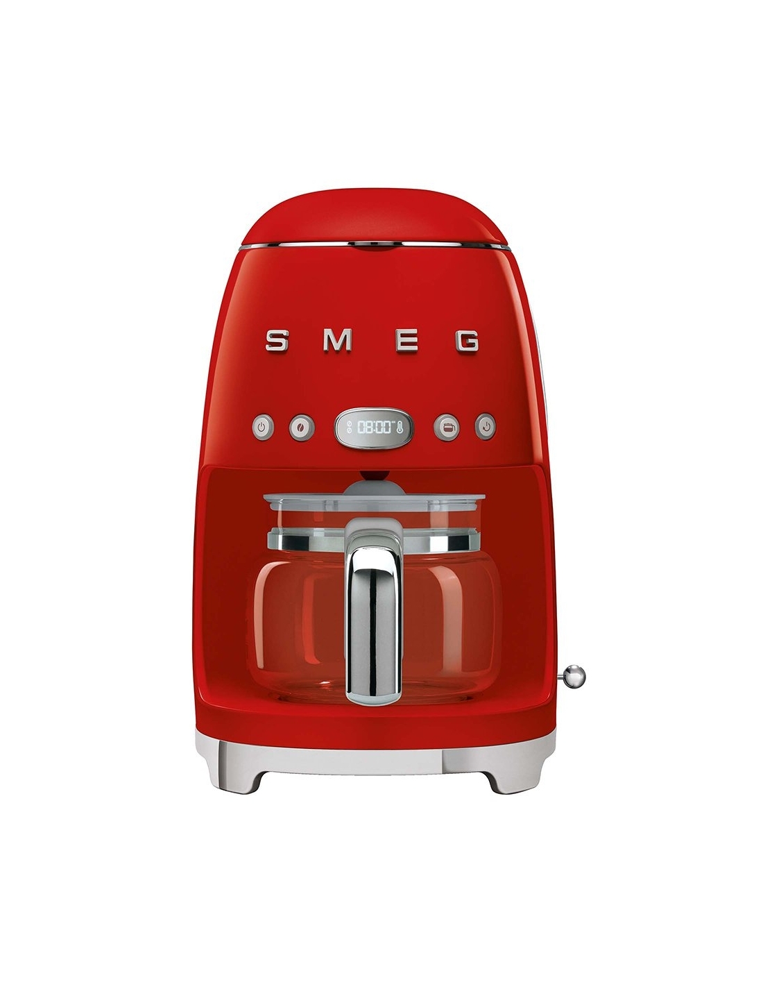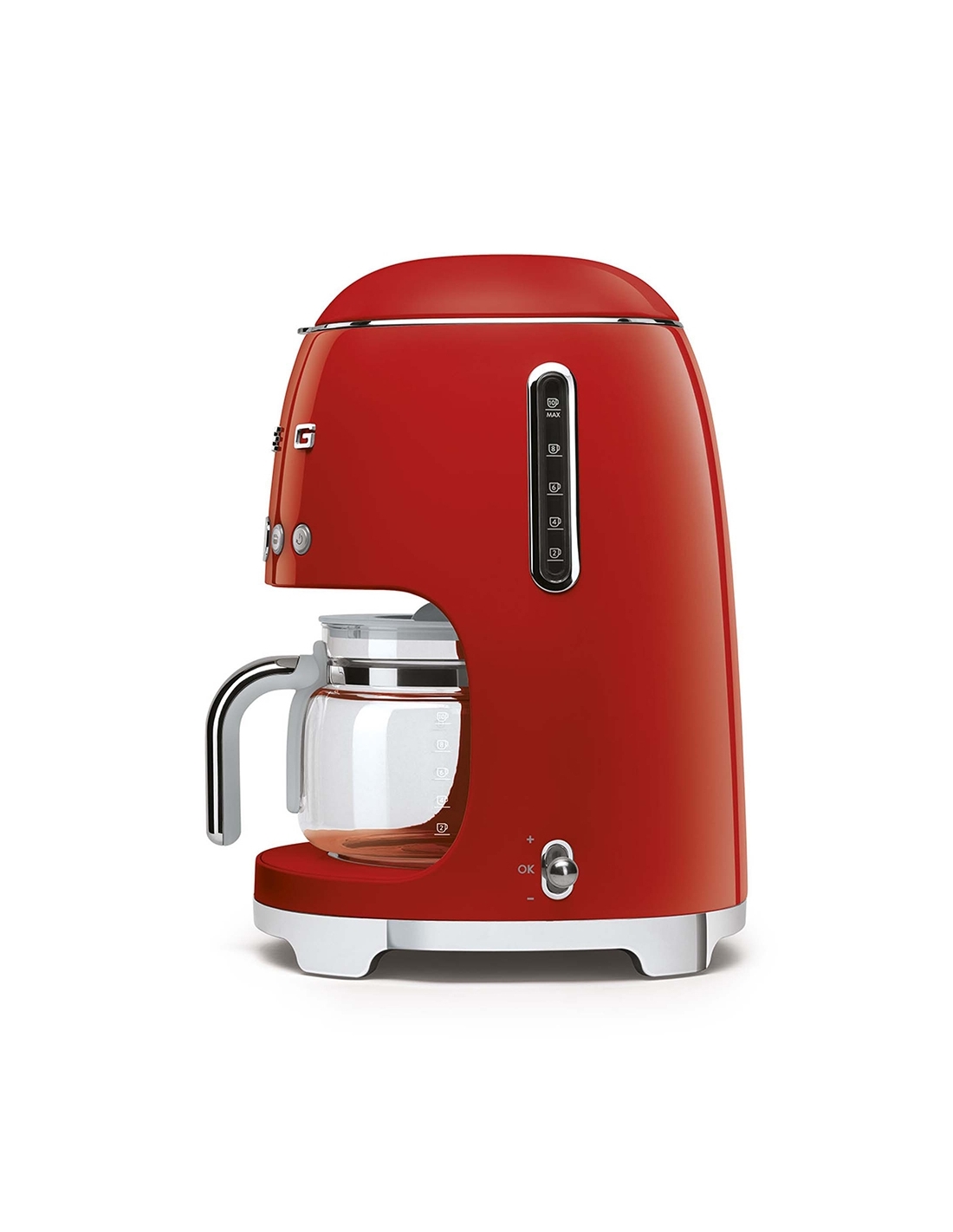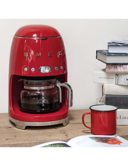 Macchina da caffè con filtro 50’ Style rosso lucido. Corpo e base in acciaio e plastica, filtro in acciaio inox, coperchio e caraffa in vetro e plastica. Capienza serbatoio 1,4 lt. Capienza caraffa 1,25 lt. Capacità fino a 10 tazze.