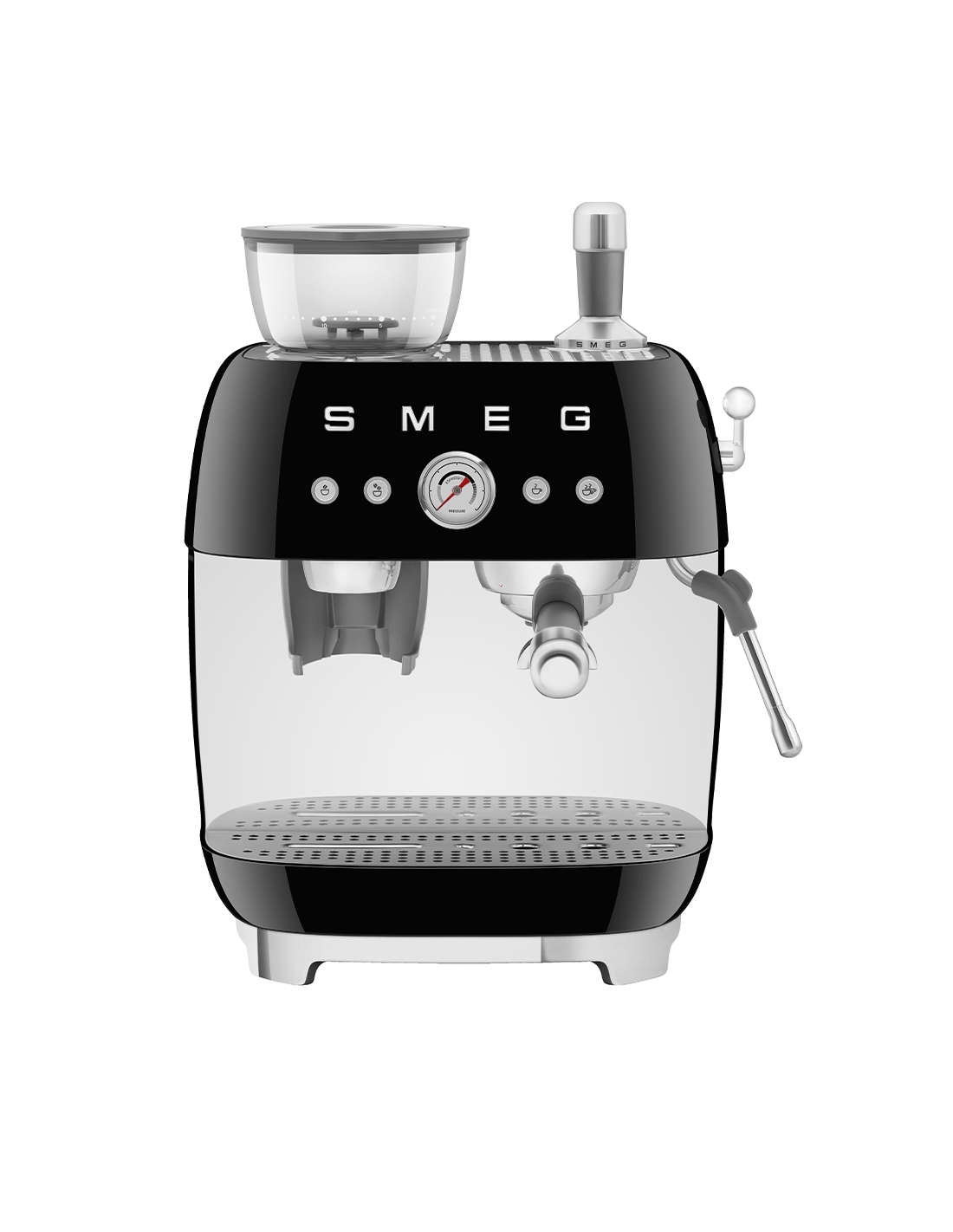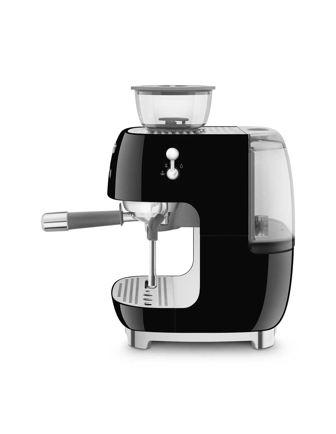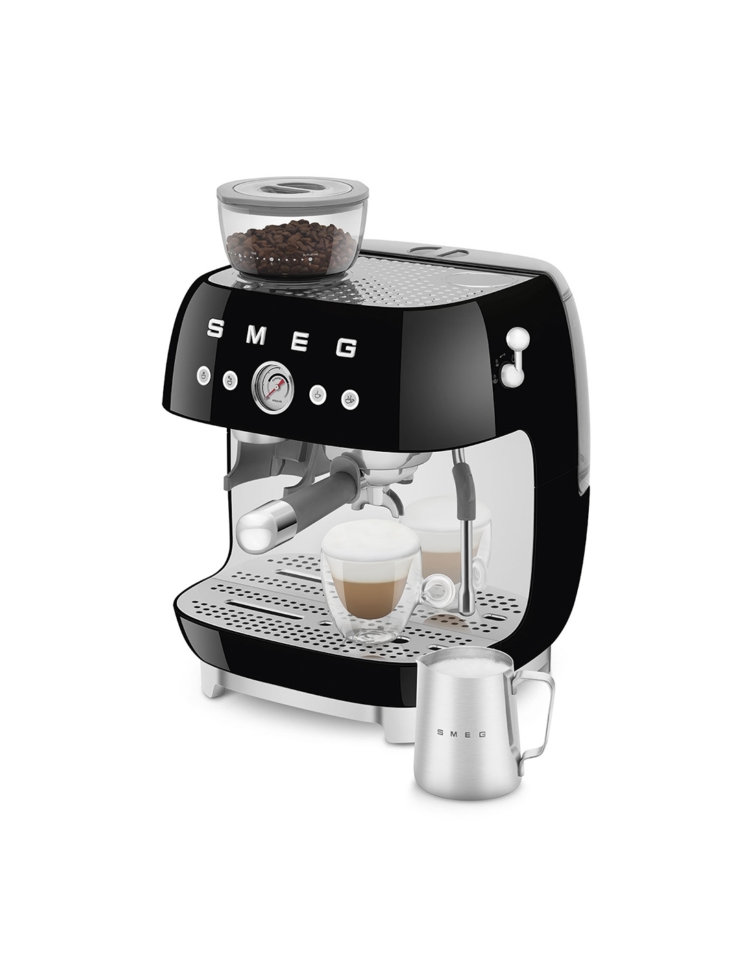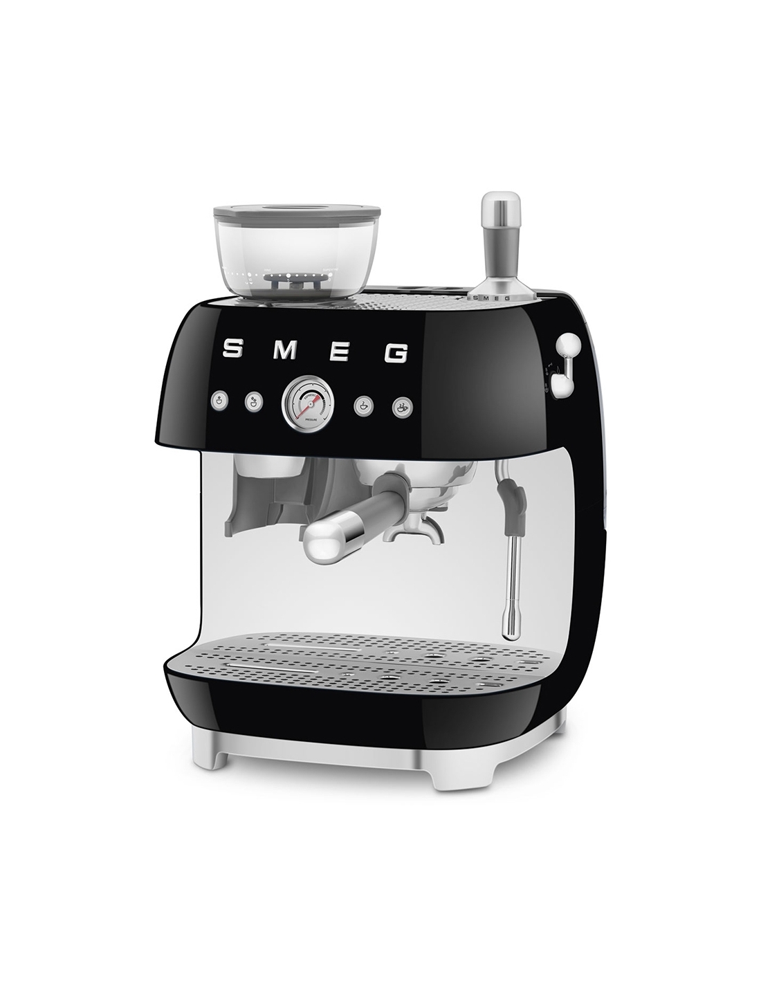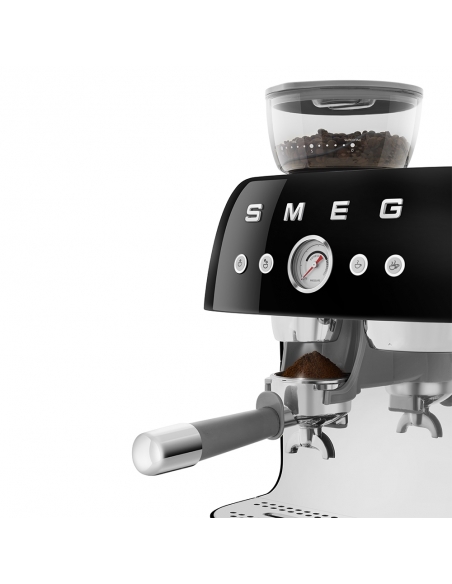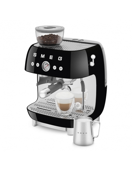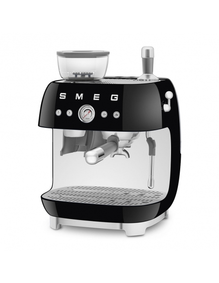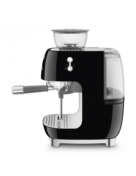 Macchina da caffè espresso 50’ Style nero lucido. Corpo e vaschetta raccogligocce in alluminio pressofuso, base in plastica, portafiltro, lancia vapore, lattiera, pressino e griglia scalda tazze in acciaio inox. Con macina caffè integrato. Capacità contenitore caffè 250 gr. Capienza serbatoio acqua 2,4 lt.