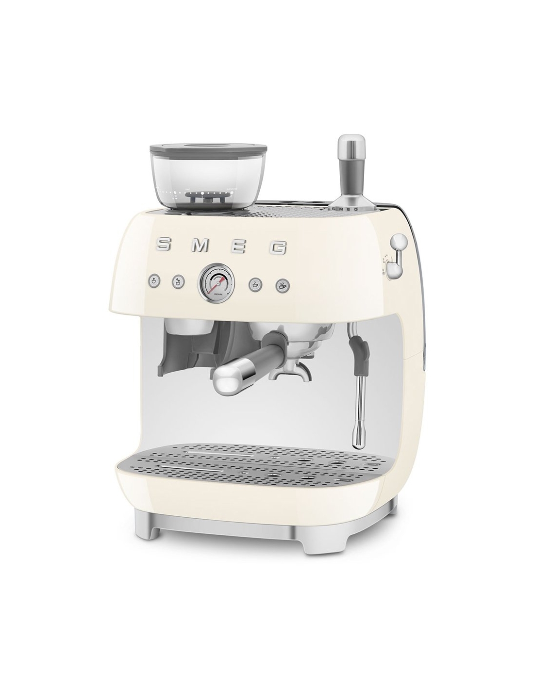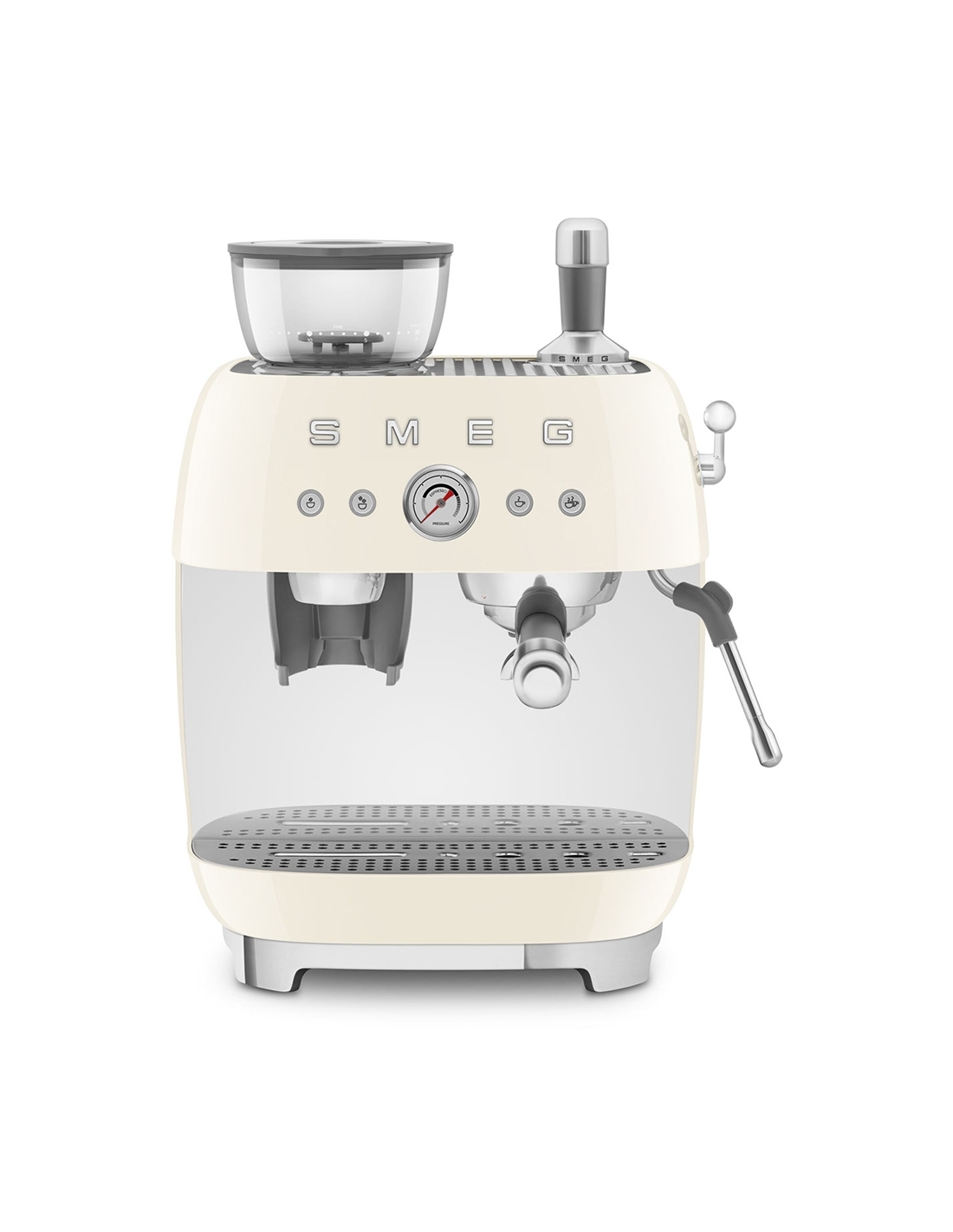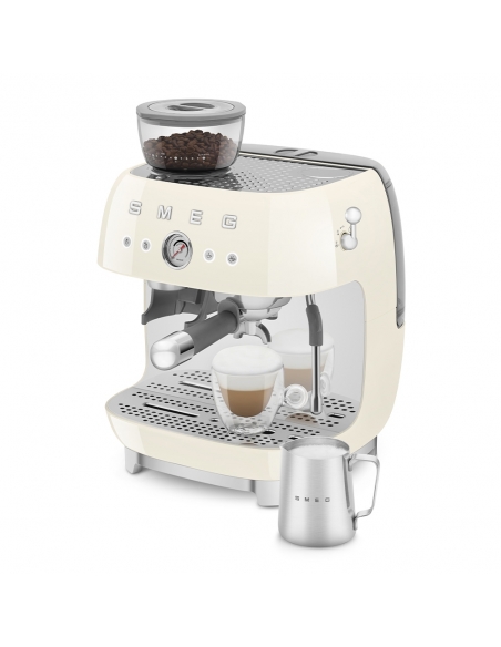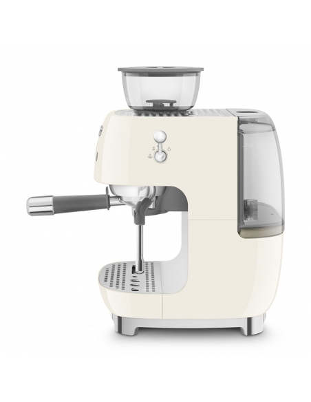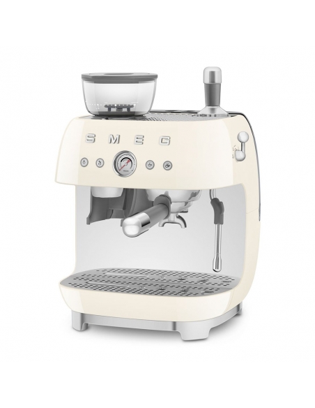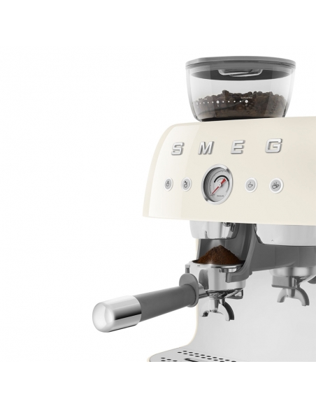 Macchina da caffè espresso 50’ Style panna lucido. Corpo e vaschetta raccogligocce in alluminio pressofuso, base in plastica, portafiltro, lancia vapore, lattiera, pressino e griglia scalda tazze in acciaio inox. Con macina caffè integrato. Capacità contenitore caffè 250 gr. Capienza serbatoio acqua 2,4 lt.