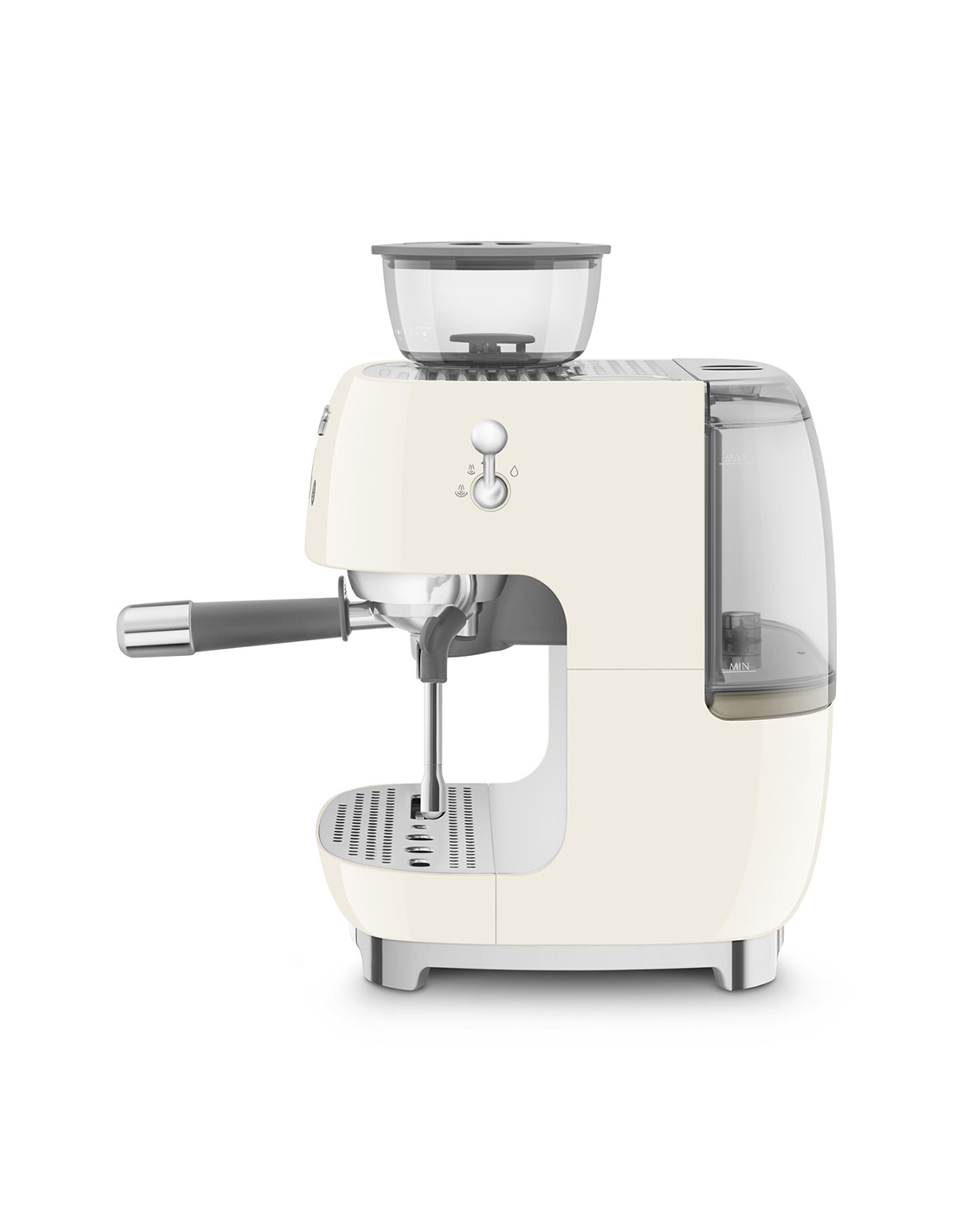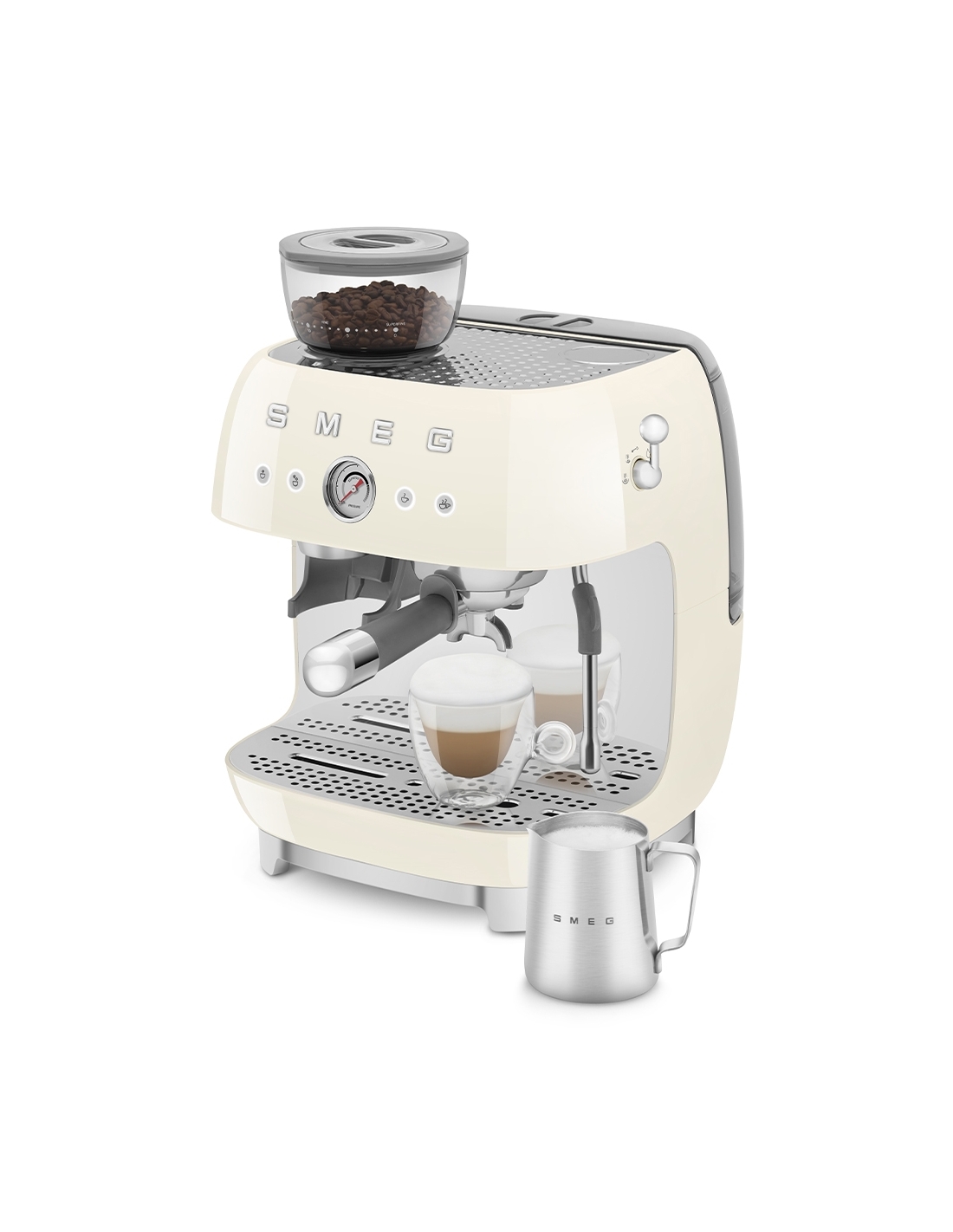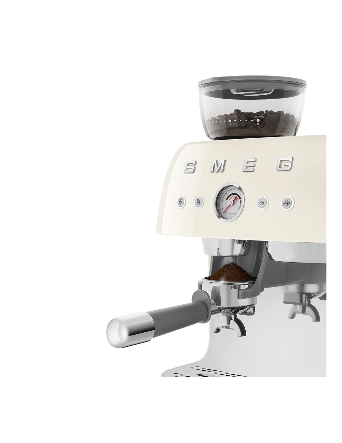 Macchina da caffè espresso 50’ Style panna lucido. Corpo e vaschetta raccogligocce in alluminio pressofuso, base in plastica, portafiltro, lancia vapore, lattiera, pressino e griglia scalda tazze in acciaio inox. Con macina caffè integrato. Capacità contenitore caffè 250 gr. Capienza serbatoio acqua 2,4 lt.