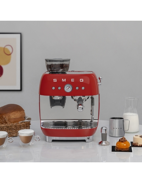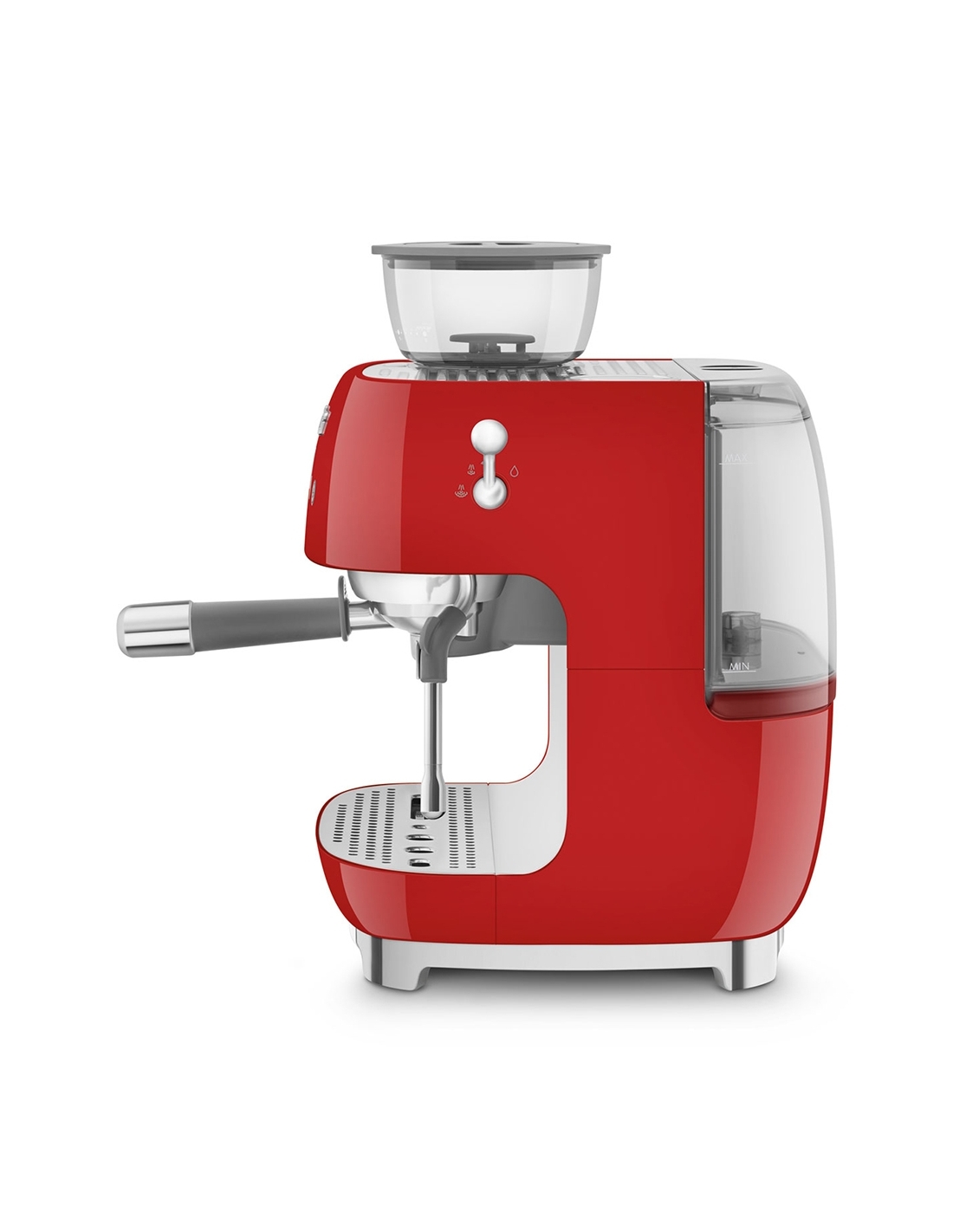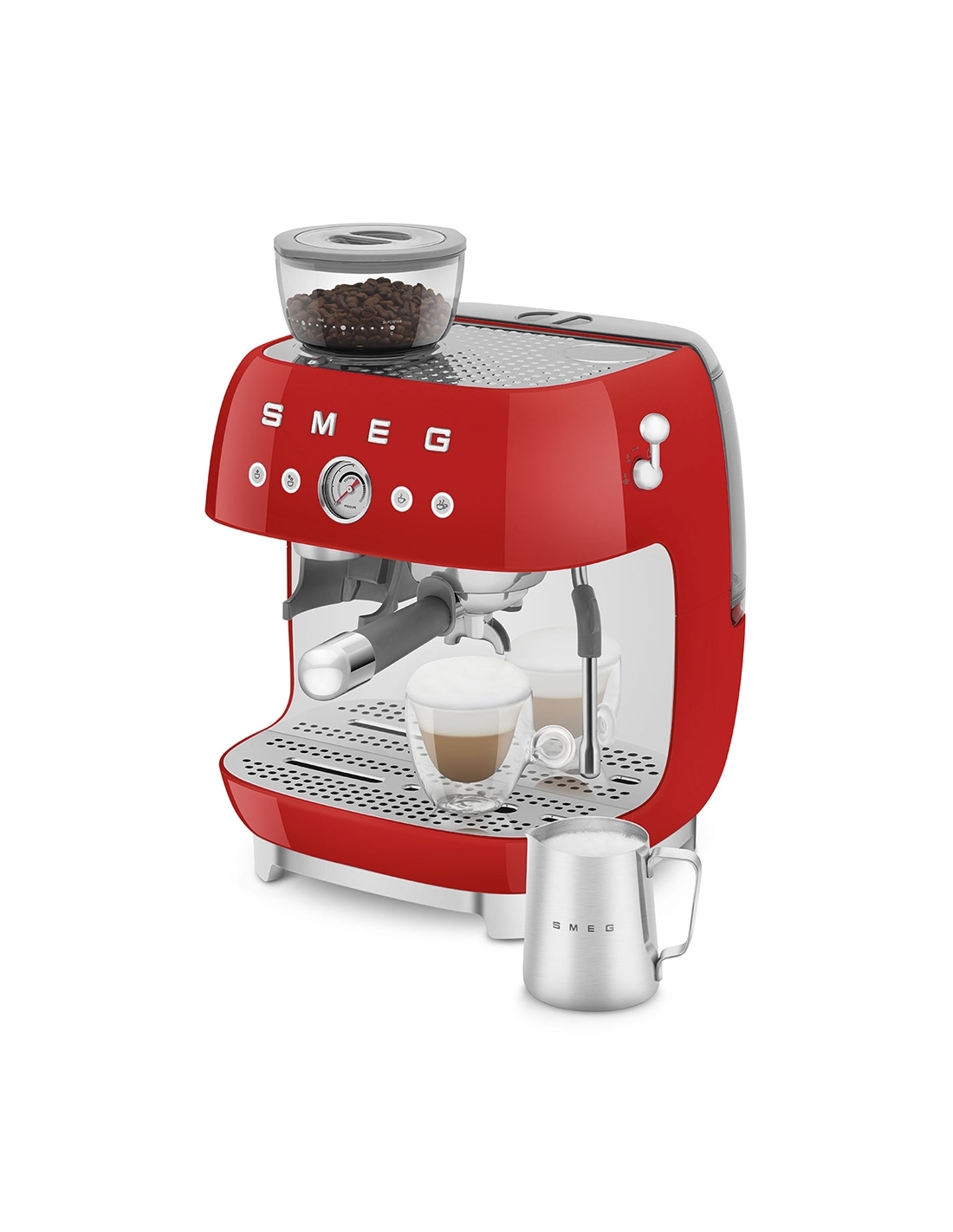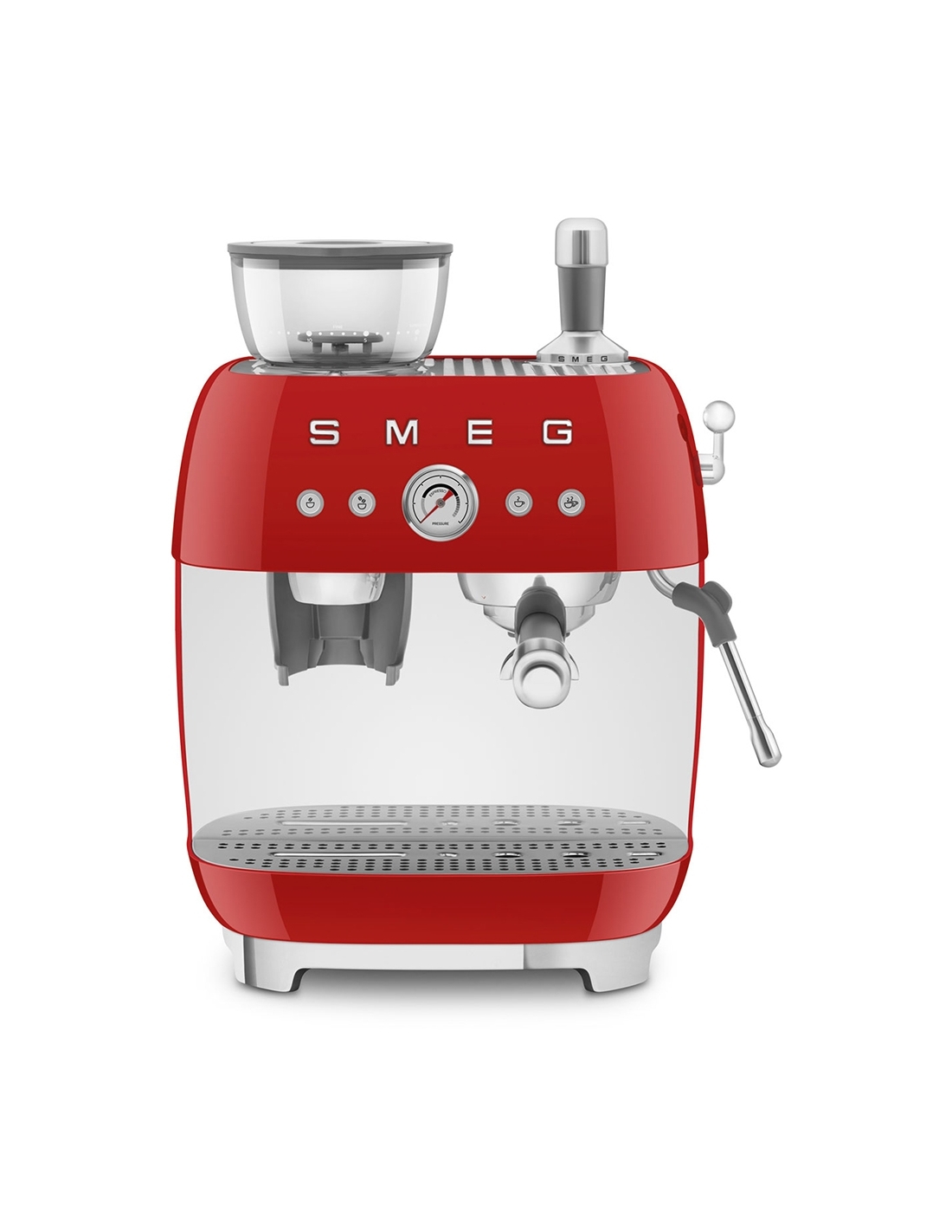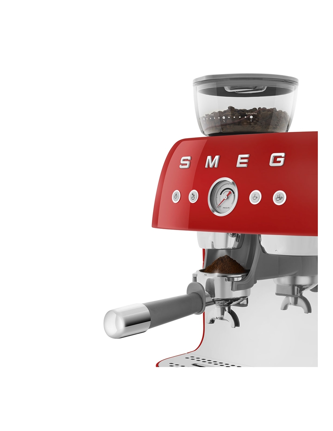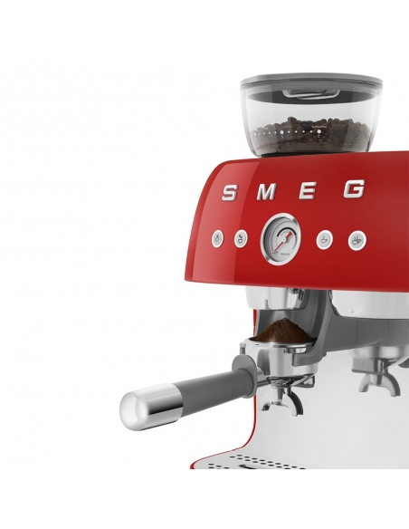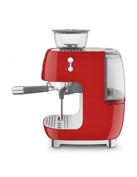 Macchina da caffè espresso 50’ Style rosso lucido. Corpo e vaschetta raccogligocce in alluminio pressofuso, base in plastica, portafiltro, lancia vapore, lattiera, pressino e griglia scalda tazze in acciaio inox. Con macina caffè integrato. Capacità contenitore caffè 250 gr. Capienza serbatoio acqua 2,4 lt.