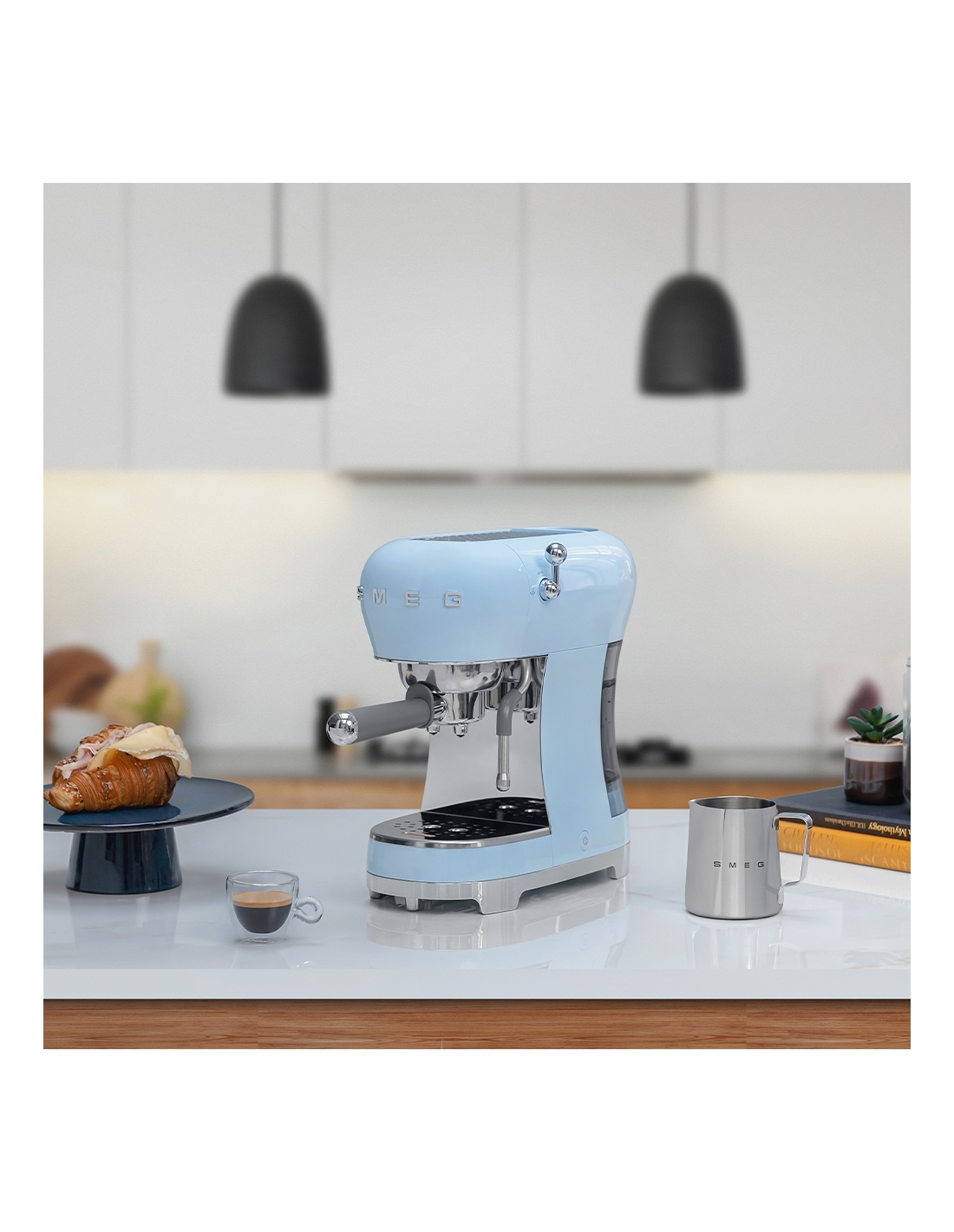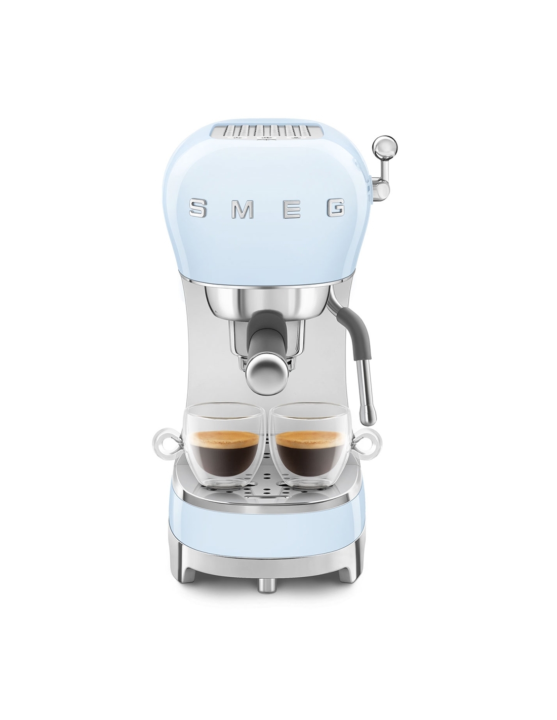 Macchina da caffè espresso manuale 50’ Style azzurro lucido. Corpo e base in plastica, portafiltro, lancia vapore e griglia scalda tazze in acciaio inox. Capienza serbatoio 1,1 lt.