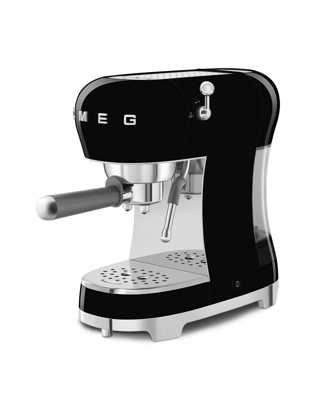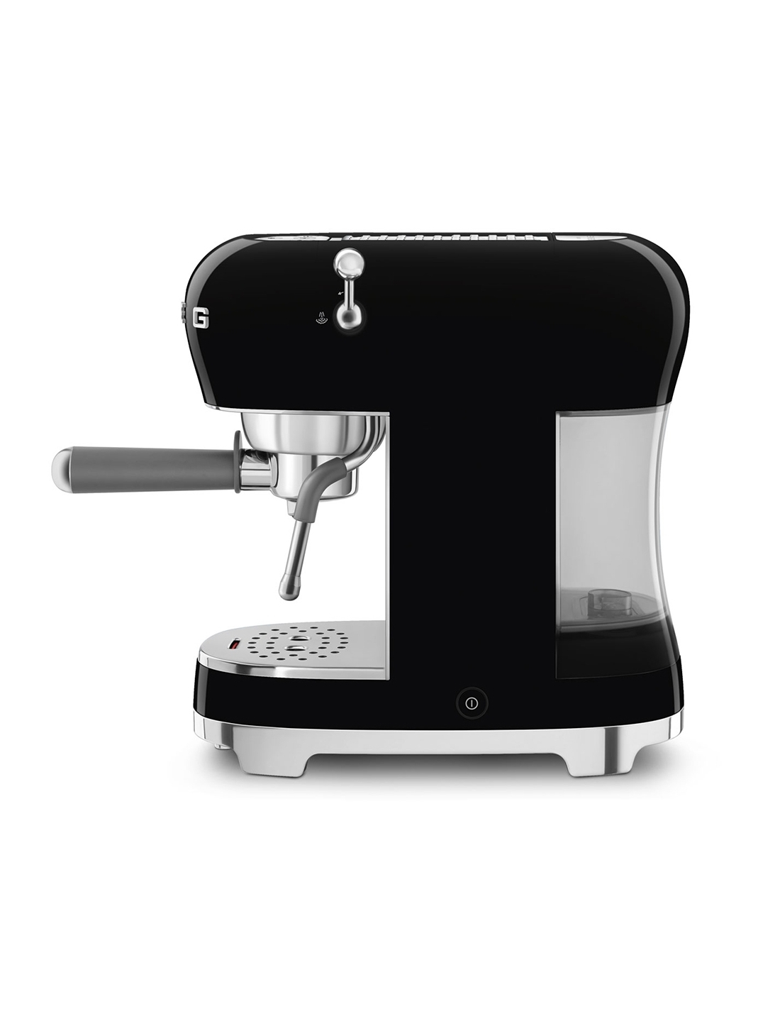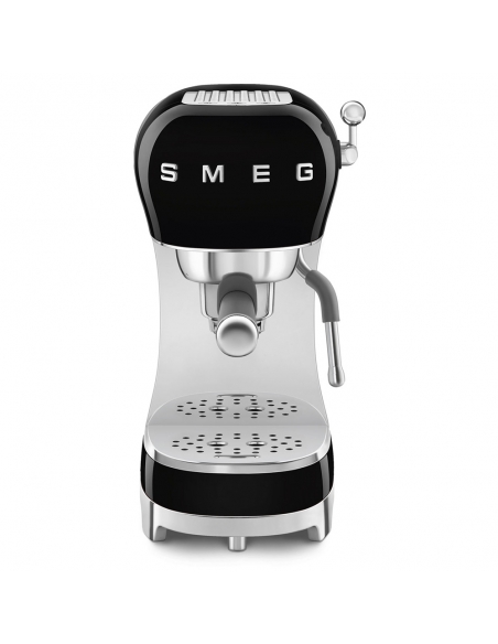 Macchina da caffè espresso manuale 50’ Style nero lucido. Corpo e base in plastica, portafiltro, lancia vapore e griglia scalda tazze in acciaio inox. Capienza serbatoio 1,1 lt.