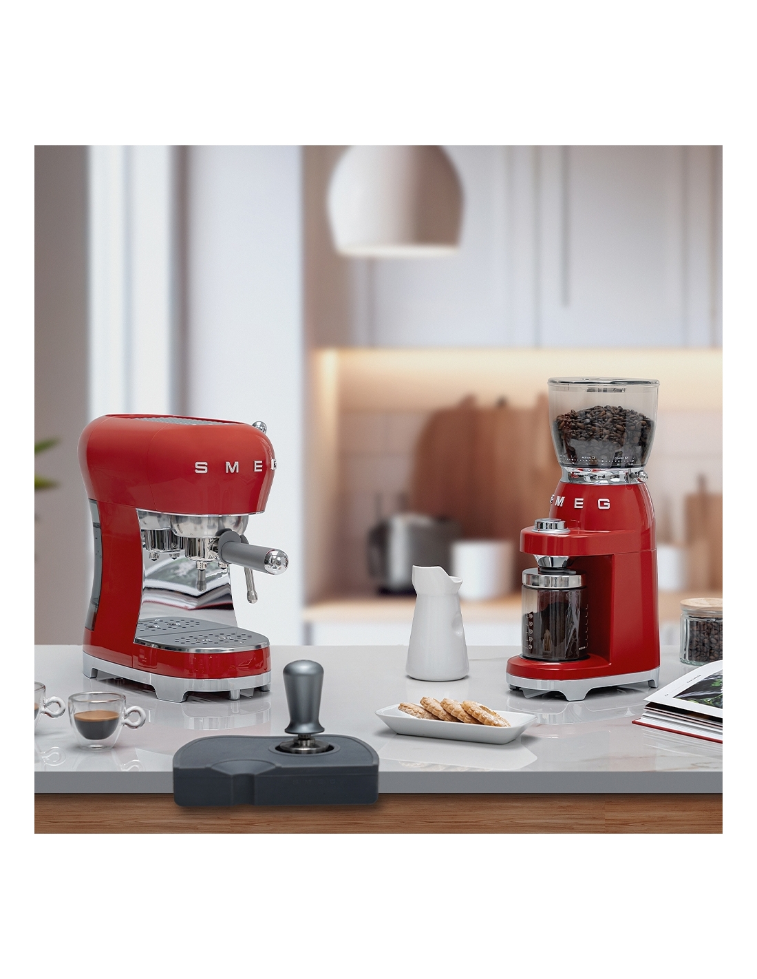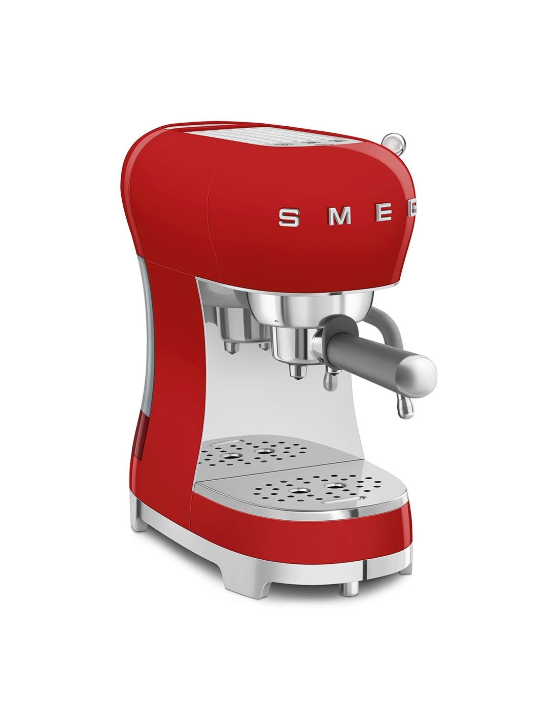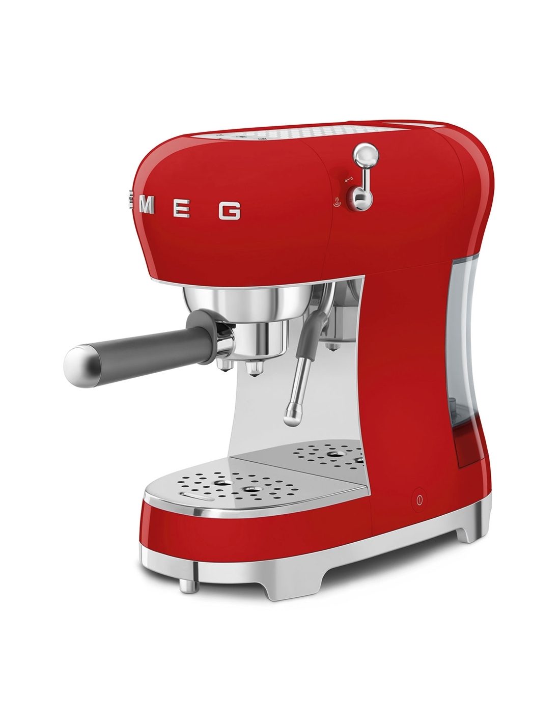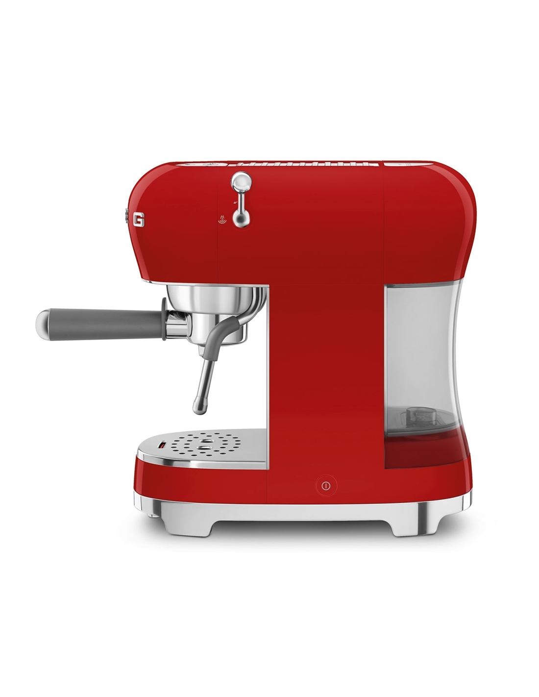 Macchina da caffè espresso manuale 50’ Style rosso lucido. Corpo e base in plastica, portafiltro, lancia vapore e griglia scalda tazze in acciaio inox. Capienza serbatoio 1,1 lt.