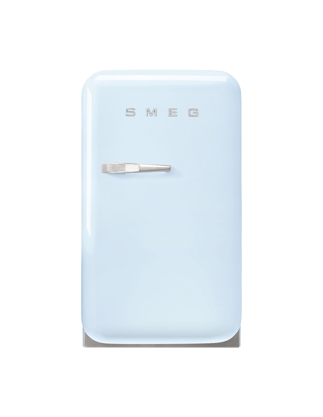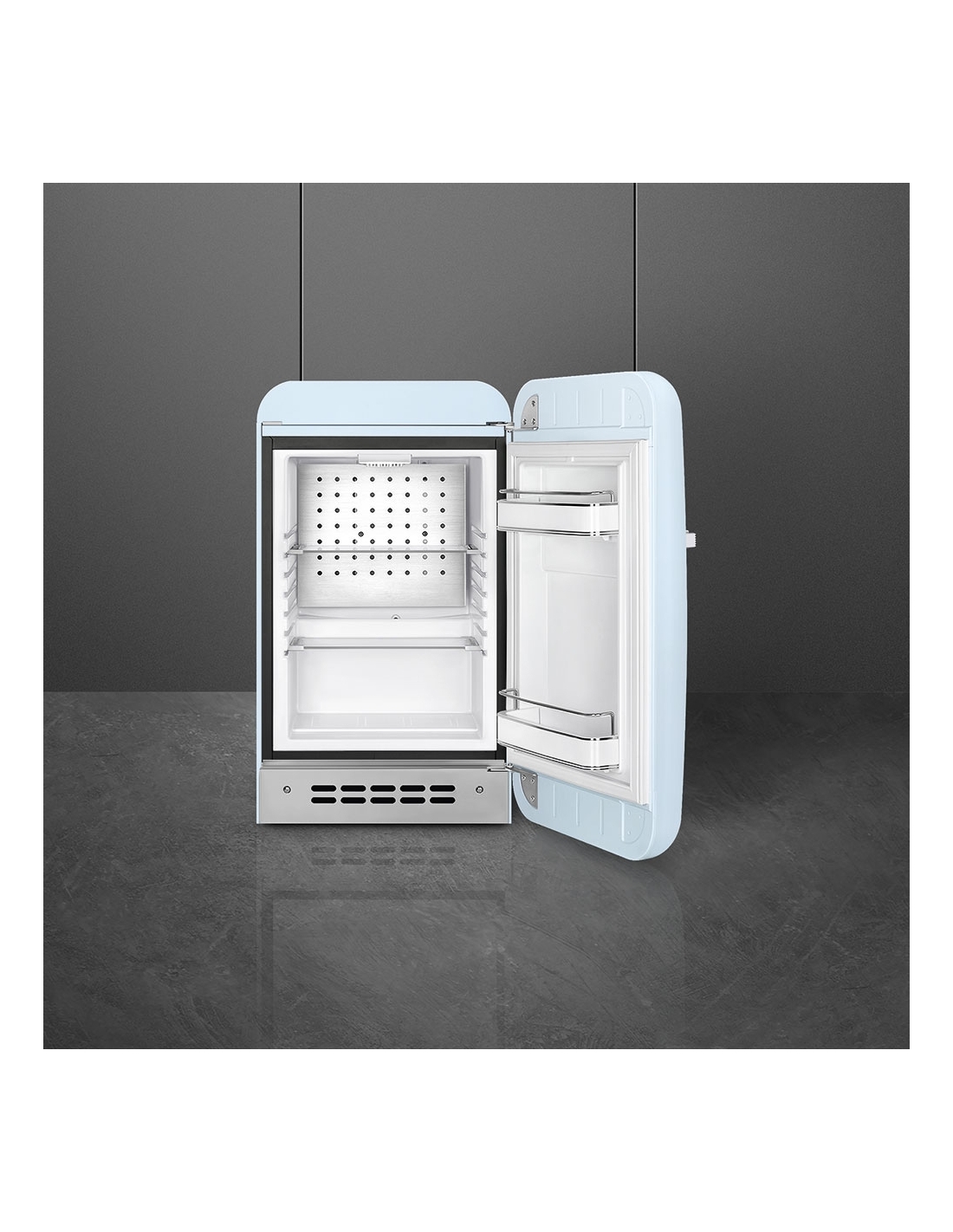 Mini frigo monoporta libera installazione 50’ Style azzurro lucido. Design bombato. Posizione cerniera porta sinistra. Sistema di sbrinamento automatico. Illuminazione interna a Led. Completo di 2 ripiani regolabili in cristallo, 1 balconcino regolabile, 1 mensola portabottiglie.