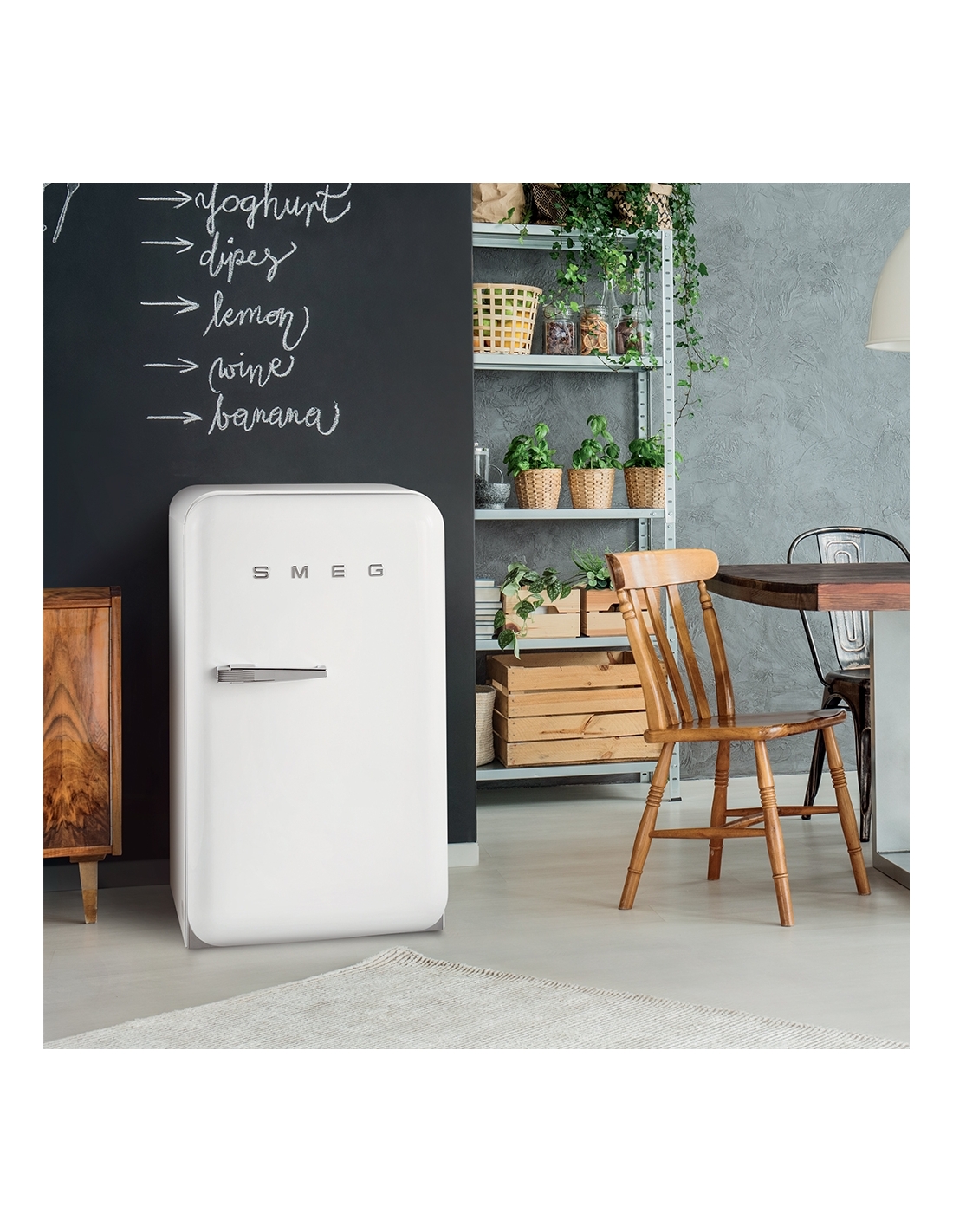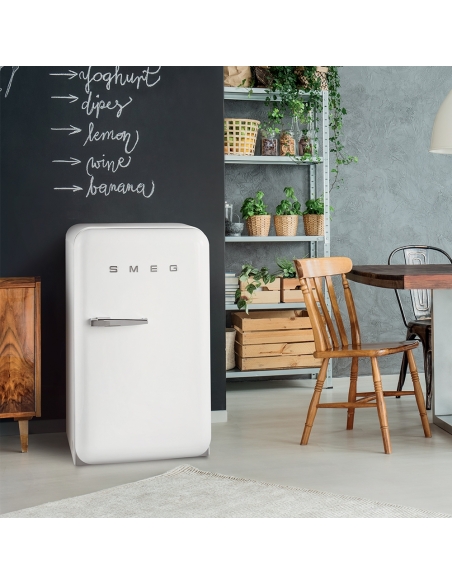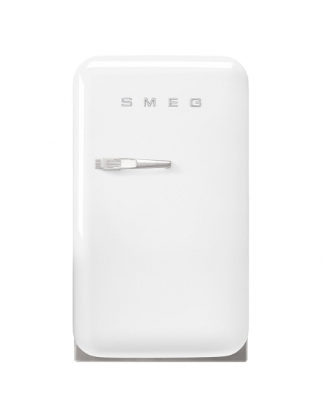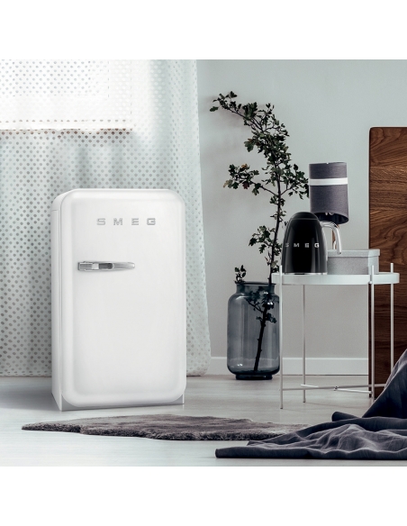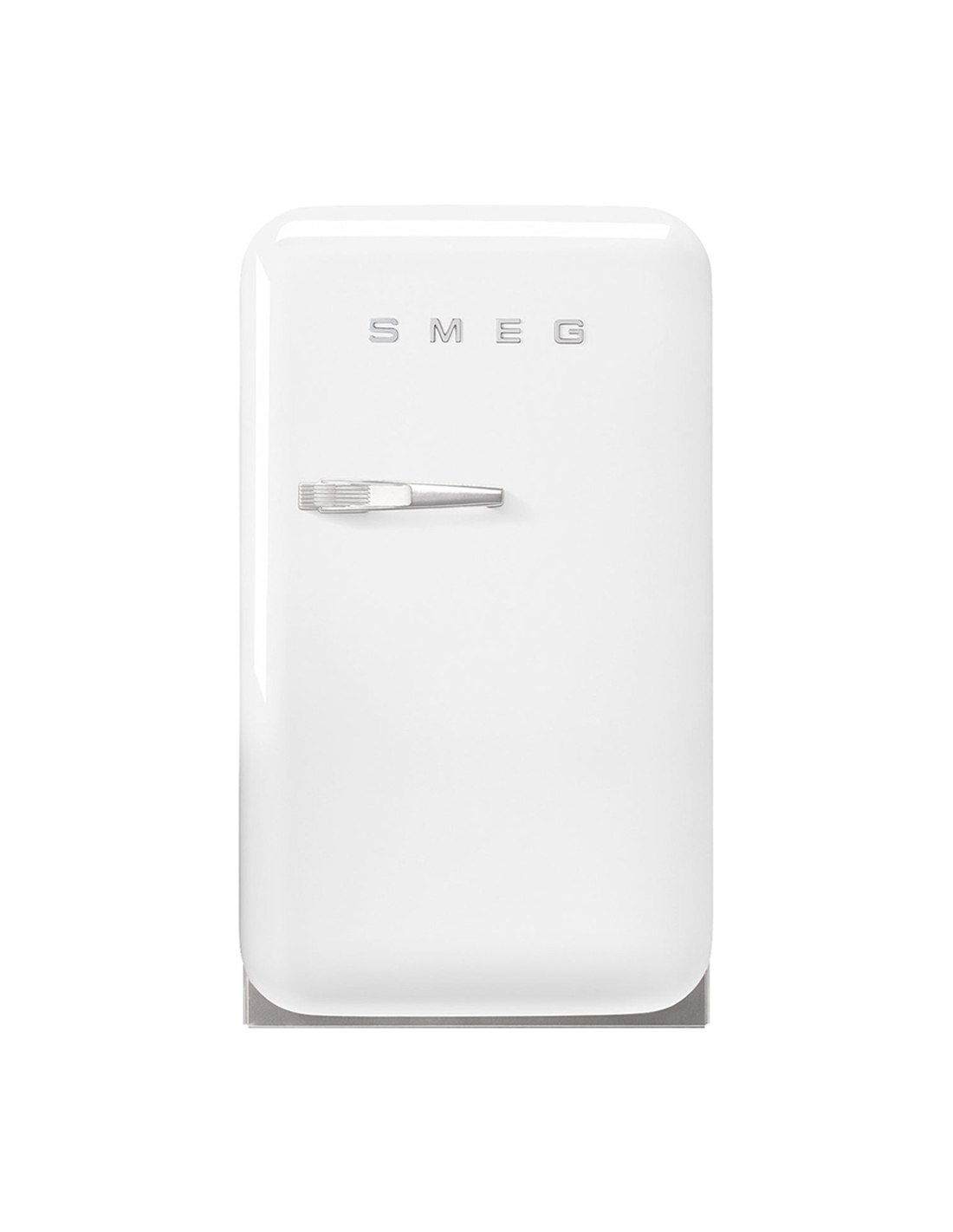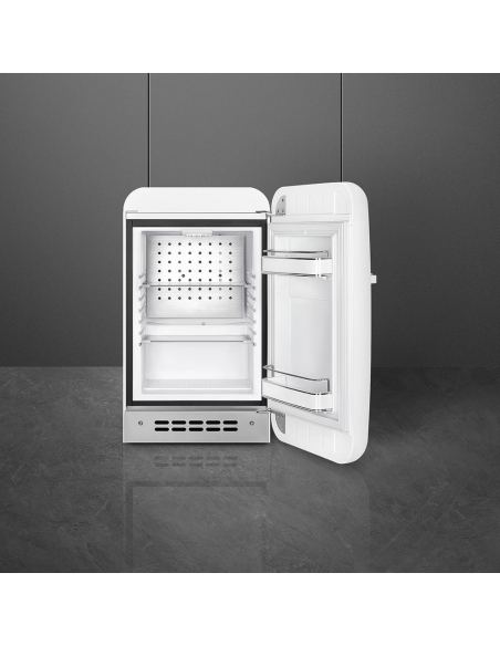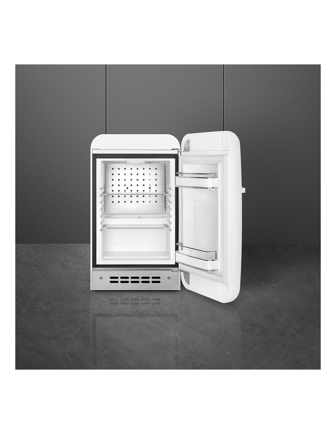Mini frigo monoporta libera installazione 50’ Style bianco lucido. Design bombato. Posizione cerniera porta sinistra. Sistema di sbrinamento automatico. Illuminazione interna a Led. Completo di 2 ripiani regolabili in cristallo, 1 balconcino regolabile, 1 mensola portabottiglie.
