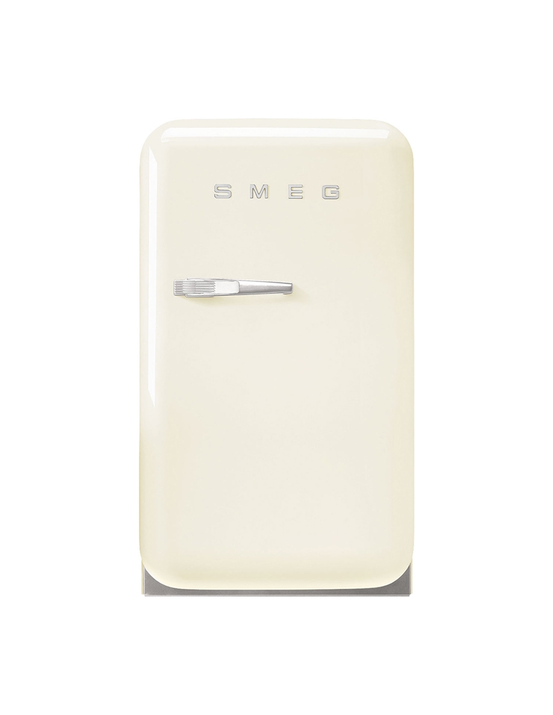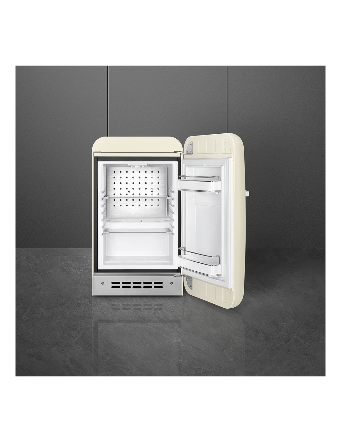 Mini frigo monoporta libera installazione 50’ Style panna lucido. Design bombato. Posizione cerniera porta sinistra. Sistema di sbrinamento automatico. Illuminazione interna a Led. Completo di 2 ripiani regolabili in cristallo, 1 balconcino regolabile, 1 mensola portabottiglie.
