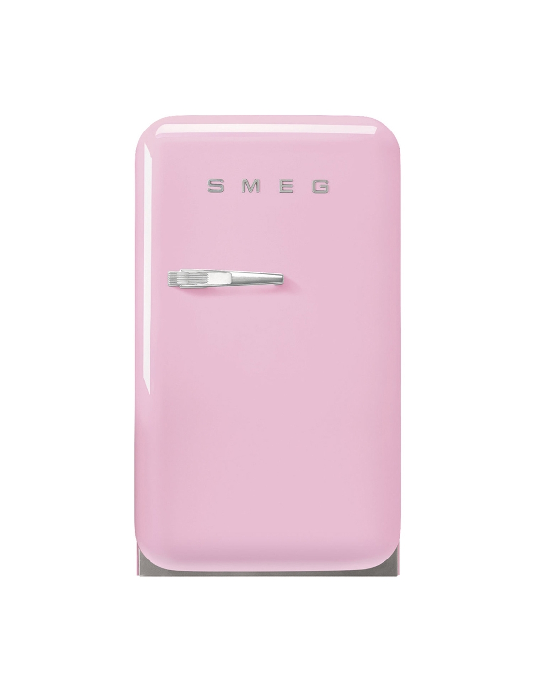 Mini frigo monoporta libera installazione 50’ Style rosa lucido. Design bombato. Posizione cerniera porta sinistra. Sistema di sbrinamento automatico. Illuminazione interna a Led. Completo di 2 ripiani regolabili in cristallo, 1 balconcino regolabile, 1 mensola portabottiglie.