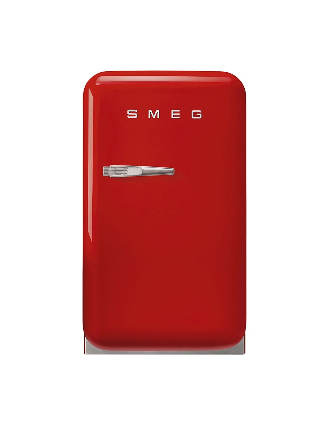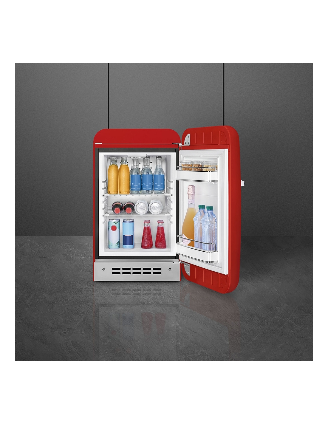 Mini frigo monoporta libera installazione 50’ Style rosso lucido. Design bombato. Posizione cerniera porta sinistra. Sistema di sbrinamento automatico. Illuminazione interna a Led. Completo di 2 ripiani regolabili in cristallo, 1 balconcino regolabile, 1 mensola portabottiglie.