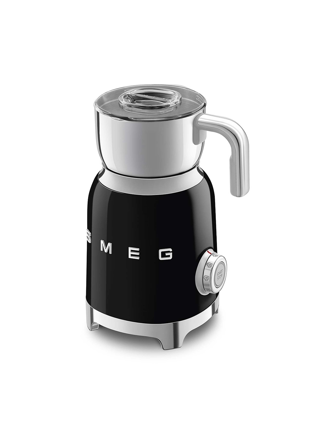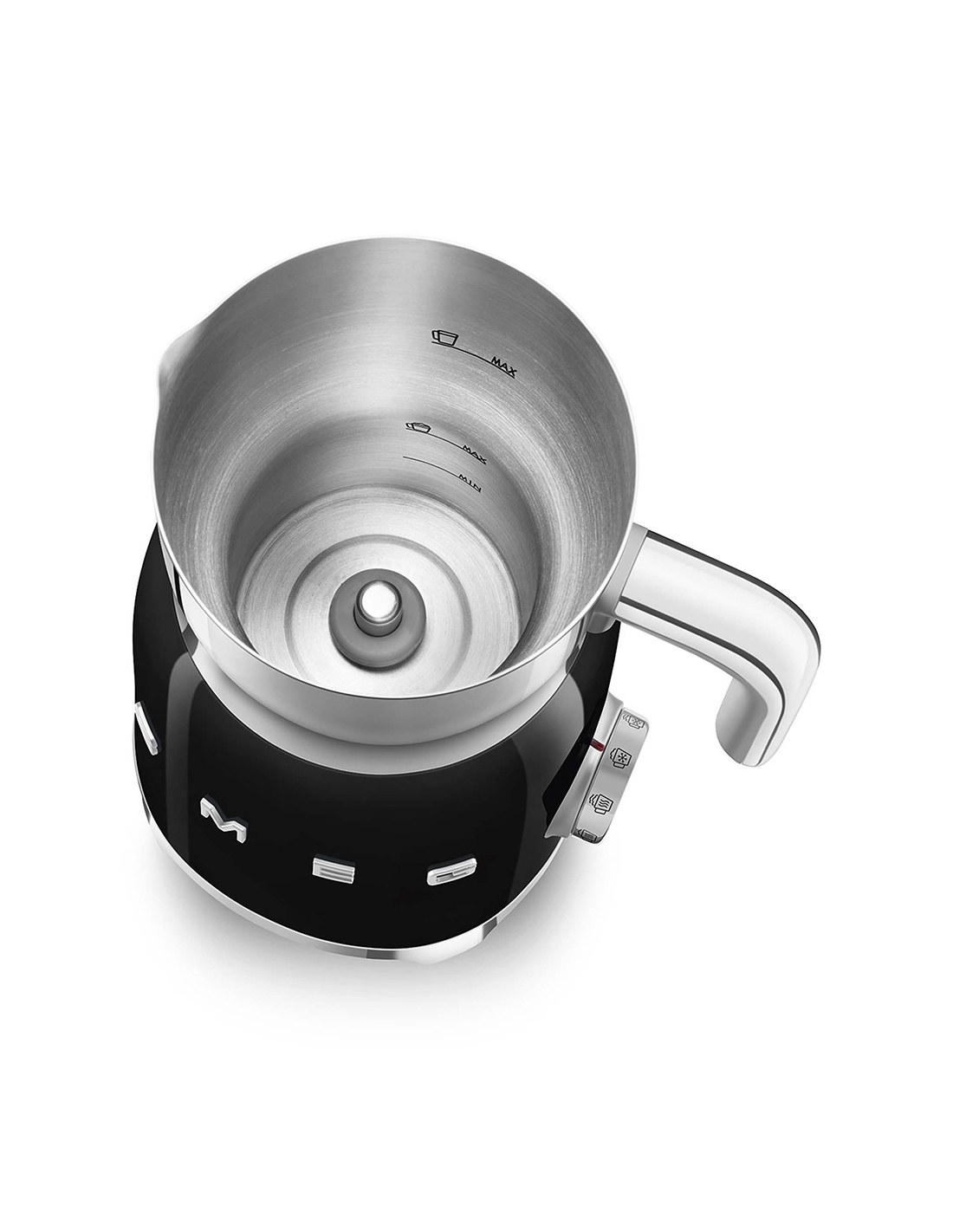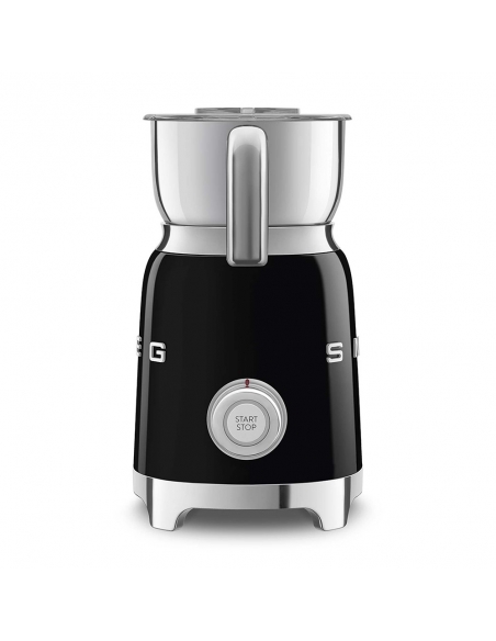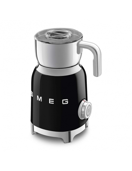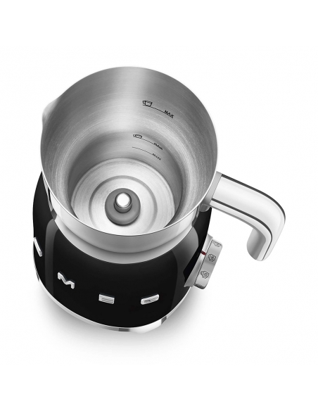 Montalatte a induzione 50’ Style nero lucido. Corpo in acciaio inox, maniglia in plastica e acciaio, base in plastica. Caraffa in acciaio inox con capacità di riscaldamento 600 ml / 2,5 tazze e di montatura latte 250 ml / 1 tazza. In dotazione frusta liscia per funzione latte caldo e frusta dentellata per funzione montalatte. Autospegnimento di sicurezza.