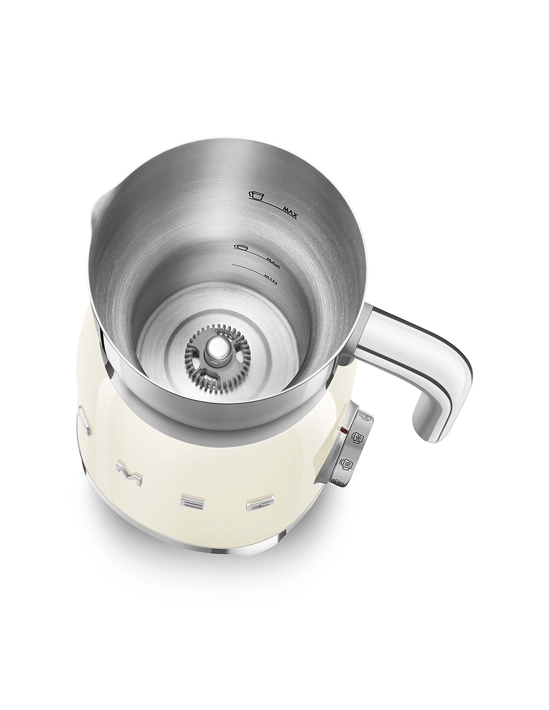 Montalatte a induzione 50’ Style panna lucido. Corpo in acciaio inox, maniglia in plastica e acciaio, base in plastica. Caraffa in acciaio inox con capacità di riscaldamento 600 ml / 2,5 tazze e di montatura latte 250 ml / 1 tazza. In dotazione frusta liscia per funzione latte caldo e frusta dentellata per funzione montalatte. Autospegnimento di sicurezza.