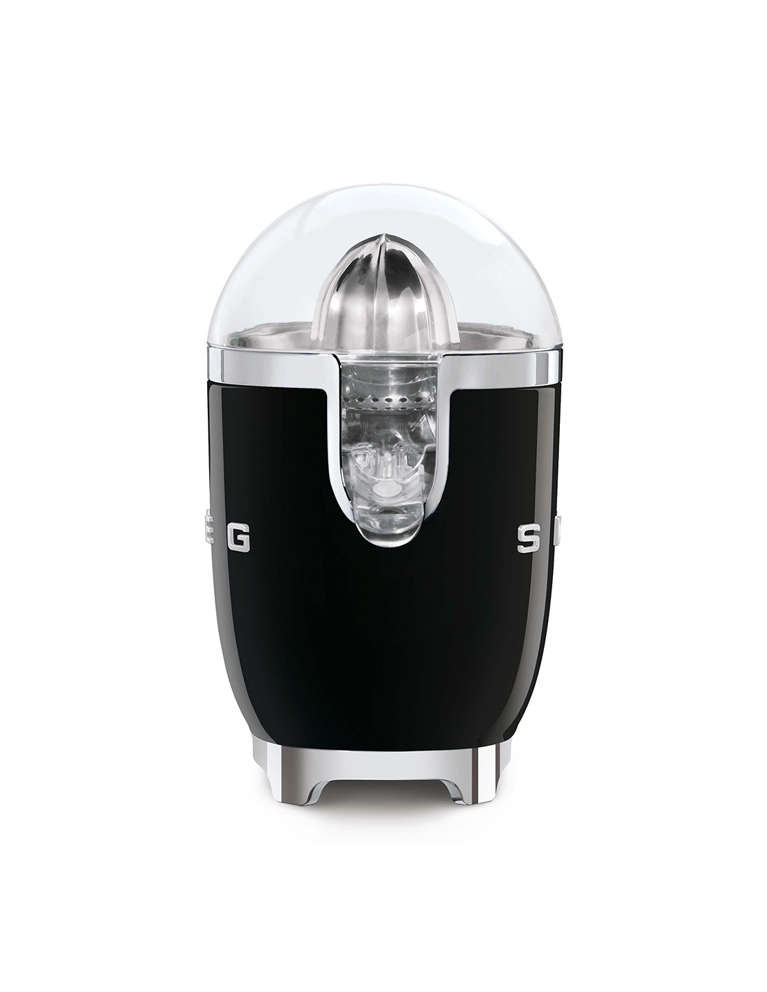 Spremiagrumi 50’ Style nero lucido. Corpo in plastica, beccuccio, filtro e cono in acciaio inox, coperchio e vaschetta in Tritan. Base antiscivolo in plastica. Sistema di spremitura a pressione manuale.