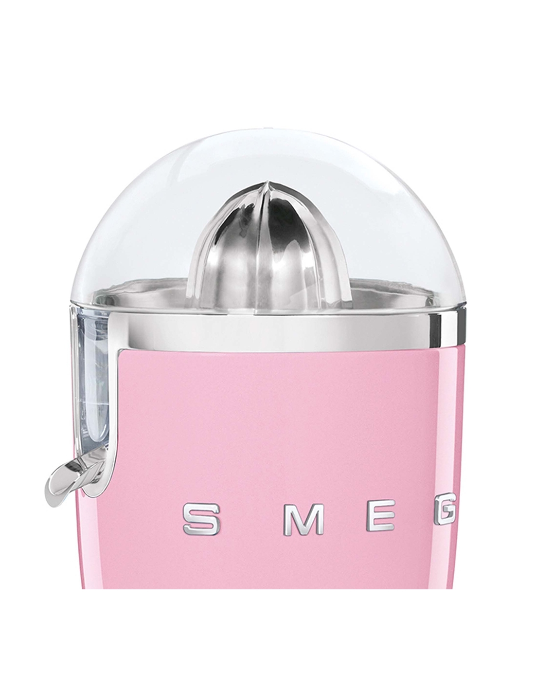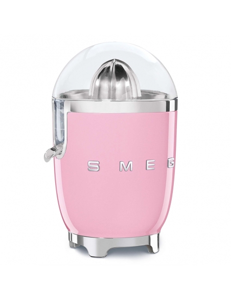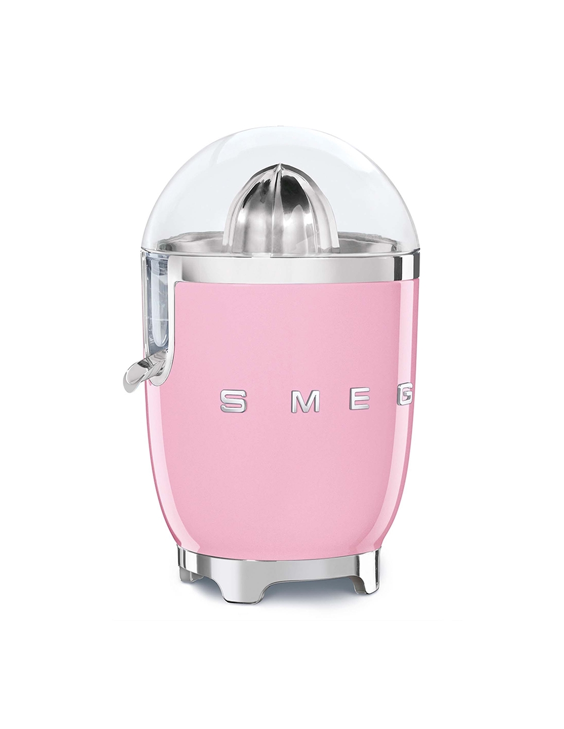Spremiagrumi 50’ Style rosa lucido. Corpo in plastica, beccuccio, filtro e cono in acciaio inox, coperchio e vaschetta in Tritan. Base antiscivolo in plastica. Sistema di spremitura a pressione manuale.