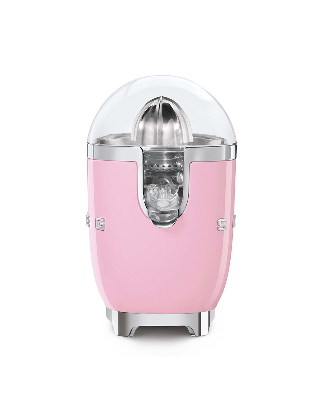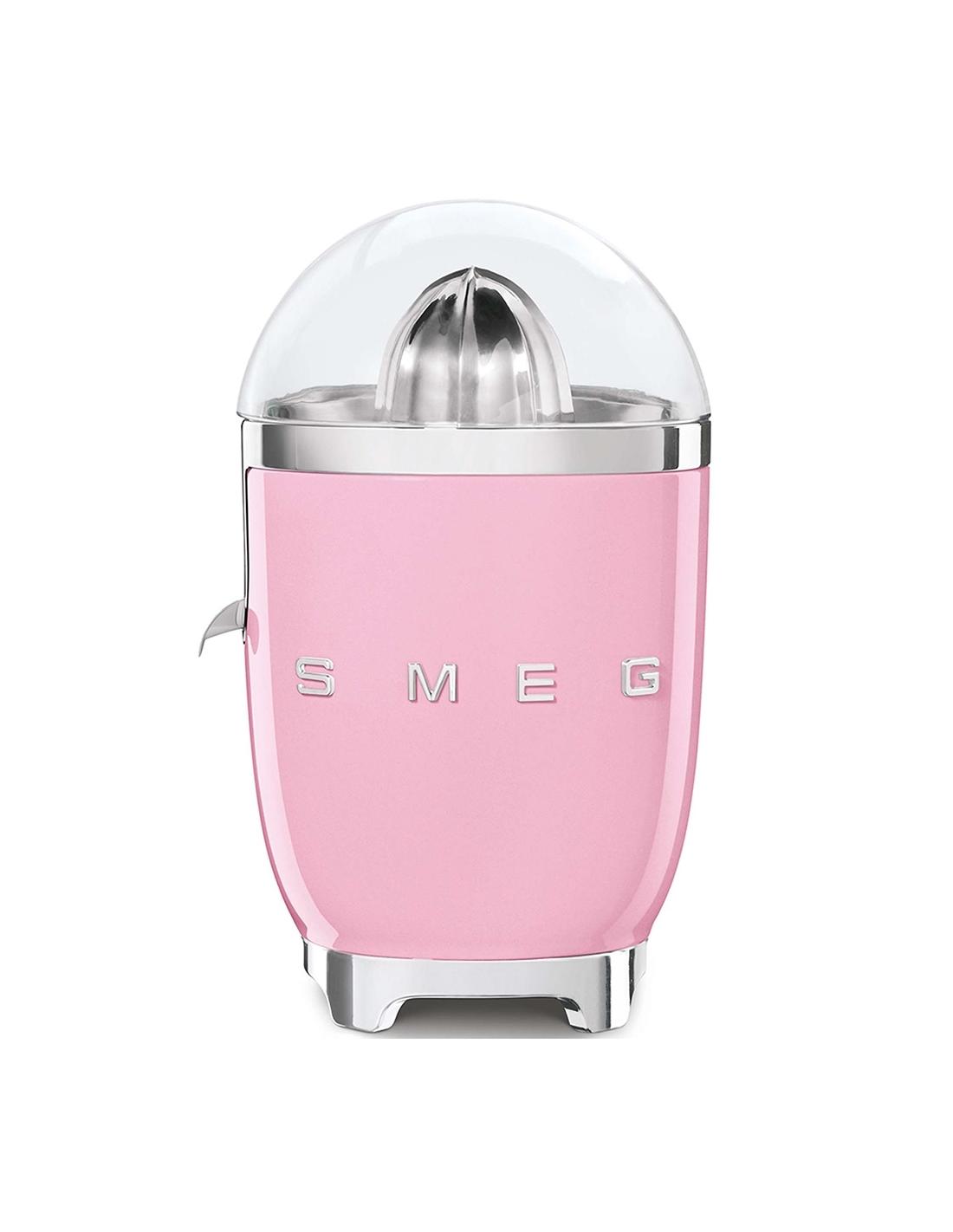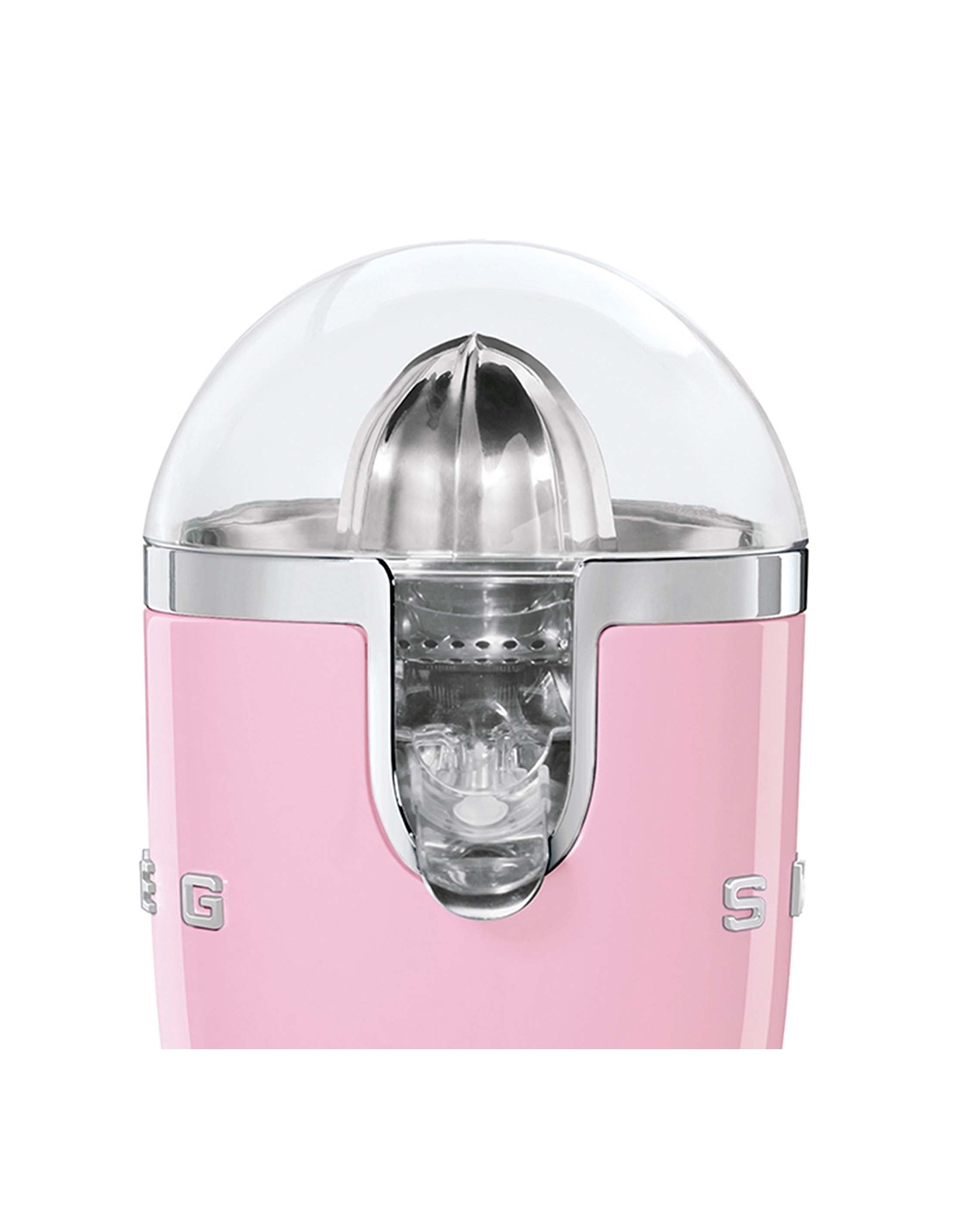 Spremiagrumi 50’ Style rosa lucido. Corpo in plastica, beccuccio, filtro e cono in acciaio inox, coperchio e vaschetta in Tritan. Base antiscivolo in plastica. Sistema di spremitura a pressione manuale.