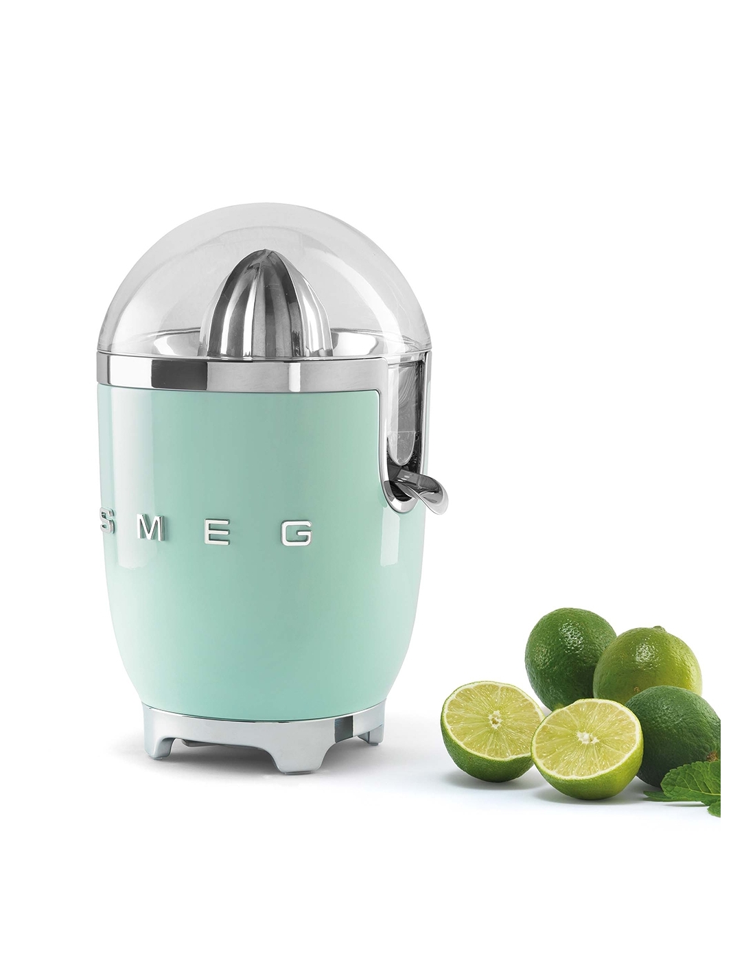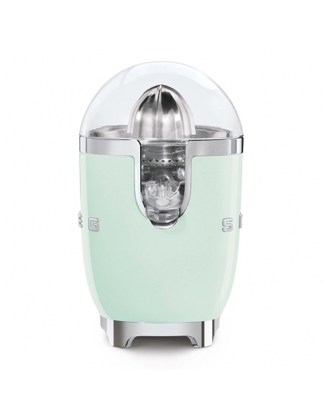 Spremiagrumi 50’ Style verde lucido. Corpo in plastica, beccuccio, filtro e cono in acciaio inox, coperchio e vaschetta in Tritan. Base antiscivolo in plastica. Sistema di spremitura a pressione manuale.