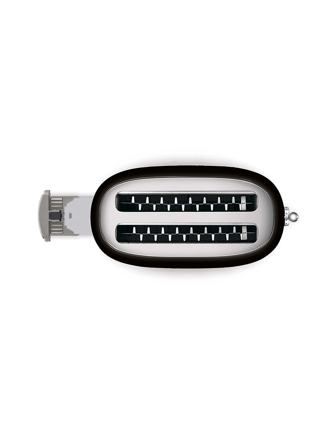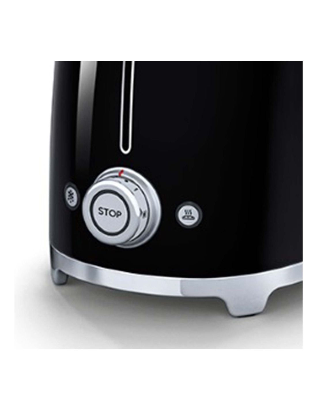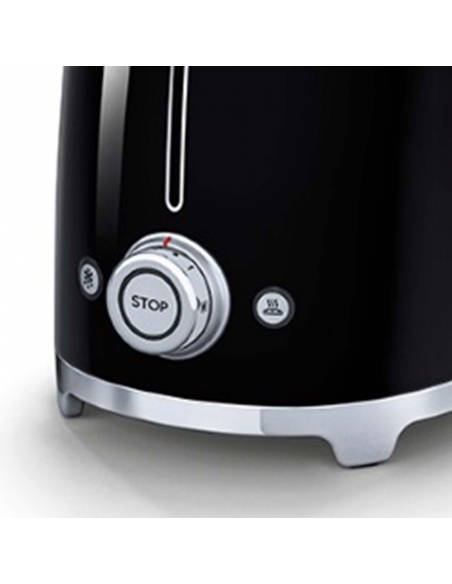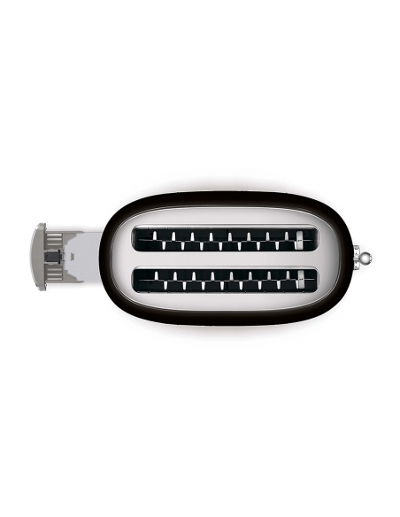 Tostapane 2x2 fette 50’ Style nero lucido. Corpo e top in acciaio inox, base antiscivolo in plastica. Cassettino raccoglibriciole in acciaio inox. Attivazione con leva a scorrimento. Pulsanti e manopola retroilluminati. Lunghezza scomparto 36 cm. 6 livelli di brunitura e 3 diverse funzioni: riscaldamento, scongelamento e bagel. Espulsione automatica a fine ciclo.