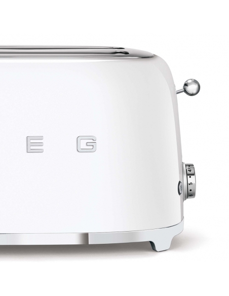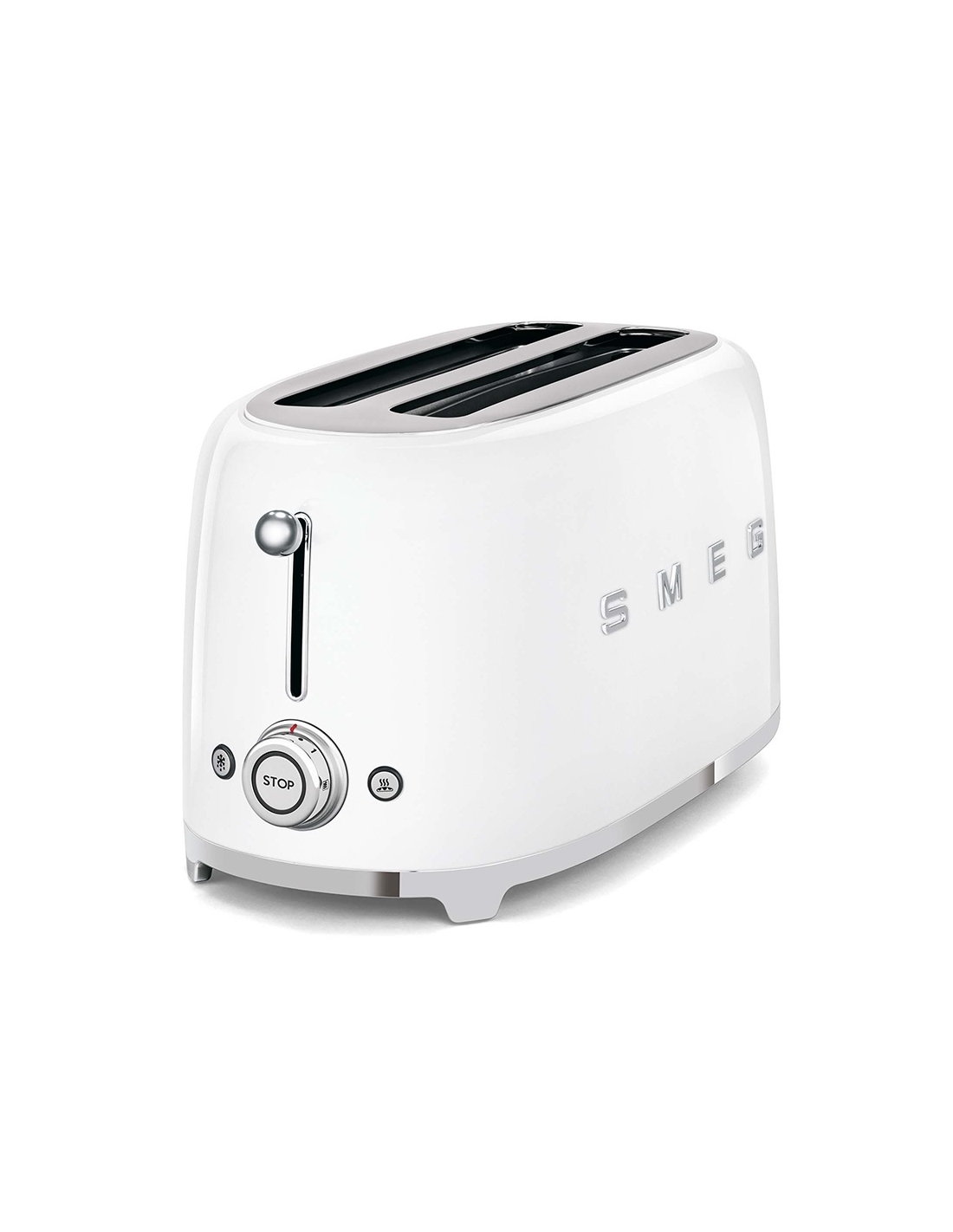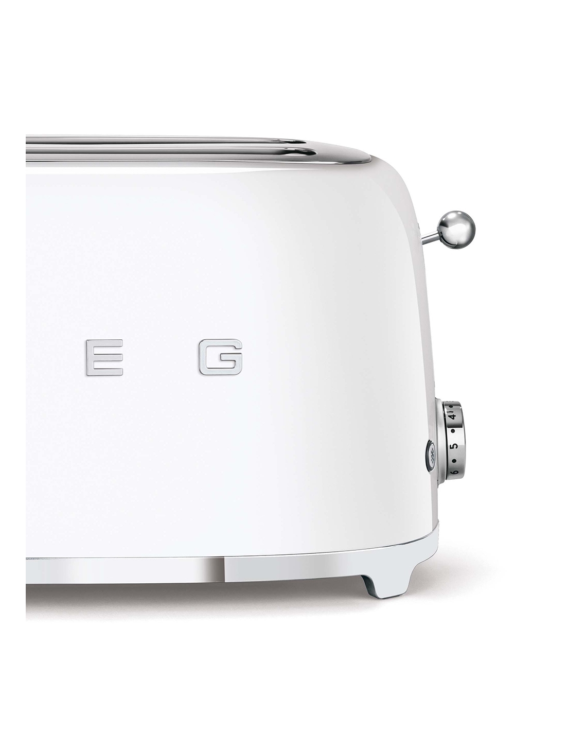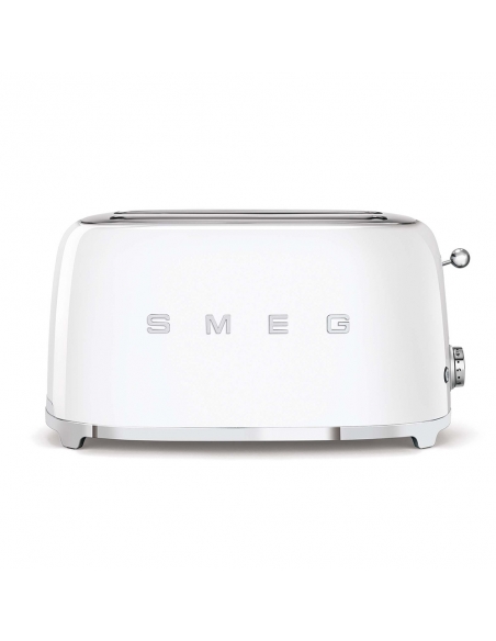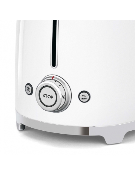 Tostapane 4x2 fette 50’ Style bianco lucido. Corpo e top in acciaio inox, base antiscivolo in plastica. Cassettino raccoglibriciole in acciaio inox. Attivazione con leva a scorrimento. Pulsanti e manopola retroilluminati. Lunghezza scomparto 36 cm. 6 livelli di brunitura e 3 diverse funzioni: riscaldamento, scongelamento e bagel. Espulsione automatica a fine ciclo.