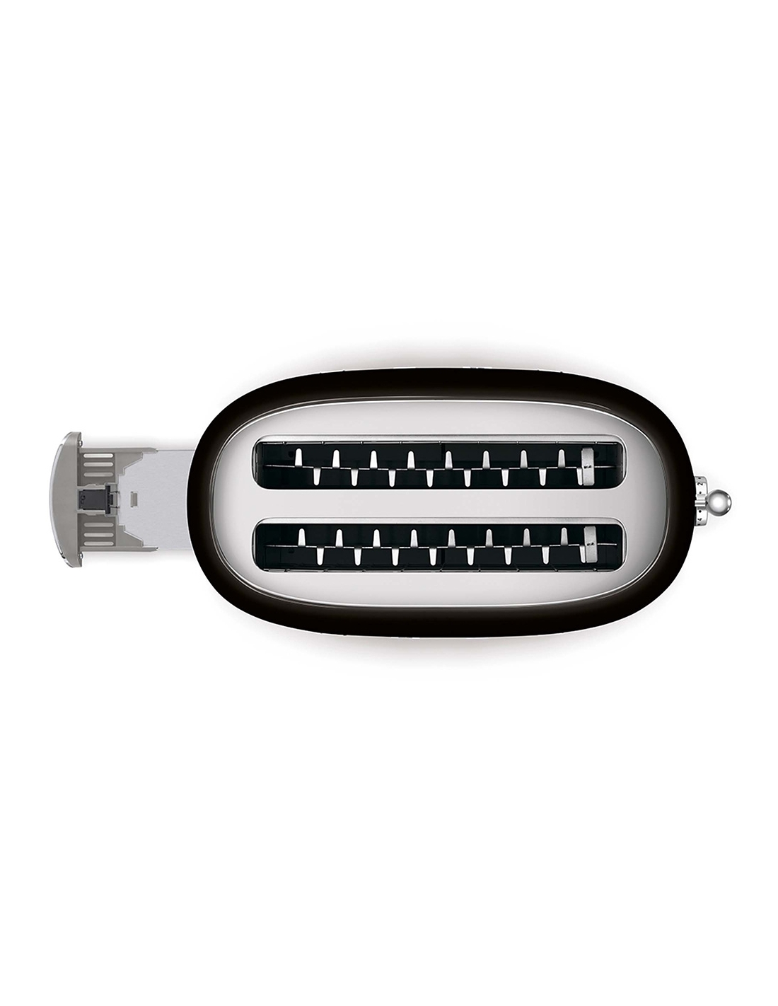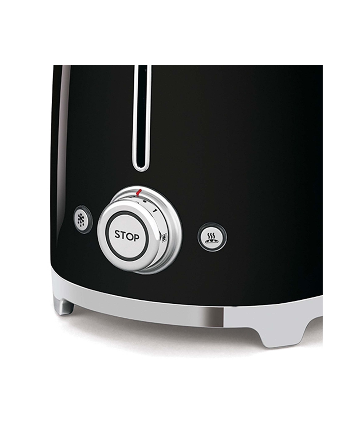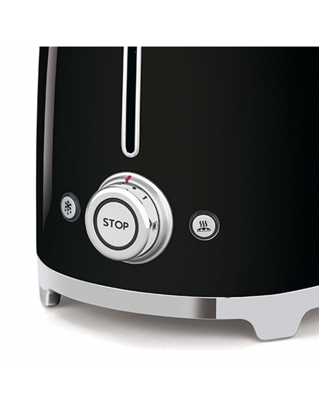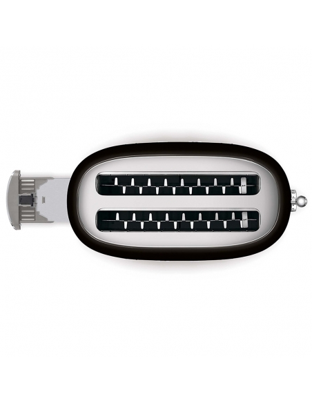 Tostapane 4x2 fette 50’ Style nero lucido. Corpo e top in acciaio inox, base antiscivolo in plastica. Cassettino raccoglibriciole in acciaio inox. Attivazione con leva a scorrimento. Pulsanti e manopola retroilluminati. Lunghezza scomparto 36 cm. 6 livelli di brunitura e 3 diverse funzioni: riscaldamento, scongelamento e bagel. Espulsione automatica a fine ciclo.