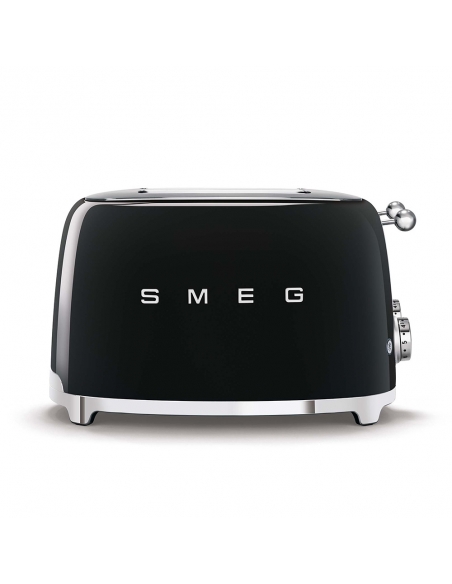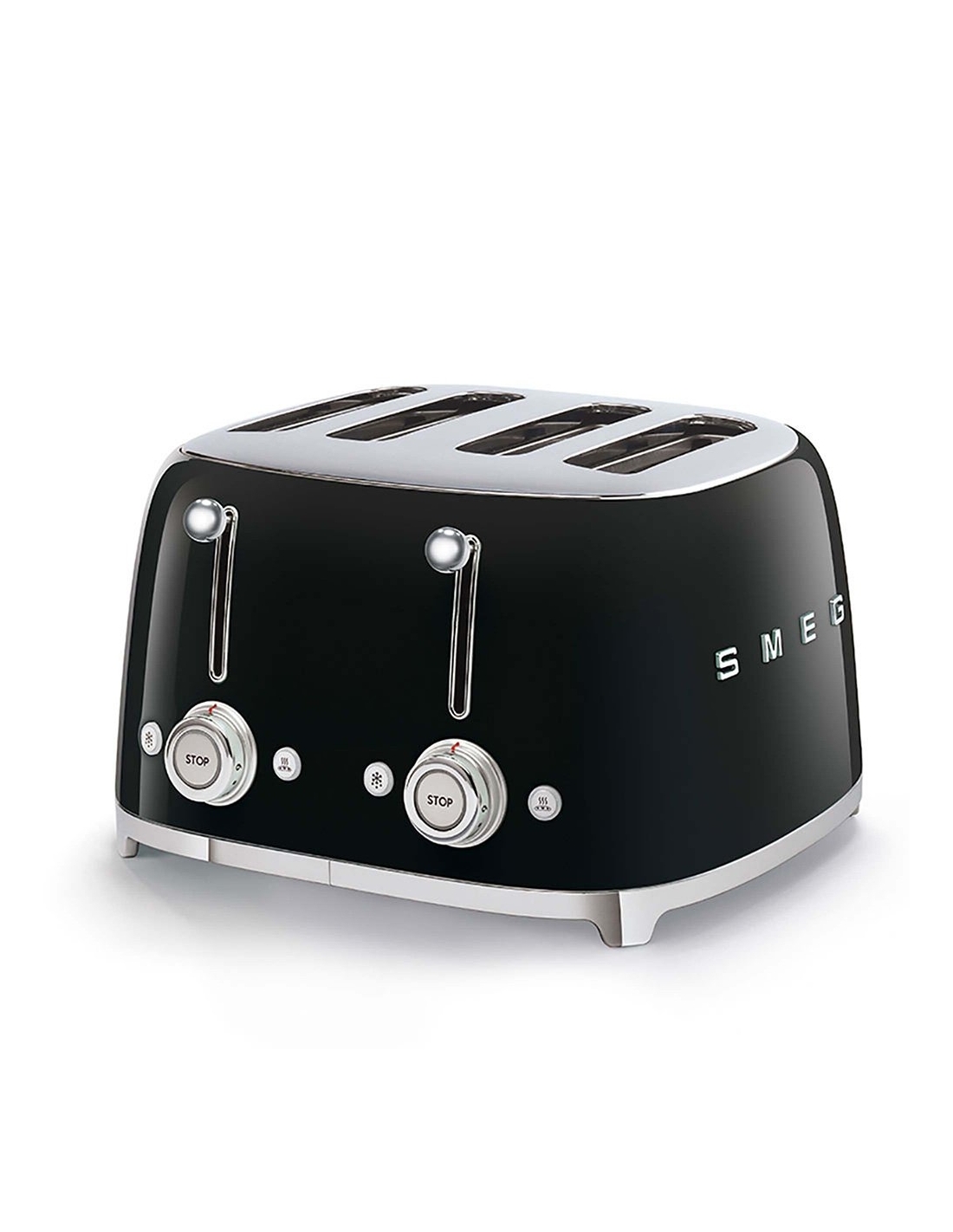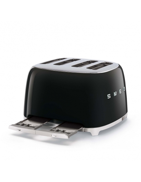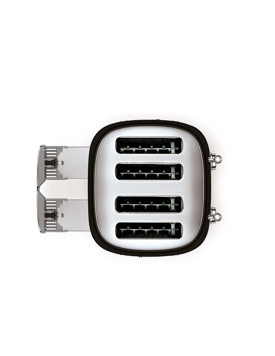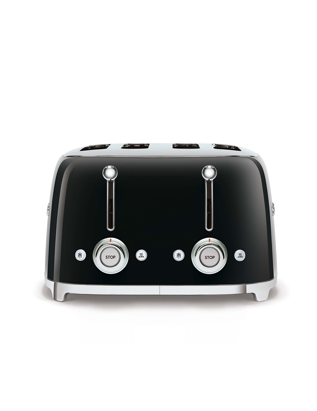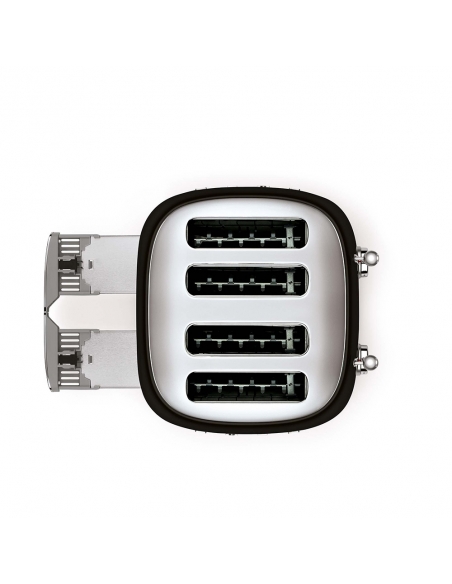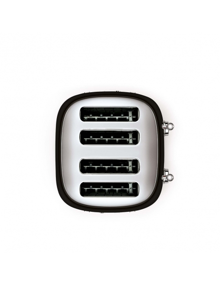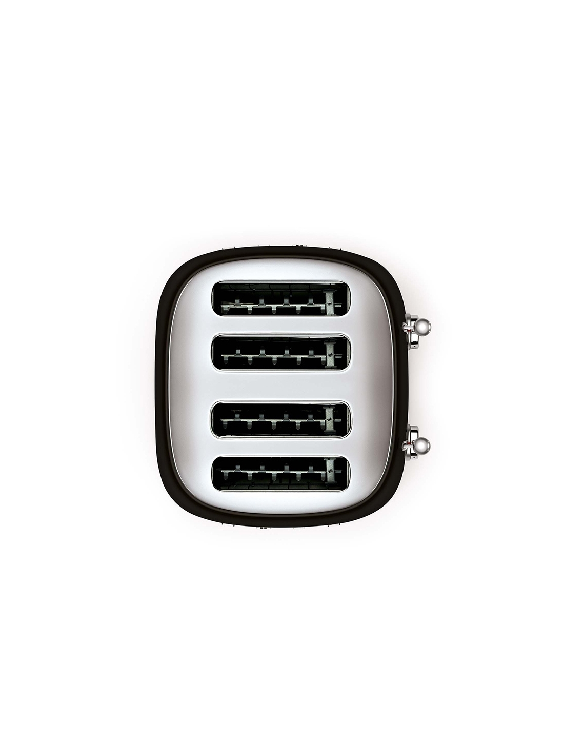 Tostapane 4x4 fette 50’ Style nero lucido. Corpo e top in acciaio inox, base antiscivolo in plastica. Doppio cassettino raccoglibriciole in acciaio inox lucido. Doppi comandi. Attivazione con leva a scorrimento. Pulsanti e manopola retroilluminati. Doppia coppia scomparti indipendenti. Lunghezza scomparto 36 cm. 6 livelli di brunitura e 3 diverse funzioni: riscaldamento, scongelamento e bagel. Espulsione automatica a fine ciclo.