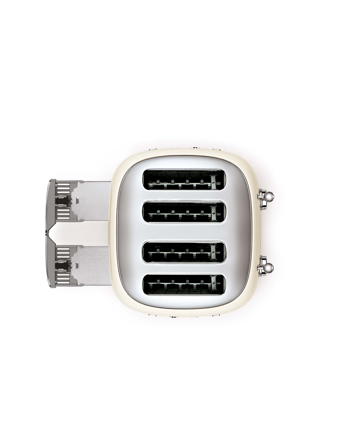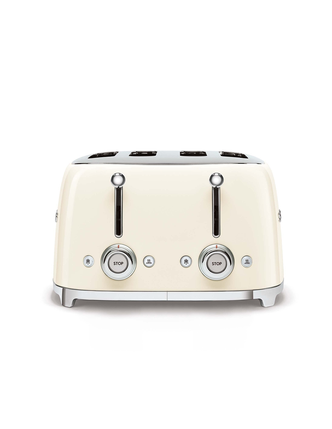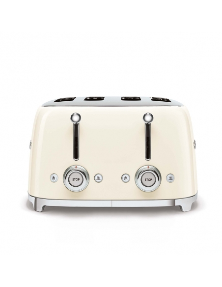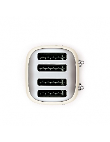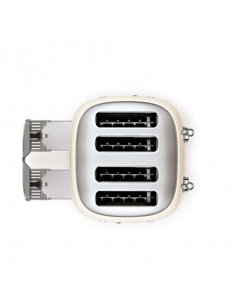 Tostapane 4x4 fette 50’ Style panna lucido. Corpo e top in acciaio inox, base antiscivolo in plastica. Doppio cassettino raccoglibriciole in acciaio inox lucido. Doppi comandi. Attivazione con leva a scorrimento. Pulsanti e manopola retroilluminati. Doppia coppia scomparti indipendenti. Lunghezza scomparto 36 cm. 6 livelli di brunitura e 3 diverse funzioni: riscaldamento, scongelamento e bagel. Espulsione automatica a fine ciclo.