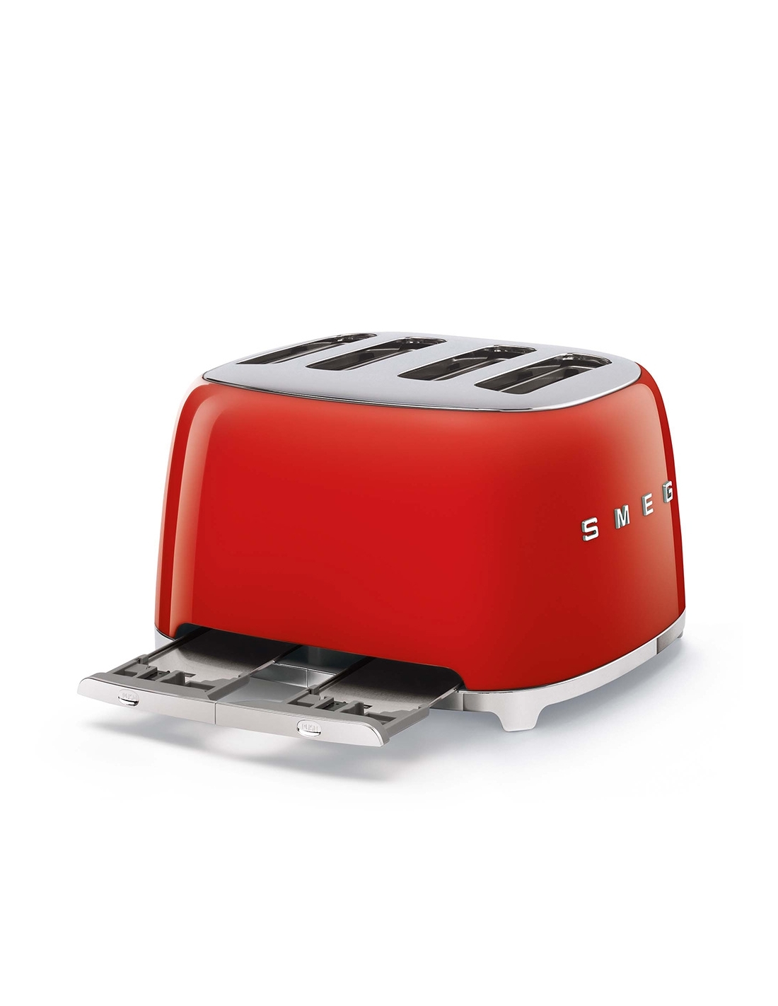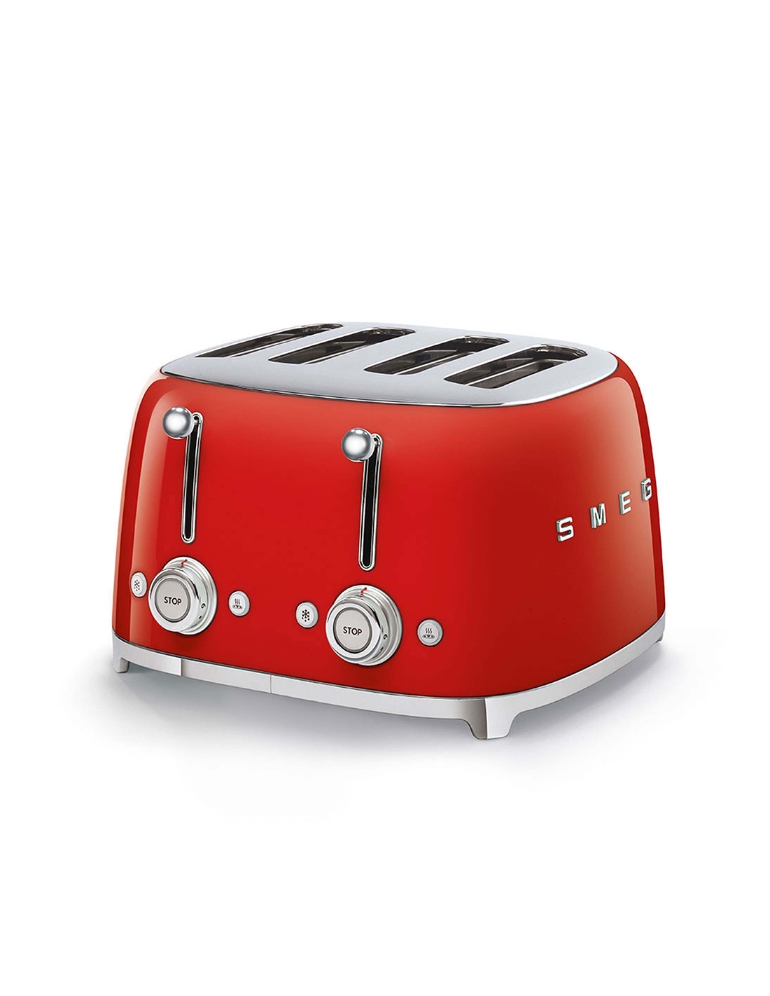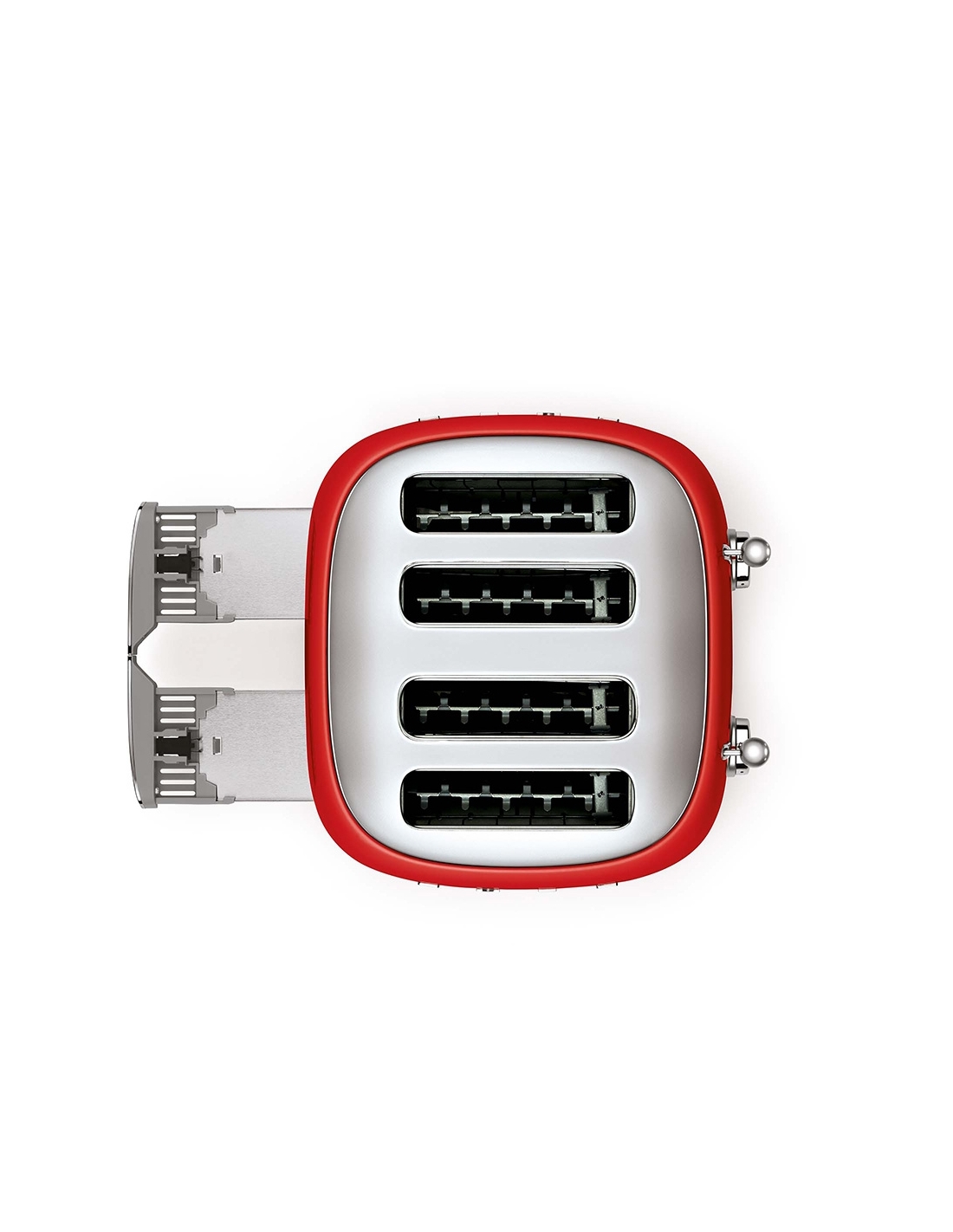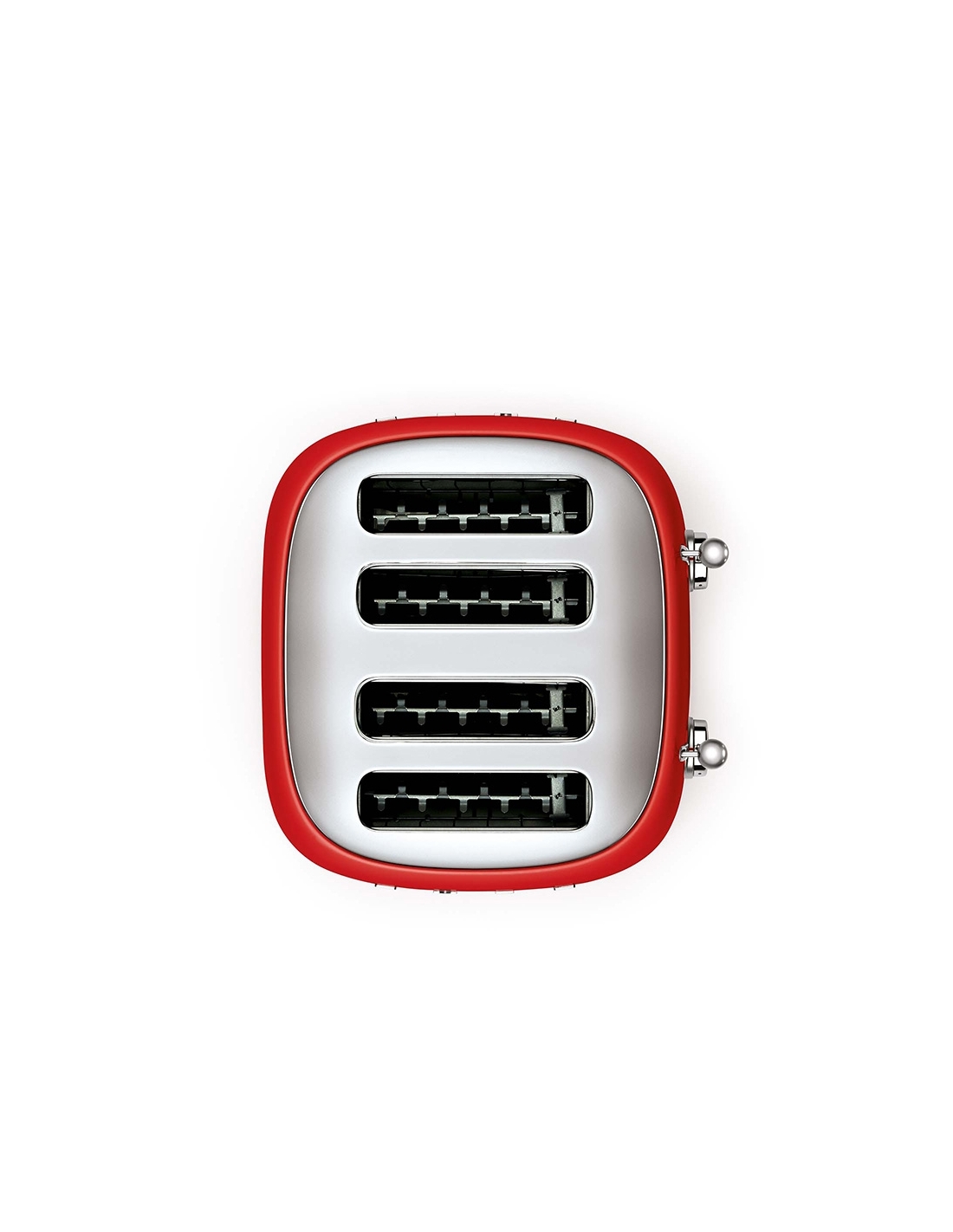 Tostapane 4x4 fette 50’ Style rosso lucido. Corpo e top in acciaio inox, base antiscivolo in plastica. Doppio cassettino raccoglibriciole in acciaio inox lucido. Doppi comandi. Attivazione con leva a scorrimento. Pulsanti e manopola retroilluminati. Doppia coppia scomparti indipendenti. Lunghezza scomparto 36 cm. 6 livelli di brunitura e 3 diverse funzioni: riscaldamento, scongelamento e bagel. Espulsione automatica a fine ciclo.