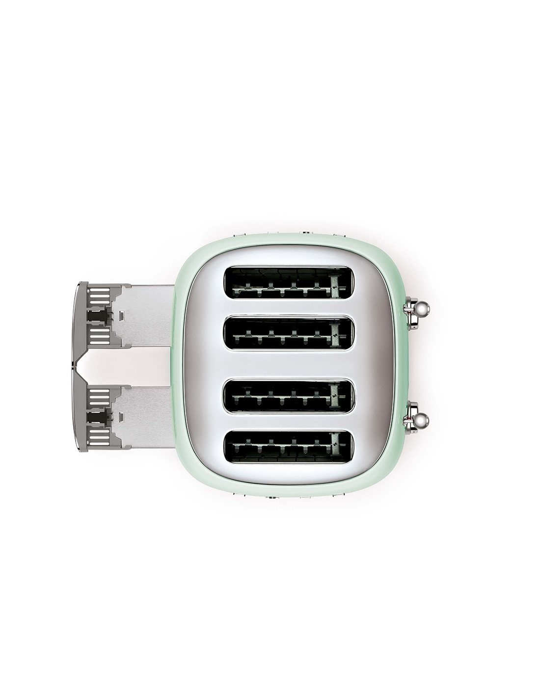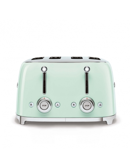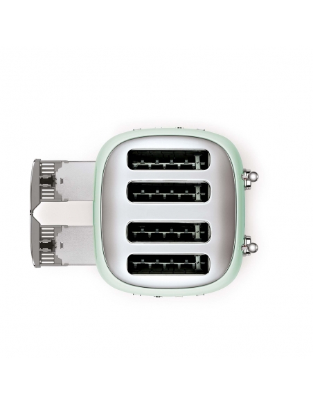 Tostapane 4x4 fette 50’ Style verde lucido. Corpo e top in acciaio inox, base antiscivolo in plastica. Doppio cassettino raccoglibriciole in acciaio inox lucido. Doppi comandi. Attivazione con leva a scorrimento. Pulsanti e manopola retroilluminati. Doppia coppia scomparti indipendenti. Lunghezza scomparto 36 cm. 6 livelli di brunitura e 3 diverse funzioni: riscaldamento, scongelamento e bagel. Espulsione automatica a fine ciclo.