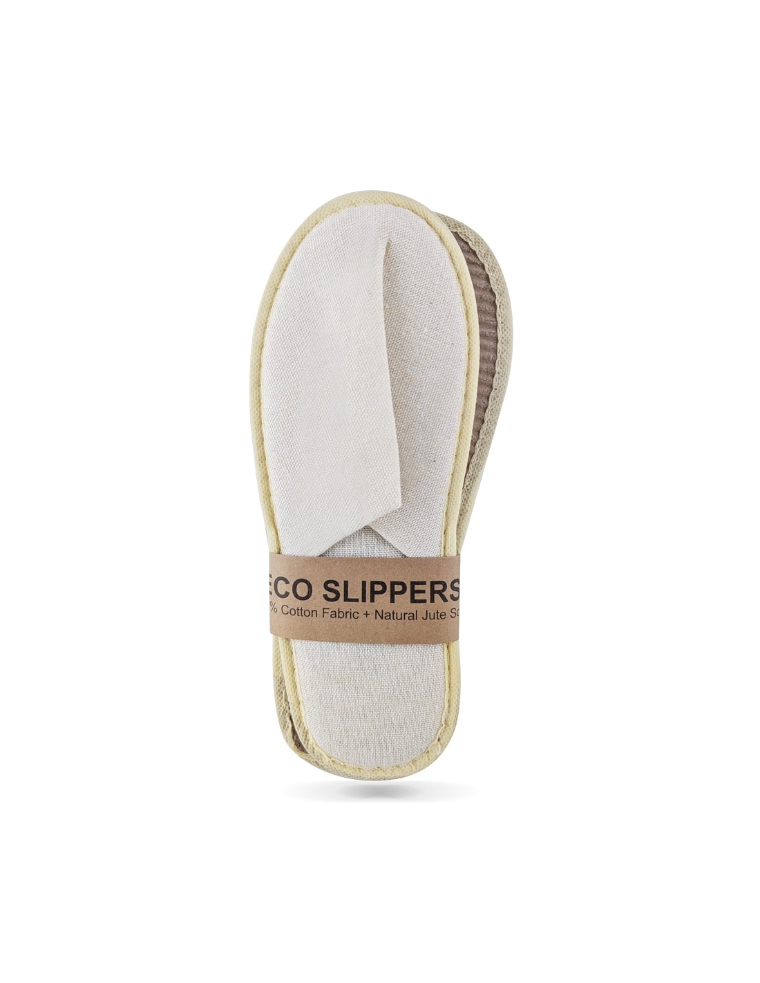 Ciabatte ecologiche per hotel in tela di cotone beige naturale, con tomaia da 165 g imbottita con 3 mm di spugna, controtomaia in TNT da 40 g, soletta interna in tela da 165 g con 3 mm di spugna e 5 mm di cuscinetto, orlo in TNT beige e suola leggera in polpa di carta ondulata da 30 g. Misura unisex 29 cm (tg. 41–42), confezionate singolarmente con fascetta eco-pack in cartoncino da 120 g, ideali per strutture ricettive attente alla sostenibilità.