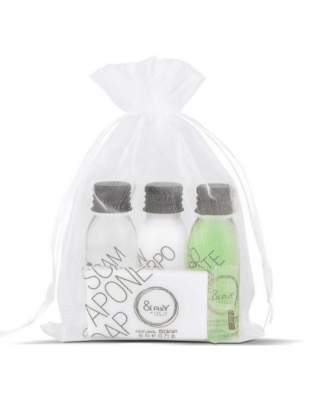 Sacchetto in organza bianca 12x15 cm. Sacchetto ideale per set cortesia hotel e per starter kit. Fornito vuoto steso.