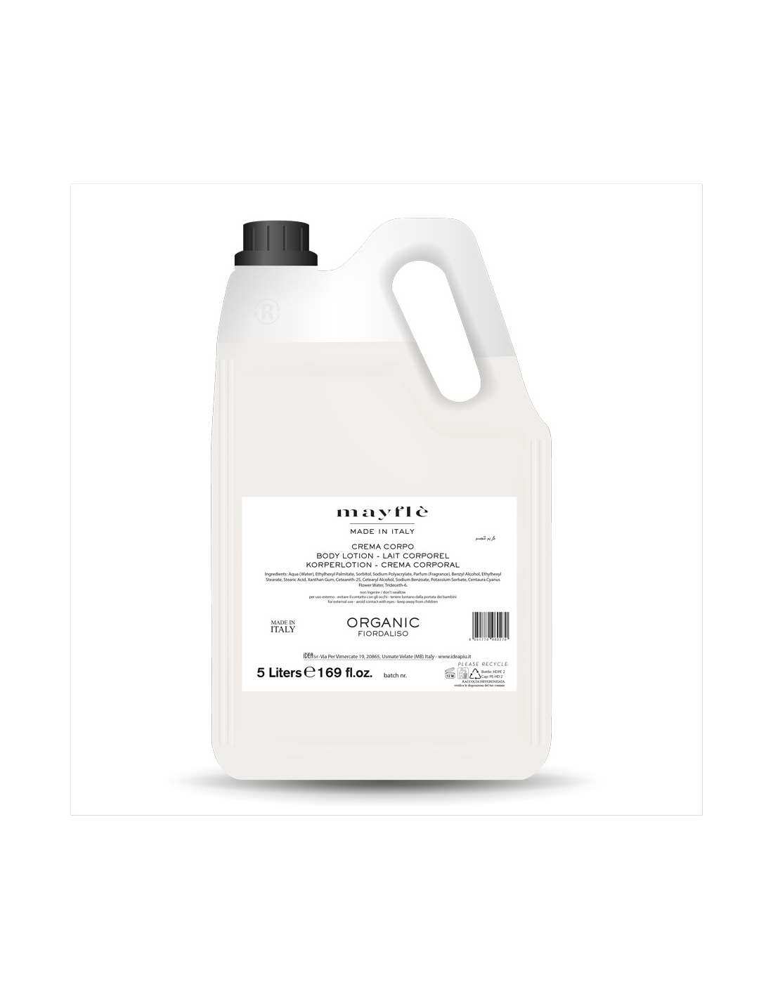 Tanica da 5 litri contenente crema corpo. Prodotto per corpo. Cosmetico con soluzione a Fiordaliso. Tanica utilizzabile come ricarica per dispenser articolo 3946.