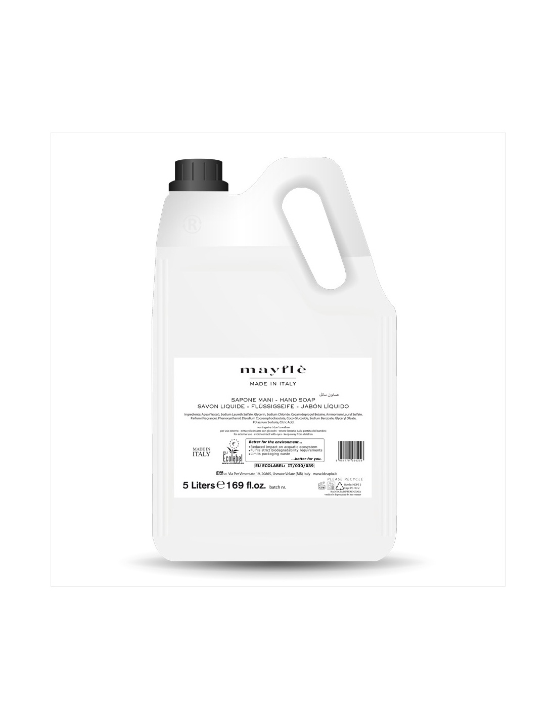 Tanica da 5 litri contenente sapone liquido. Prodotto per mani, certificato ECOLABEL. Cosmetico con soluzione a Fiordaliso. Tanica utilizzabile come ricarica per dispenser articolo 3944.