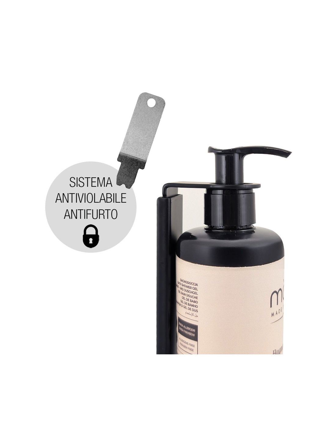 Supporto murale inox satinato per dispenser da 300 ml. Supporto dotato di sistema antifurto con chiave di sblocco. La ghiera superiore blocca la pompetta rendendo il flacone inviolabile (l'ospite non lo può aprire o manomettere il contenuto).
