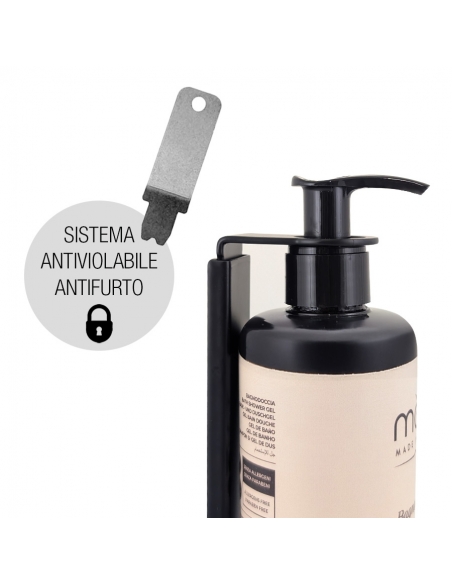 Supporto murale inox nero per dispenser da 300 ml. . Supporto dotato di sistema antifurto con chiave di sblocco. La ghiera superiore blocca la pompetta rendendo il flacone inviolabile (l'ospite non lo può aprire o manomettere il contenuto).