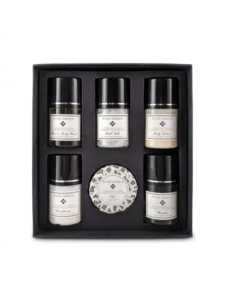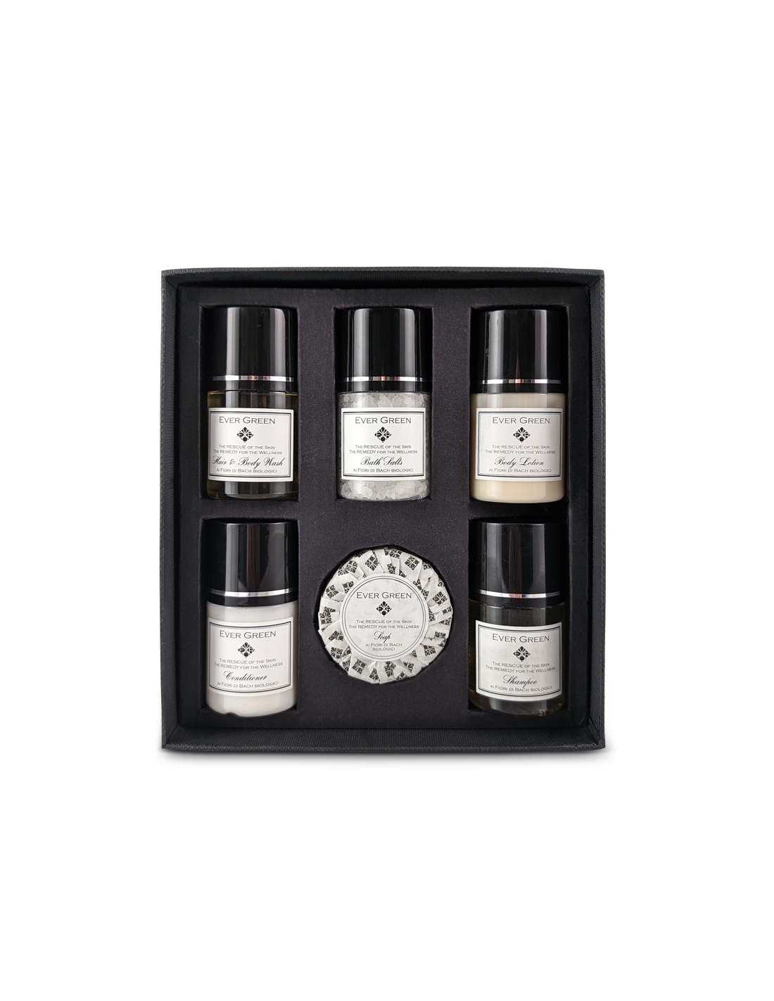 Tutti i prodotti del set cosmetico in cofanetto Evergreen Vip sono formulati per offrire un’esperienza di benessere completa, arricchiti con preziosi estratti ai fiori di Bach che agiscono in sinergia per ristabilire equilibrio e serenità. Prodotto perfetto per offrire agli ospiti un momento di elegante benessere.